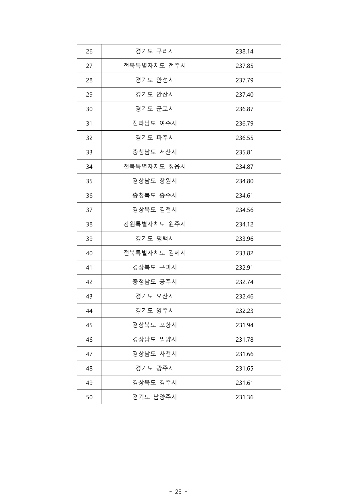 경기도 내 지자체 순위를 상위 15위까지 살펴보면 화성시-수원시-이천시-성남시-과천시-하남시-여주시-김포시-시흥시-안양시-의왕시-포천시-광명시-구리시-안성시 순으로 나타났다.