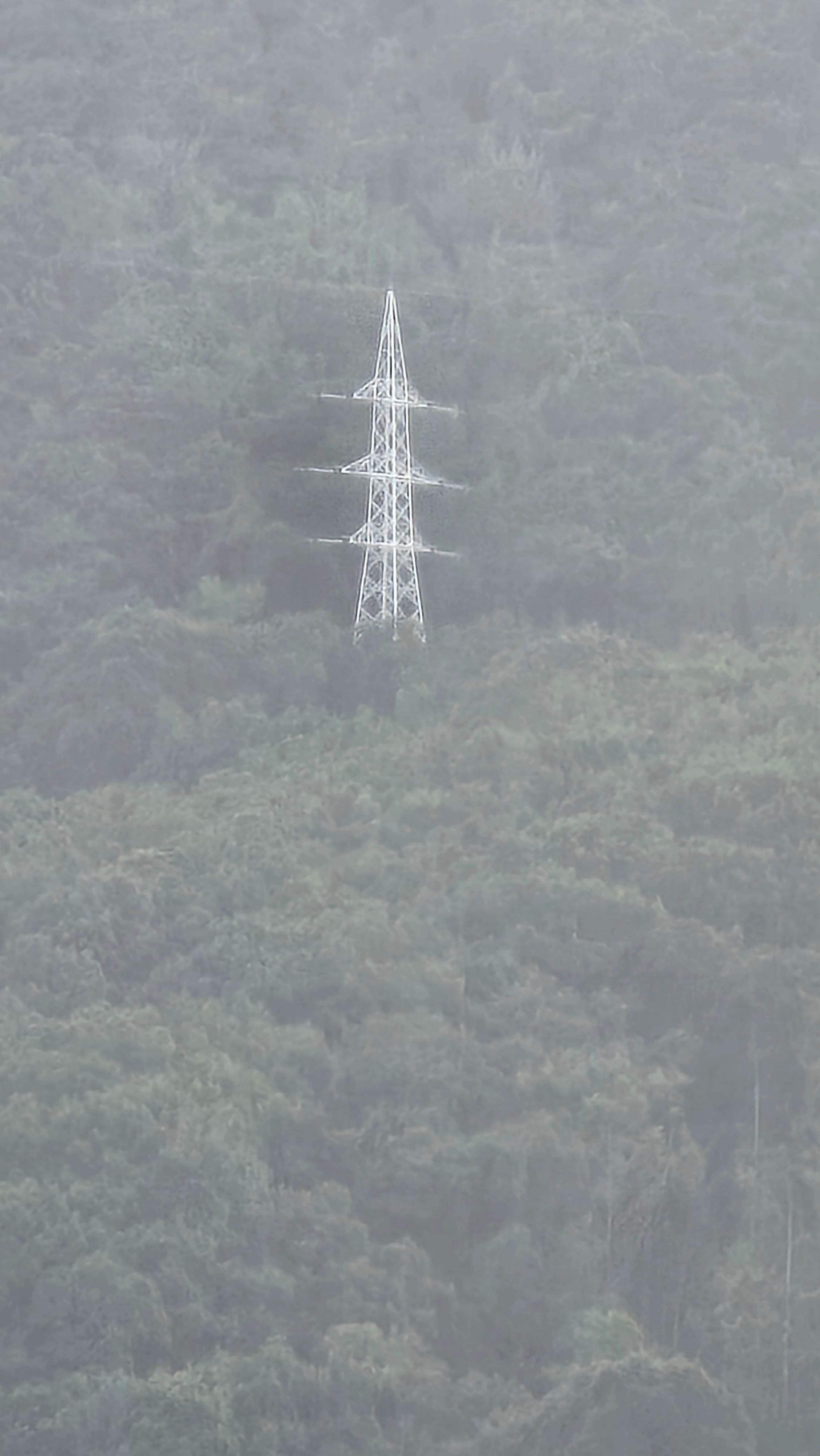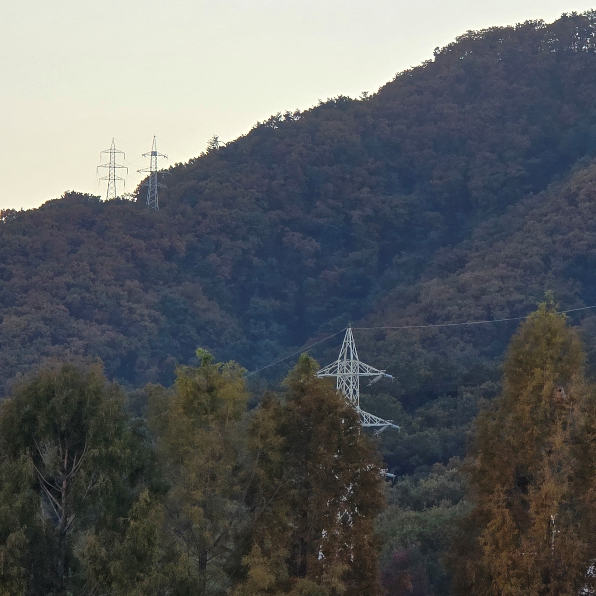 2025.09.11/ #도시기록 #안양 #수리산 #송전탑/ 안양시 만안구 안양6동에 자리한 안양변전소에 전력을 공급하기 위해 수리신 자락에 세워진 송전탑. 안양변전소는 안양4동 수암천변에 있던 옛 시흥군 최초의 안양변전소(since1928)가 1970년대 무렵 이전해 자리잡았다. 외부에 노출돼 있던 전력 변전시설이 옥내 건물로 모두 들어가 여기가 변전소인지 모를 정도다.