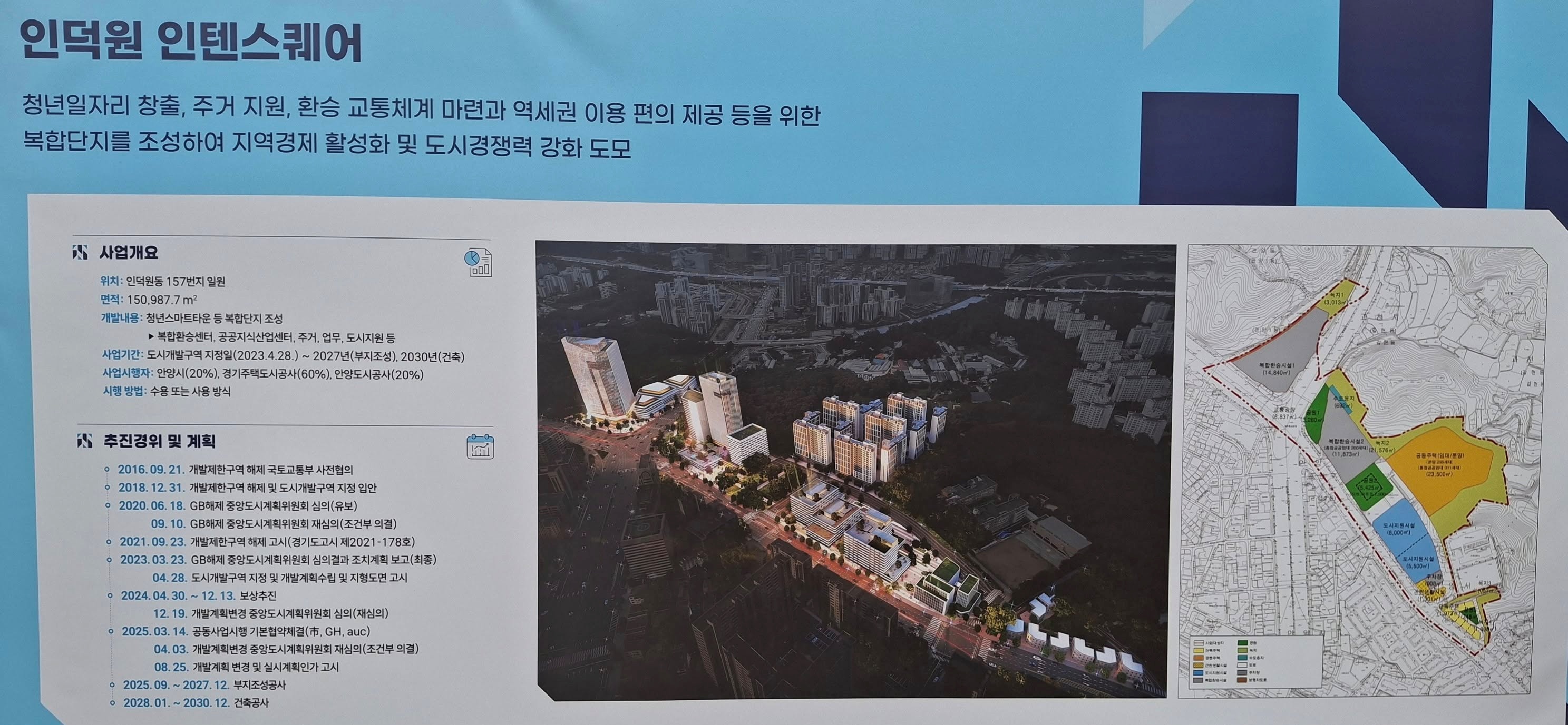 인덕원 주변 도시개발사업은 안양시 동안구 인덕원동 157번지 일원 약 15만987㎡ 부지에 오는 2030년까지 복합환승시설, 공동주택, 공공지식산업센터, 공공시설, 근린생활시설 등을 조성하는 대규모 프로젝트다.