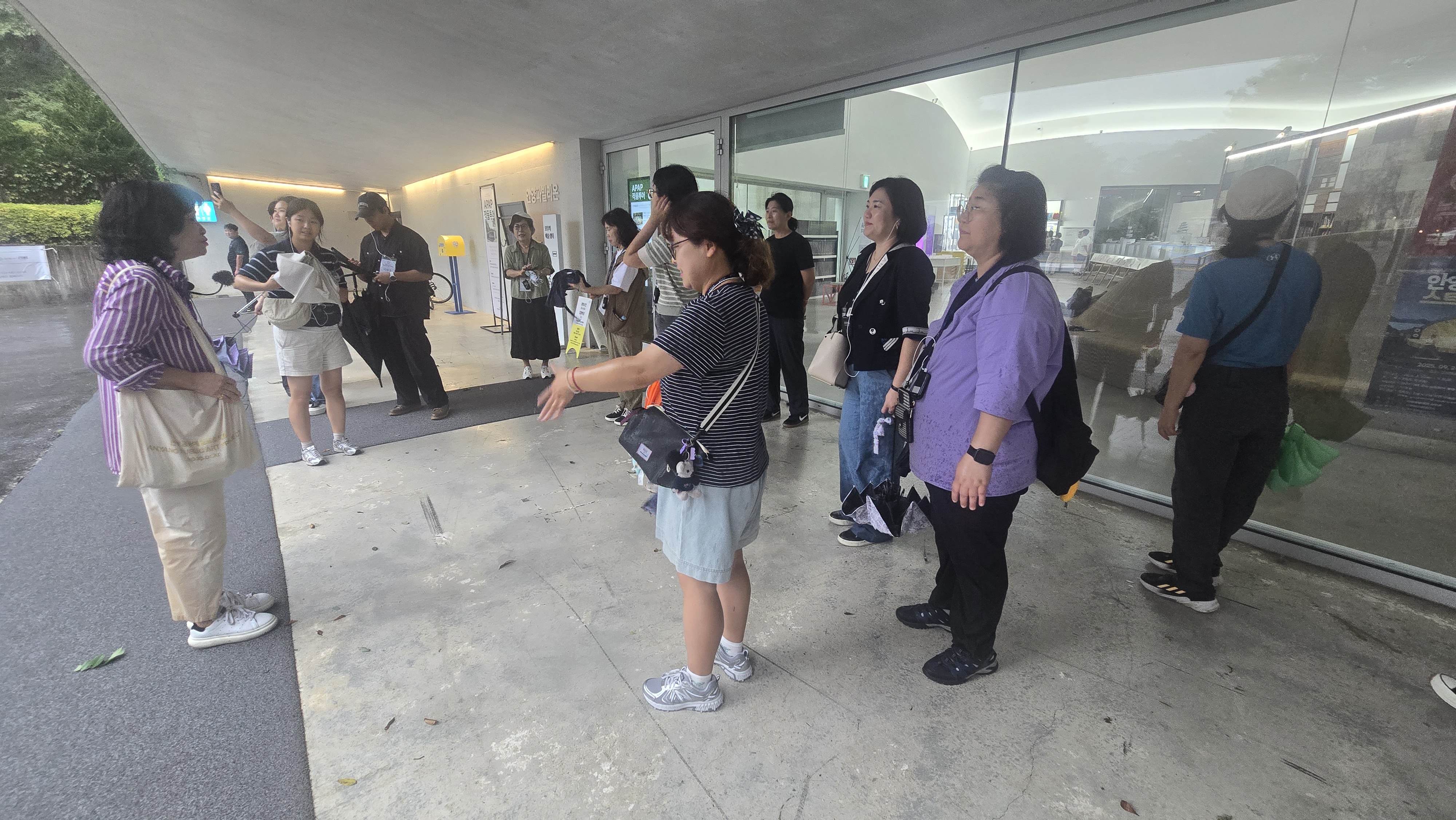 안양예술공원 벽천광장에 자리한 안양시 공공예술의 아지트이자 APAP본부격인 안양파빌리온에서 2개조로 나뉘어 도슨트와 함께 삼성산에 포진한 작품 투어를 할 계확이었다, 하지만 거세게 쏟아지는 비로 인해 안전을 우려하여 실내 설명으로 대체헤 아쉬움을 남겼으나 전시관이자 공공도서관으로 활용중인 안양 파빌리온 내외부를 간만에 .자세히 살펴불수 있는 기회가 됐다.