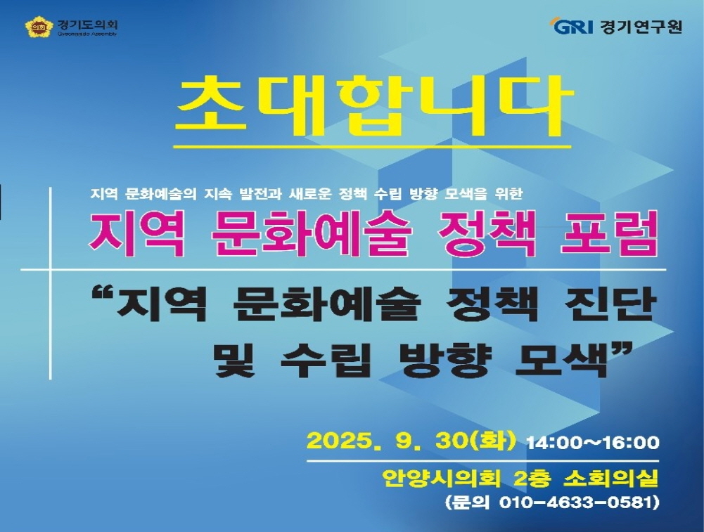오는 9월 30일(화) 오후2시 안양시의회 2층 소회의실에 열리는 정책포럼은 "지역 문화예술 정책 진단 및 수립 방향 모색" 이란 주제로 제1발제에서는 경기도 차원의 포괄적 의미로 분석한 내용을 듣고 제2발제에서는 안양시 문화예술 정책에 대한 현황을 진단하고 지속발전을 위한 방향을 모색하는 자리로 진행된다.