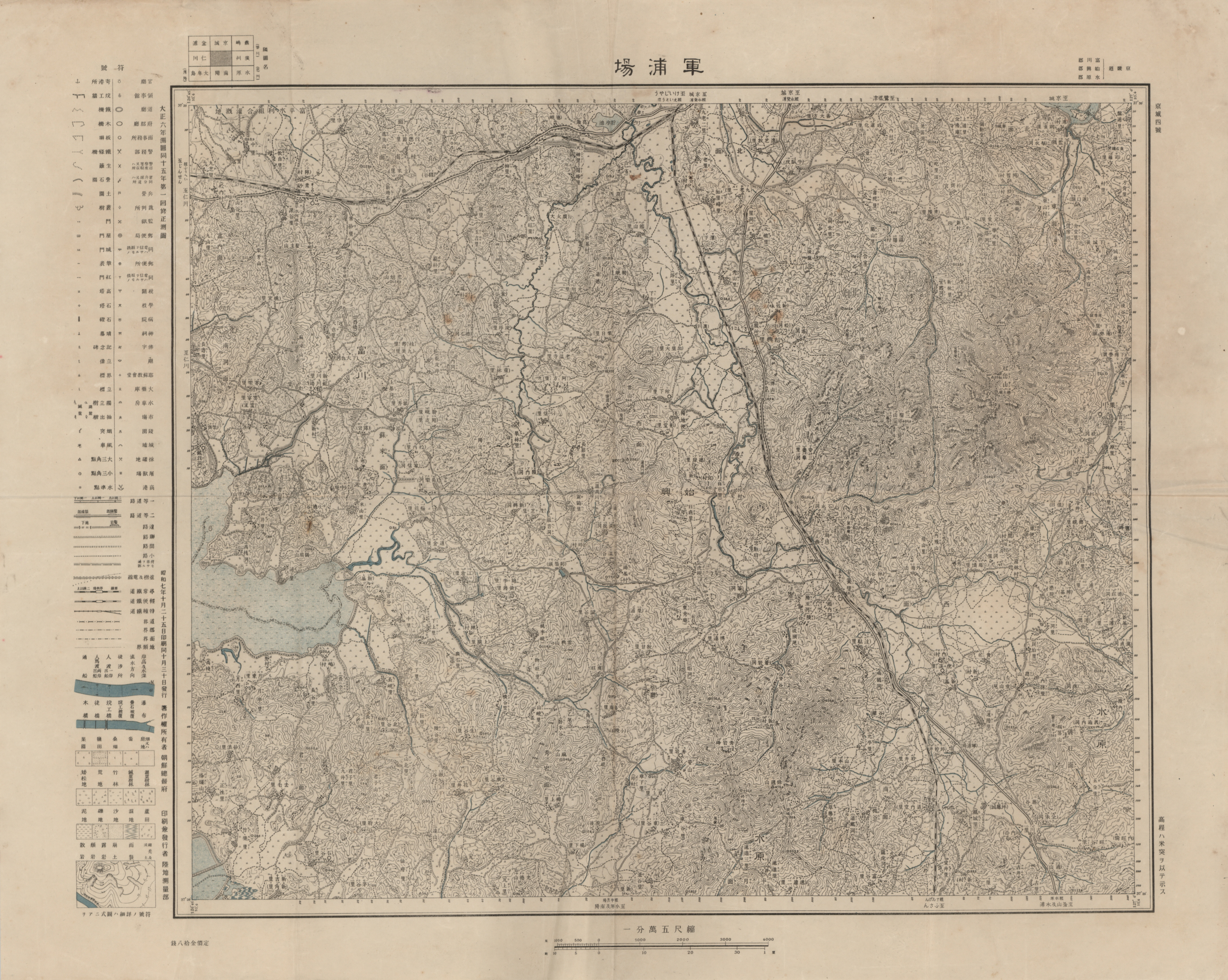 1932년(일본 소화7년) 제작한 '군포장'지도로 당시의 안양.군포.의왕 일대 모습을 볼수 있는 근대 지도이다. 일제는 조선을 강점하고, 통치차원에서 일본군 육지측량부대를 비밀리에 파견하여 조선인 측부를 고용하여 조선 땅을 측량하기 시작하였다. 1910년 강제 합방 전까지 약도 형태의 축척 5만분의 1 신속측도(迅速測圖)가 제작되었고, 합방이후 약도를 수정 보완하여 제2차 5만분의 1 지도를 제작하였다. 이후 6년간에 걸쳐 본격적으로 삼각측량과 지형측량을 실시하여 1914년부터 1918년 사이에 조선반도 전역의 1:50,000지형도 722매를 완성하였다. 일본군 측지부대가 제작한 군포장 지도는 1919년 제판형이 있으며 이 지도는 그로부터 13년후인 1932년에 제작한 것이다.