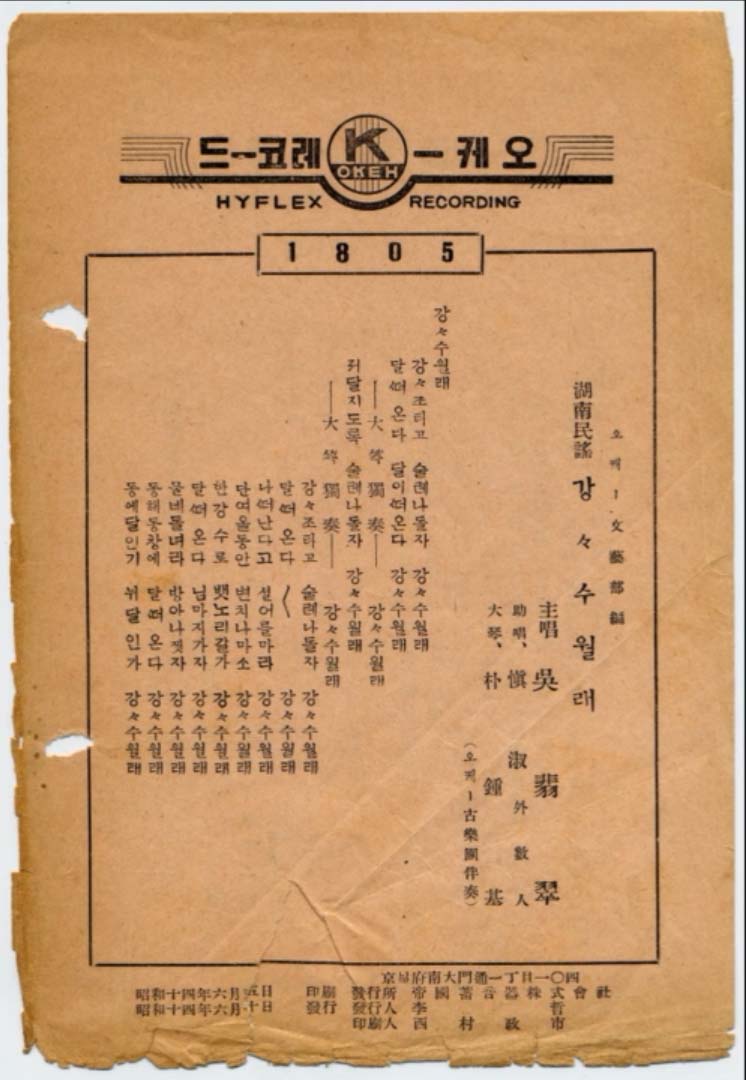 소리를 배우시는 밪진자들의집 양숙정 운영위원장님께서 귀한 국악 소리 음악 파일 하나를 보내주셨기에 자료 정리를 해본다. 파일은 1935년 9월8일 발매된 오케 음반에 수록된 강강수월래. 주창 오비치 조창 신숙이 불렀다. 대금 반주는 박종기 명인이다.