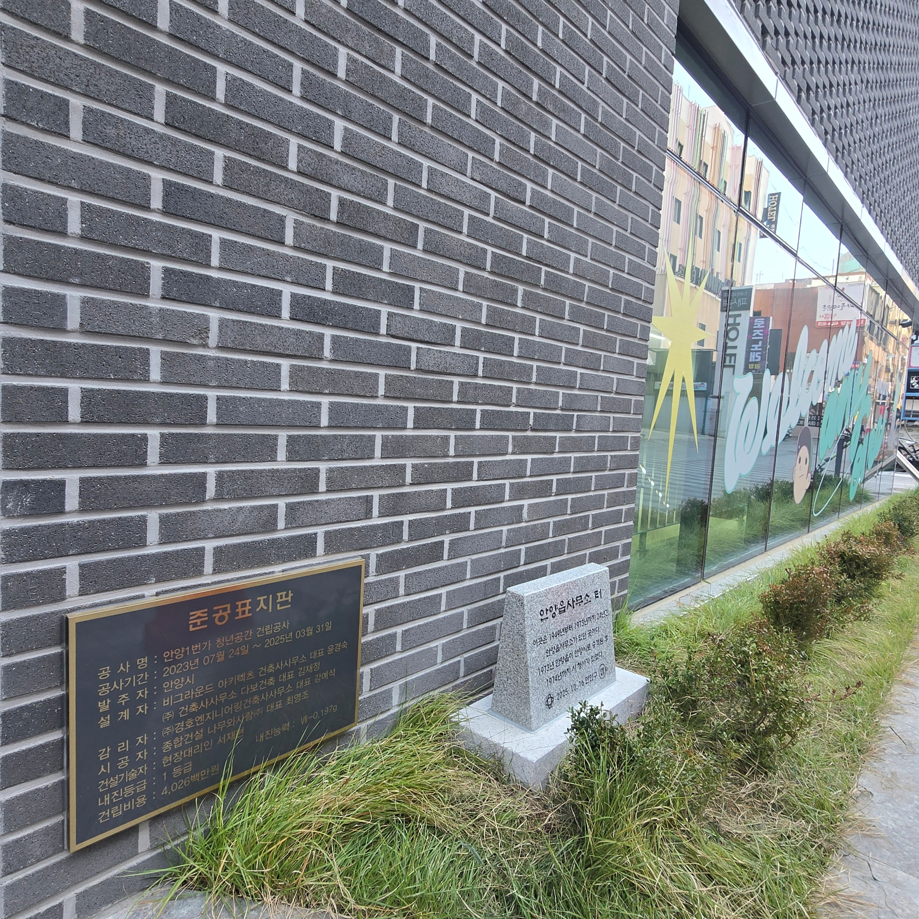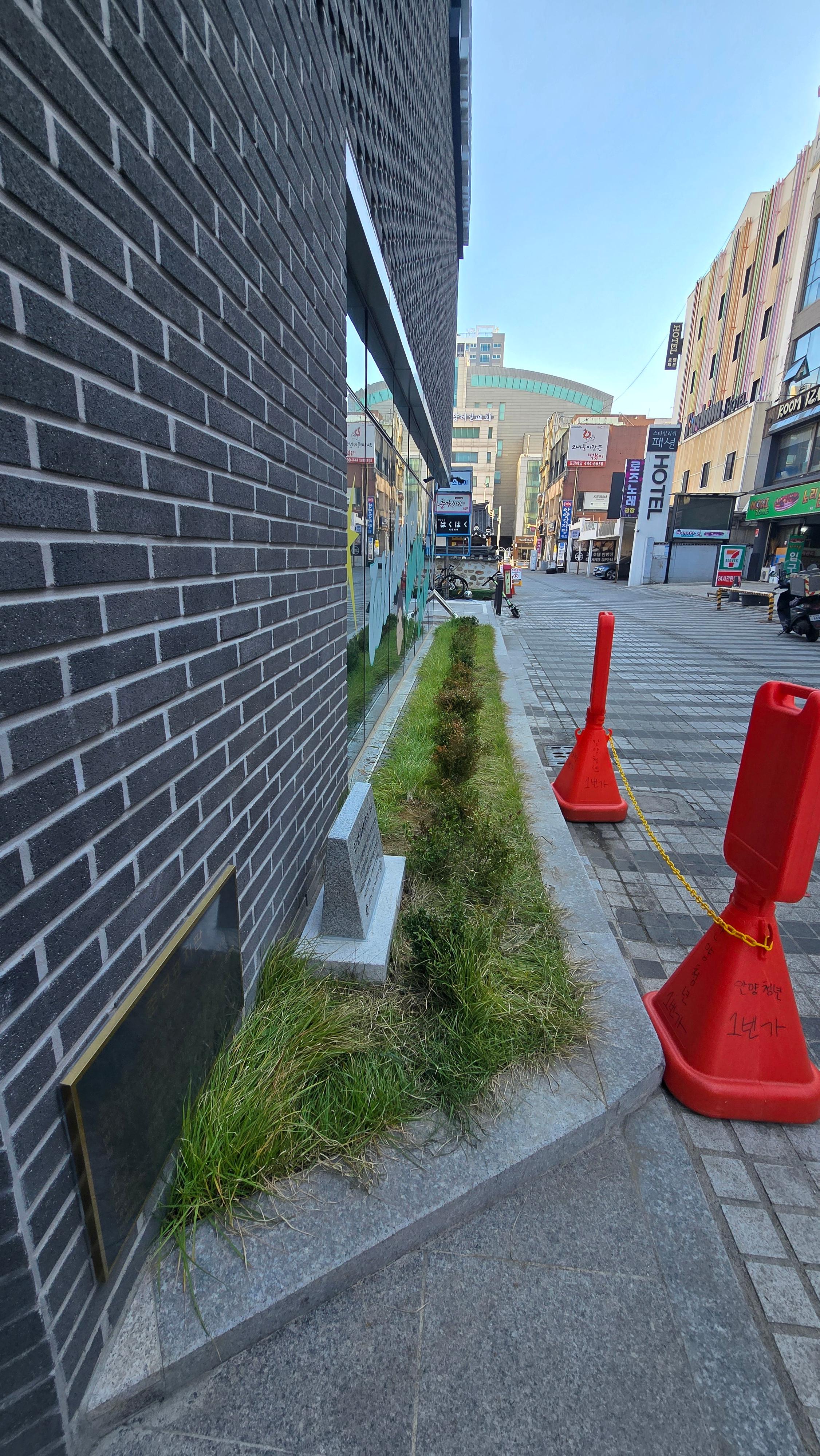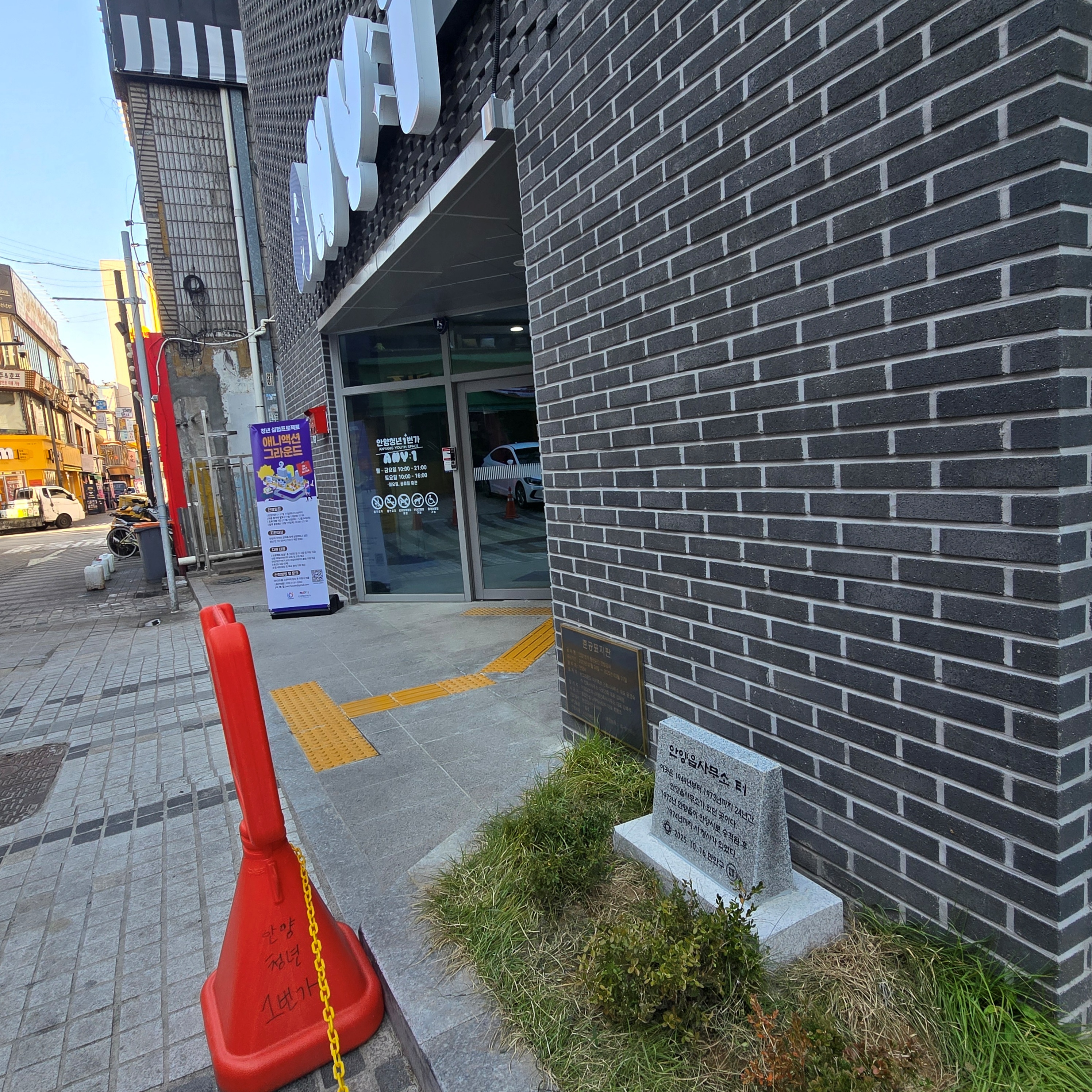 2025.11.03/ 도시기록 #안양 #표지석/ 안양일번가 청년공간(현 장내로 143번길 16) 건물 앞에 2025년 11월13일 안양시 만안구청과 만문누리협의회에 의해 안양읍사무소 터 표지석이 설치되었다.