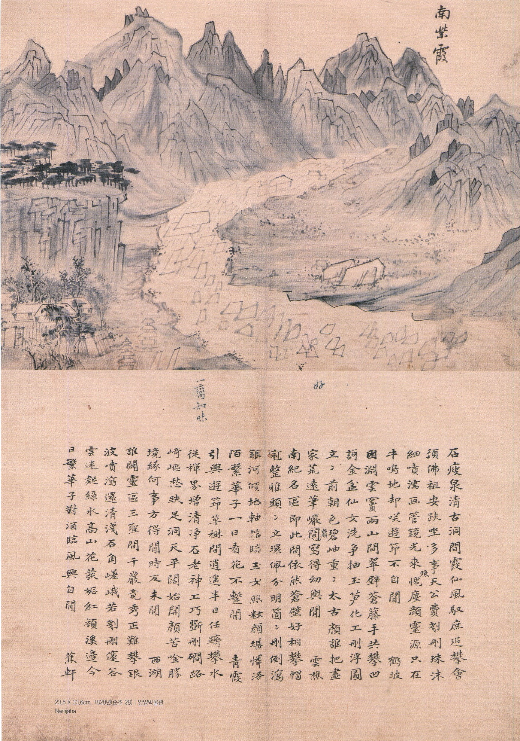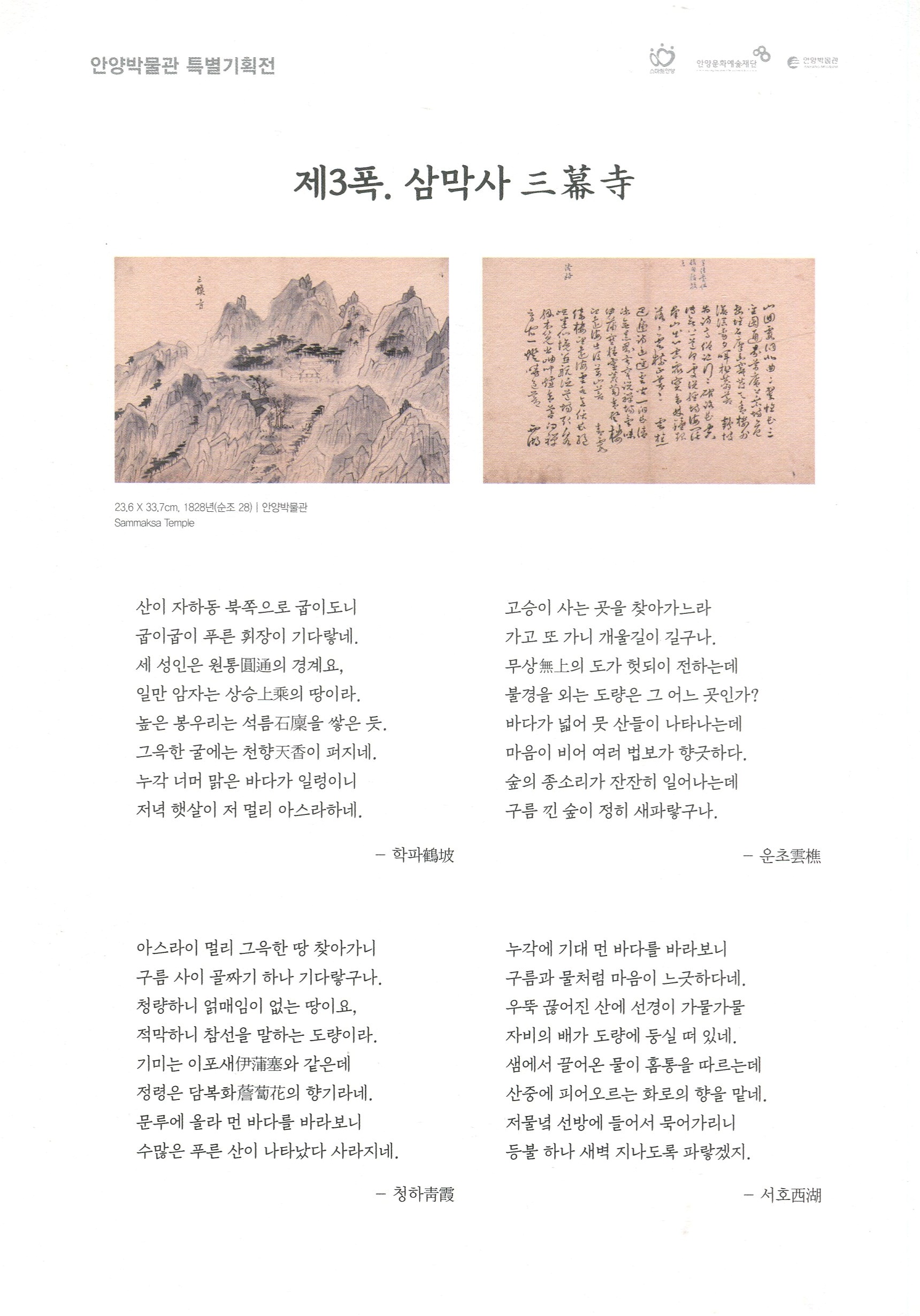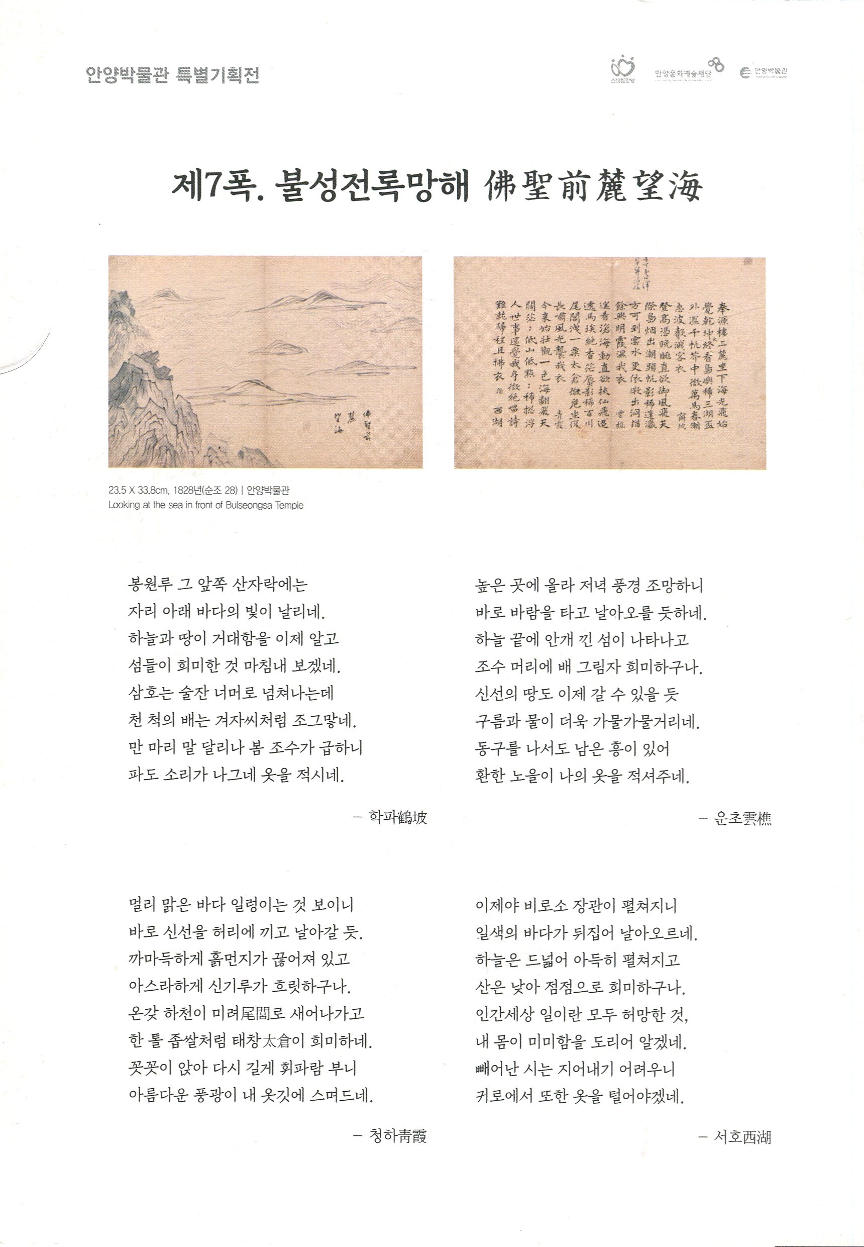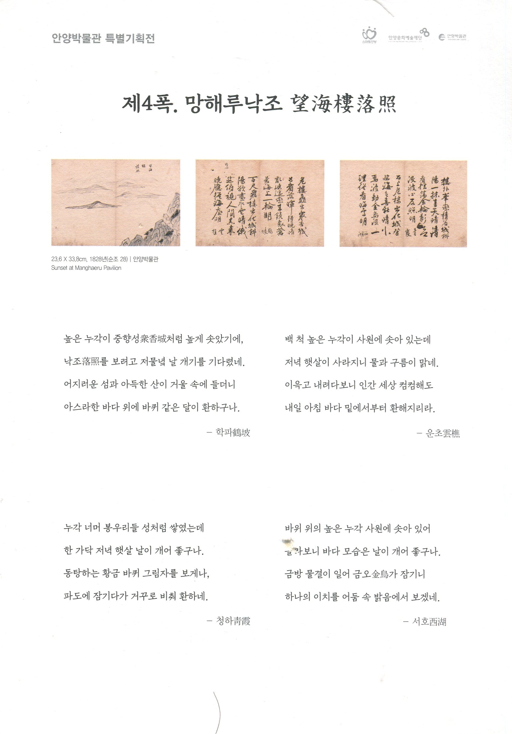 서화첩에는 실경산수화 11폭과 시문 42수가 수록돼 있으며, 안양시의 명소 또는 그 흔적을 확인할 수 있는 남자하(현 안양박물관이 포함된 안양예술공원 일대), 염불암, 삼막사, 망해루, 누정(누각과 정자) 등이 담겨있다.