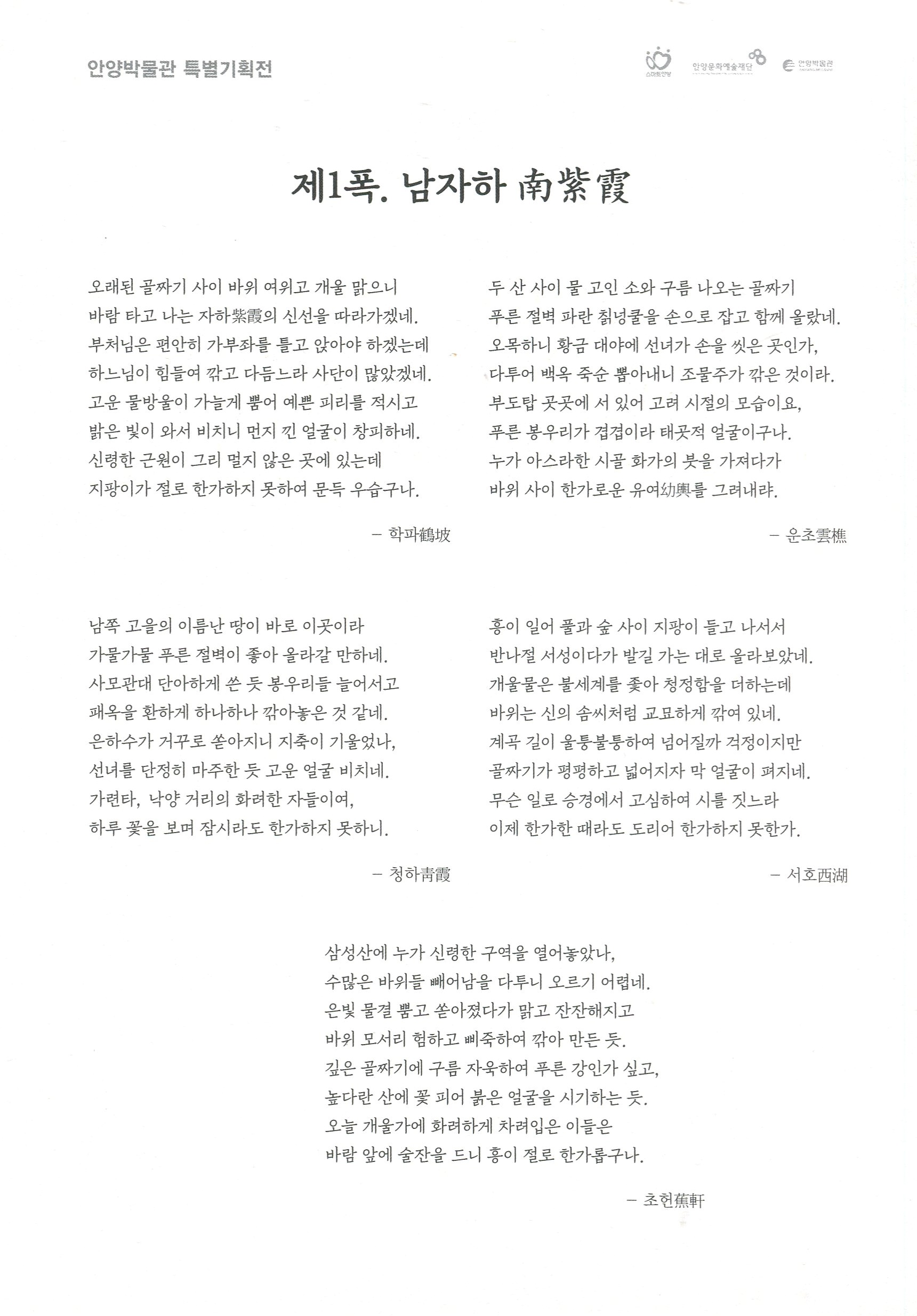 서화첩에는 실경산수화 11폭과 시문 42수가 수록돼 있으며, 안양시의 명소 또는 그 흔적을 확인할 수 있는 남자하(현 안양박물관이 포함된 안양예술공원 일대), 염불암, 삼막사, 망해루, 누정(누각과 정자) 등이 담겨있다.