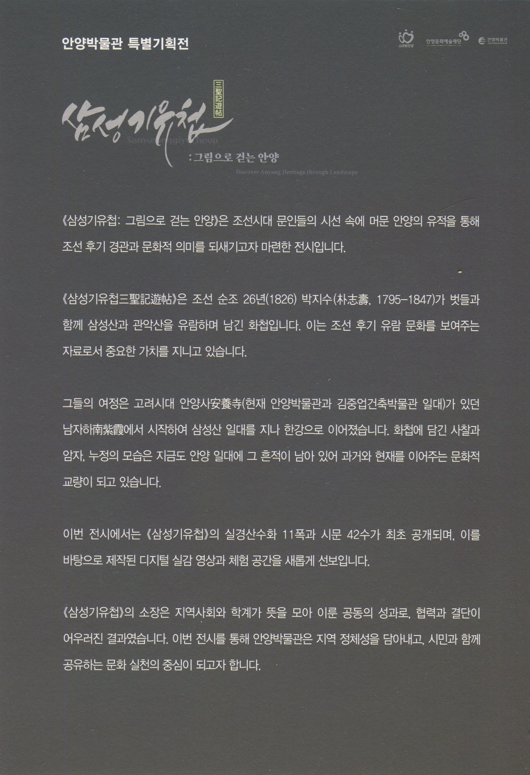 안양박물관은 지역 문화 유산을 보존 및 연구하는 공립박물관으로서 유물을 조사하고 수집하던 중 조선시대 안양의 실경을 담은 회화‘삼성기유첩’의 존재를 확인하고, 지난해 2월 고미술 경매를 통해 매입을 추진했다.