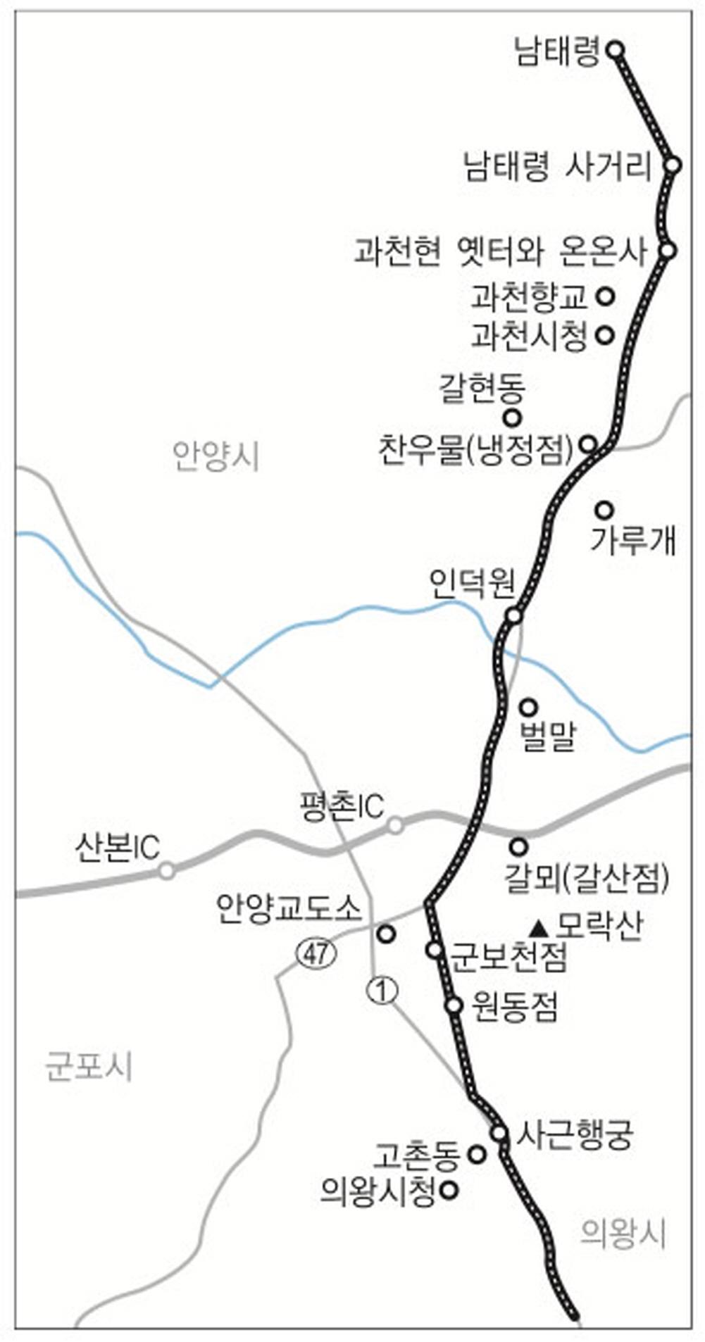오늘은 과천과 경계를 이루는 남태령에서 길을 잡습니다. 이곳이 지경(地境) 고개임을 알 수 있는 현대적 증거는 고개의 서쪽에 자리한 수도방위사령부라 할 것입니다. 대한민국의 수도를 지키는 부대가 이곳에 있음은 이 고개가 지경으로서의 성격을 잘 드러내고 있기 때문입니다. 오늘의 노정을 〈과천시지〉에는 남태령(南泰嶺)-과천현행궁(果川縣行宮)-읍내전천교(邑內前川橋)-냉정점(冷井店)-은행정(銀杏亭)-인덕원점후천교(仁德院店後川橋)-인덕원천교(仁德院川橋)-독박지(禿朴只)-갈산점(葛山店)-독동현(禿洞峴)-군보천점-자잔동(自棧洞)-원동점-사근참행궁(肆覲站行宮)으로 정리해 두었습니다.