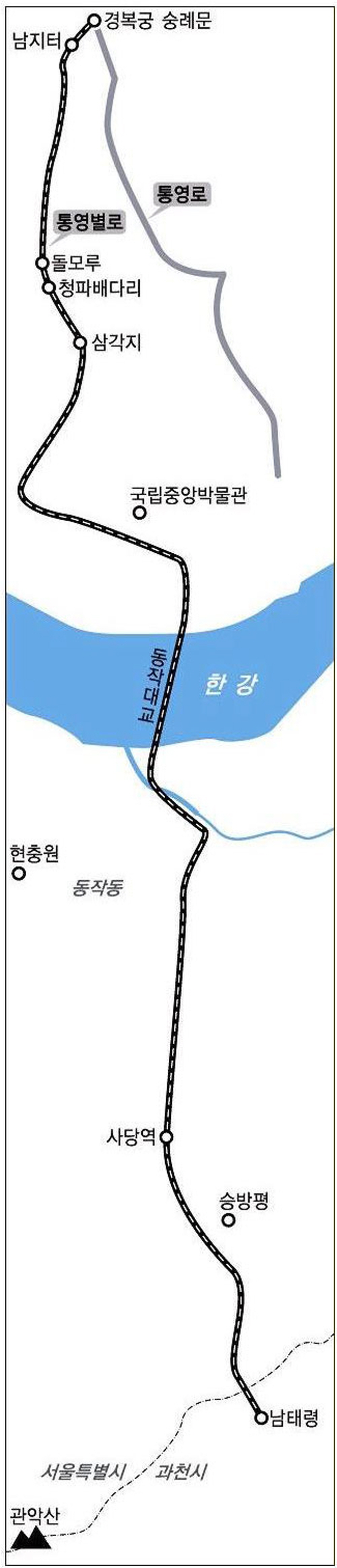 우리가 걷는 통영별로의 서울∼수원 구간은 대체로 정조 임금이 화성 행차를 위해 오간 길과 겹치게 되어, 이 노정을 따라 옛길을 살피도록 하겠습니다. 남대문을 출발한 길은 통영로와 달리 곧바로 남쪽으로 이르지 않고 남서쪽으로 길을 잡아 지하철 1호선과 비슷한 선형을 따릅니다. 〈대동지지〉에는 예서 동작나루까지 20리라 했습니다.