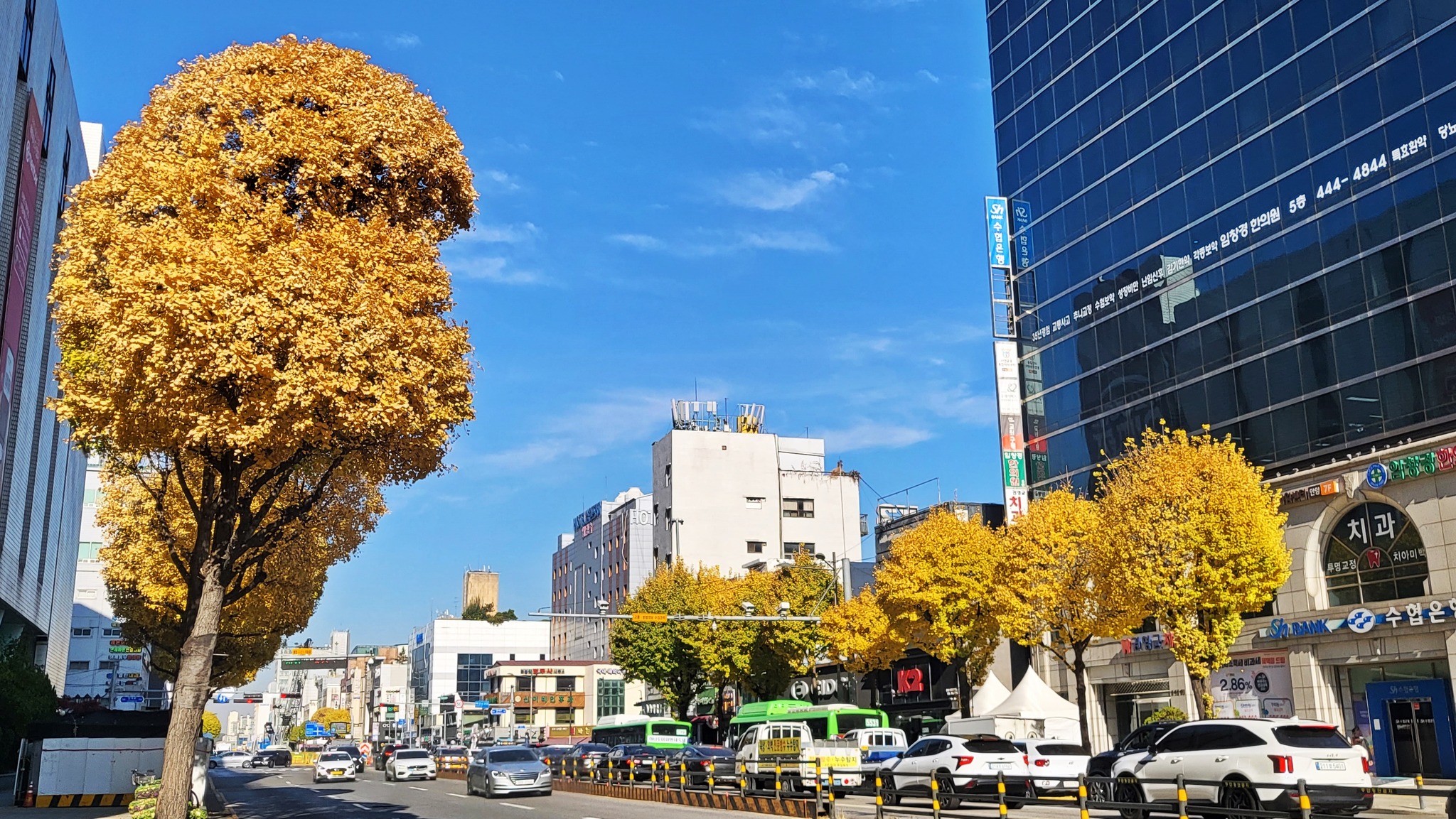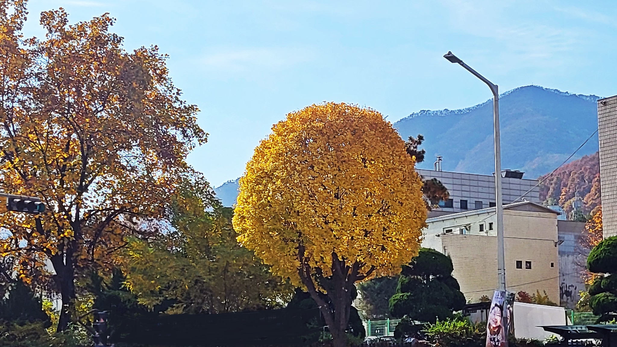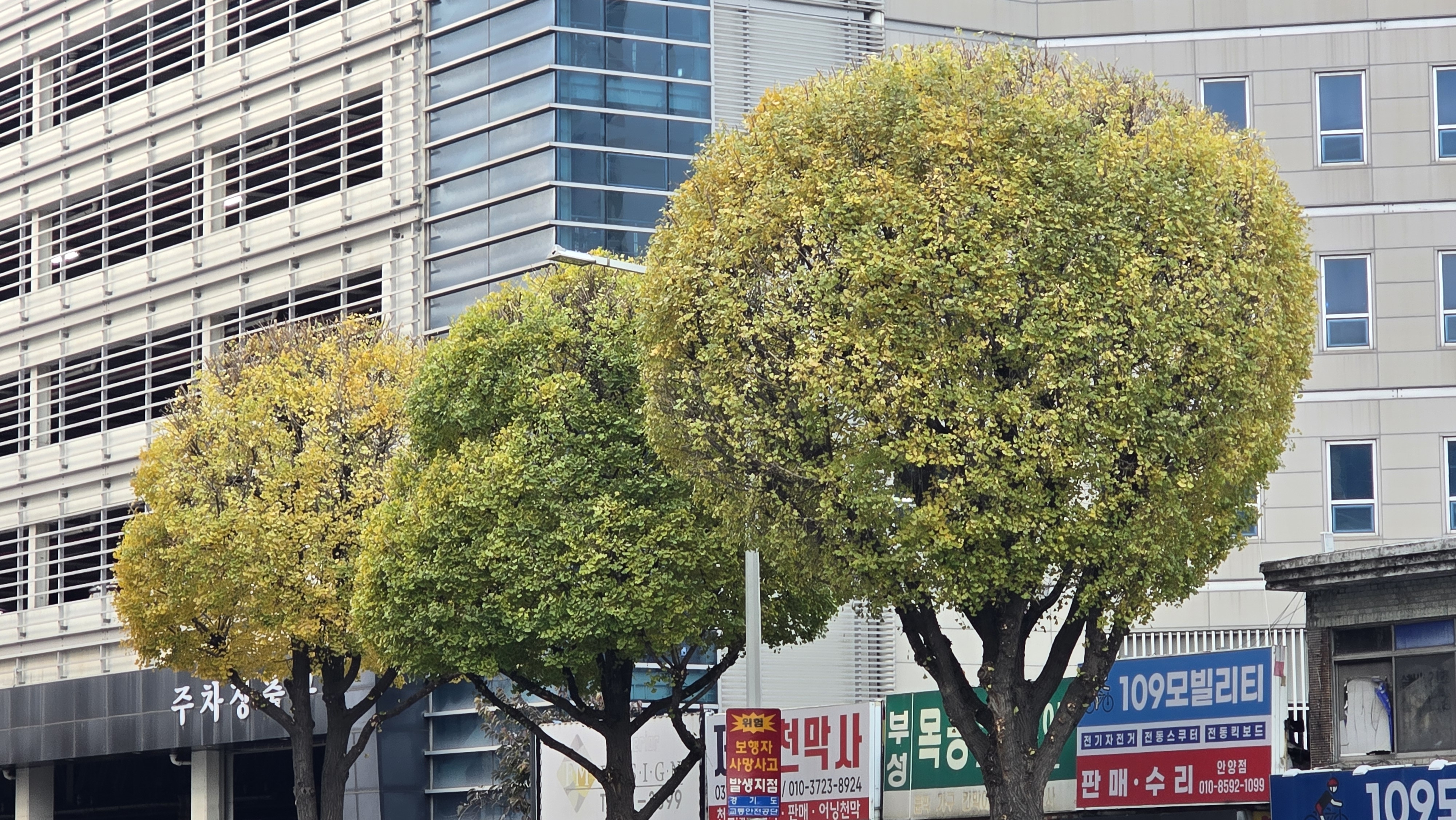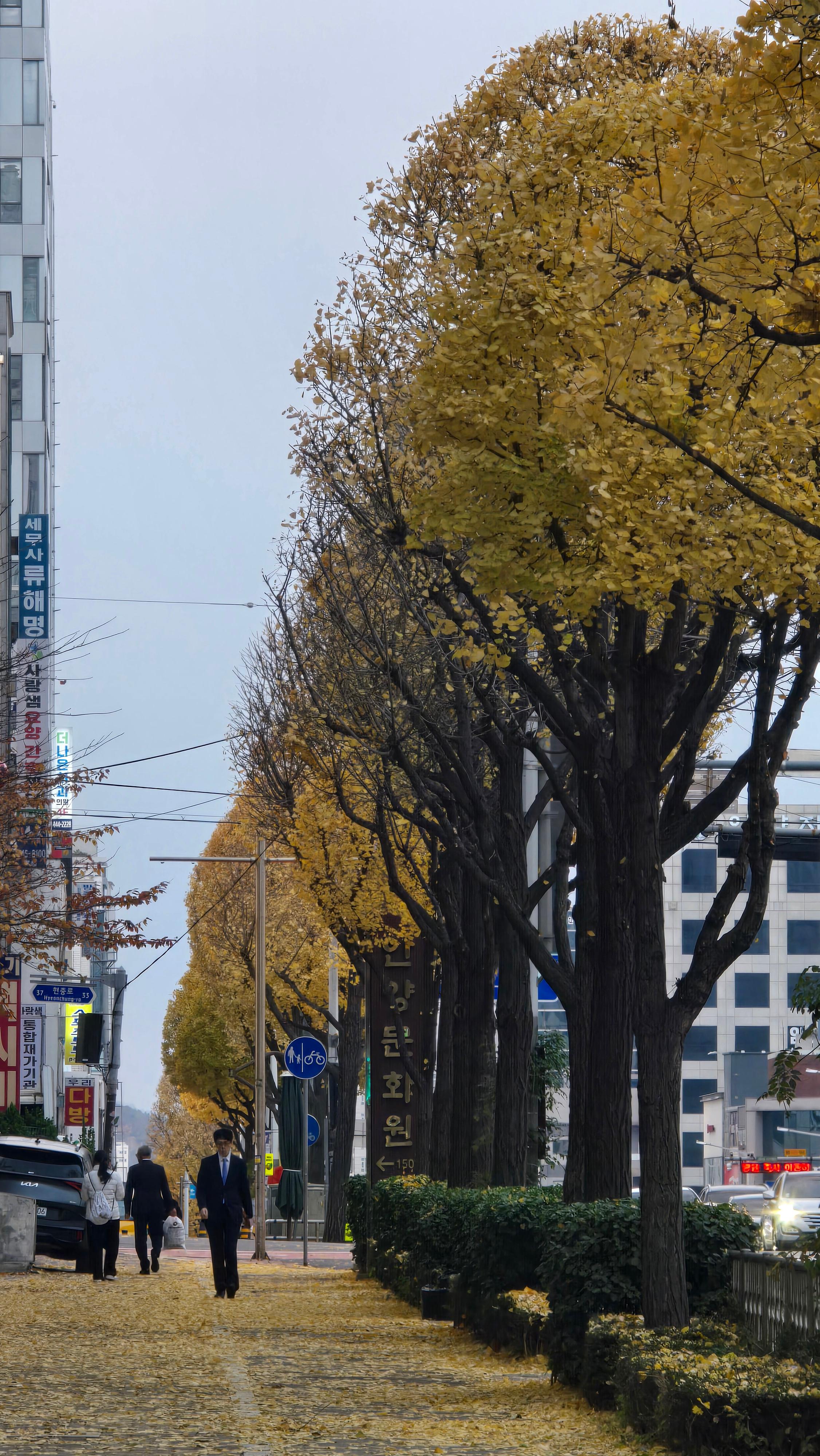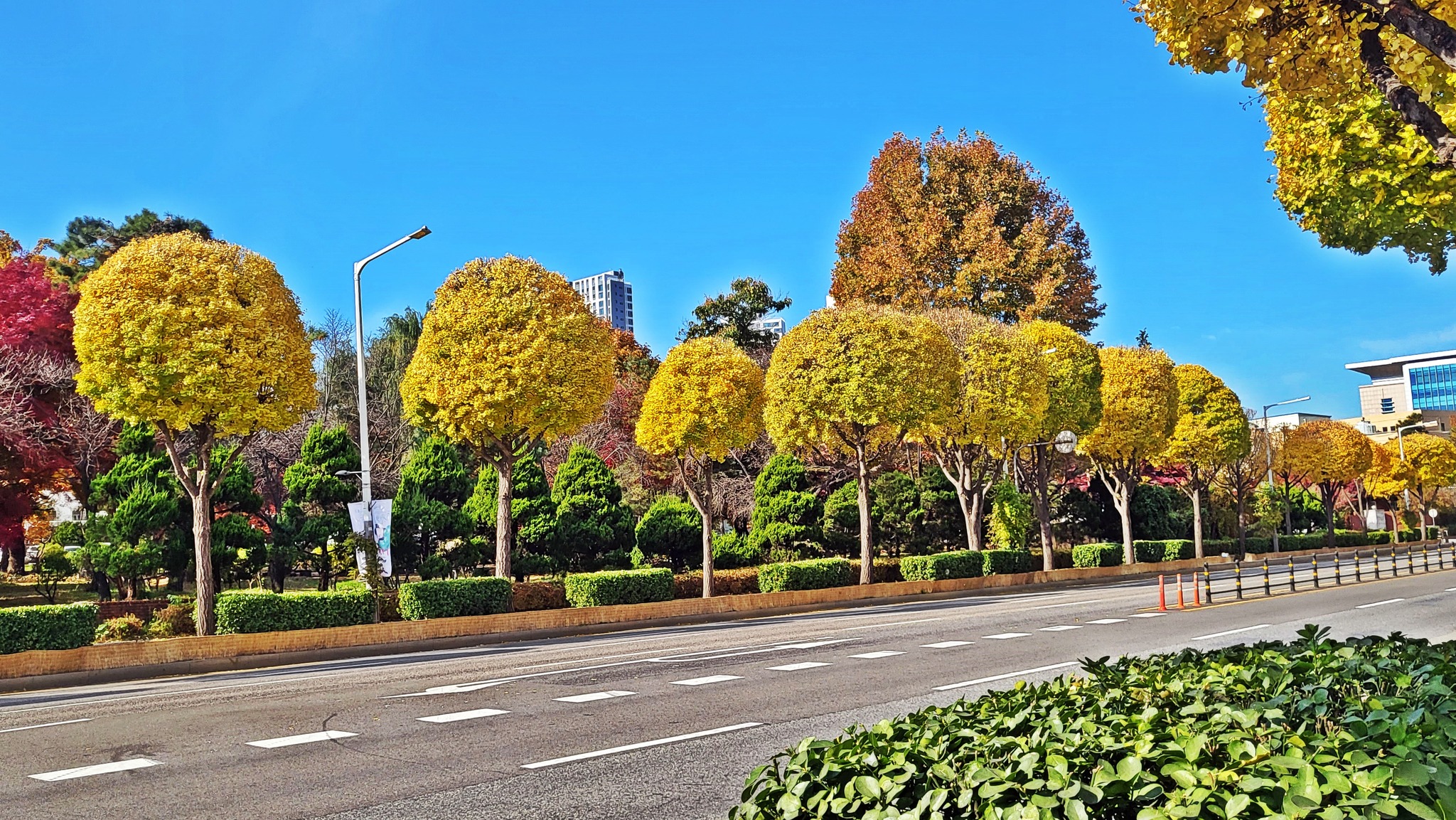 2025.11./ #도시기록 #안양 #디로수 #은행나무/ 안양 만안구 중앙로의 둥근공 모양의 은행나무 가로수들 노랗게 물들었다.