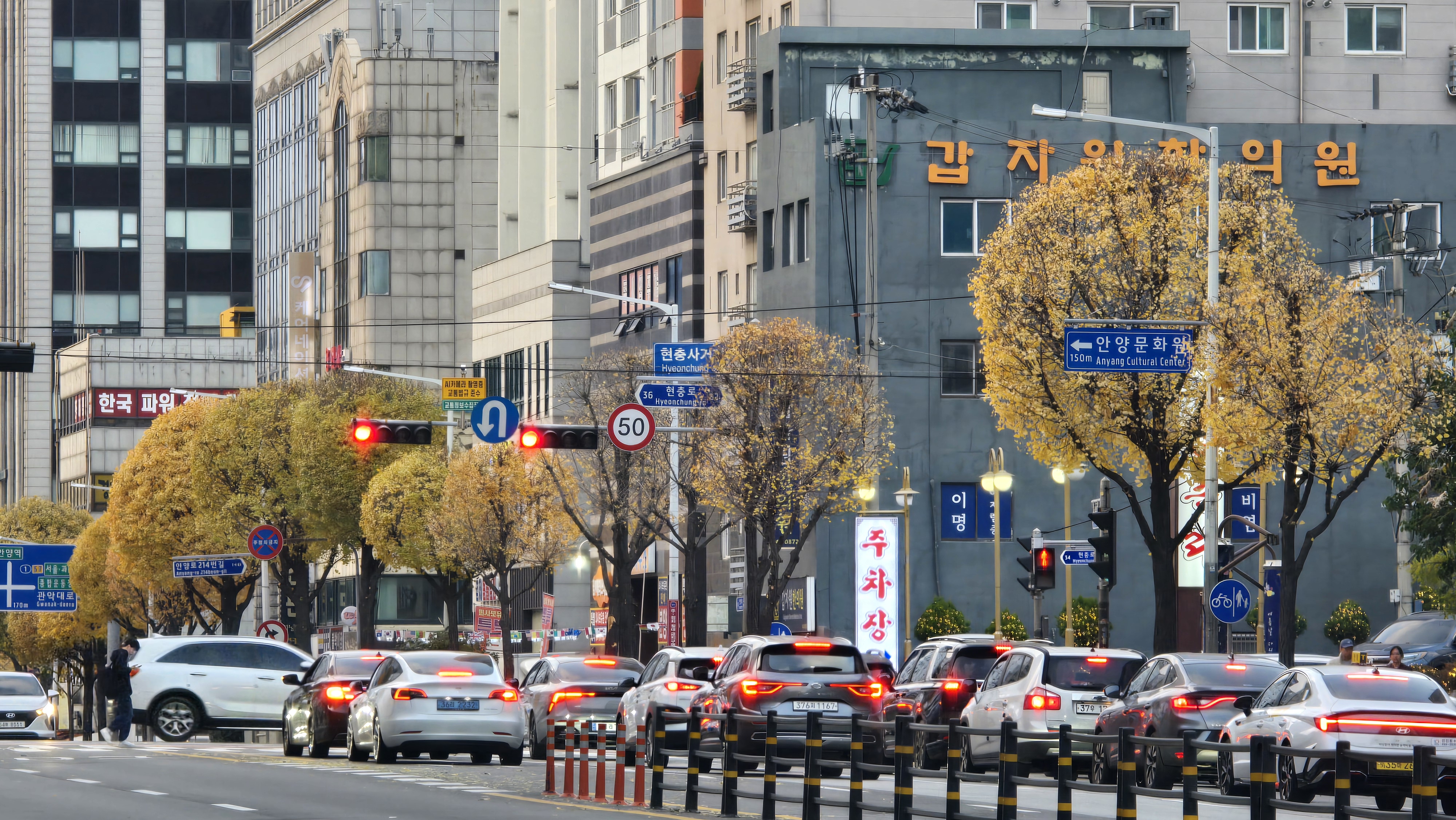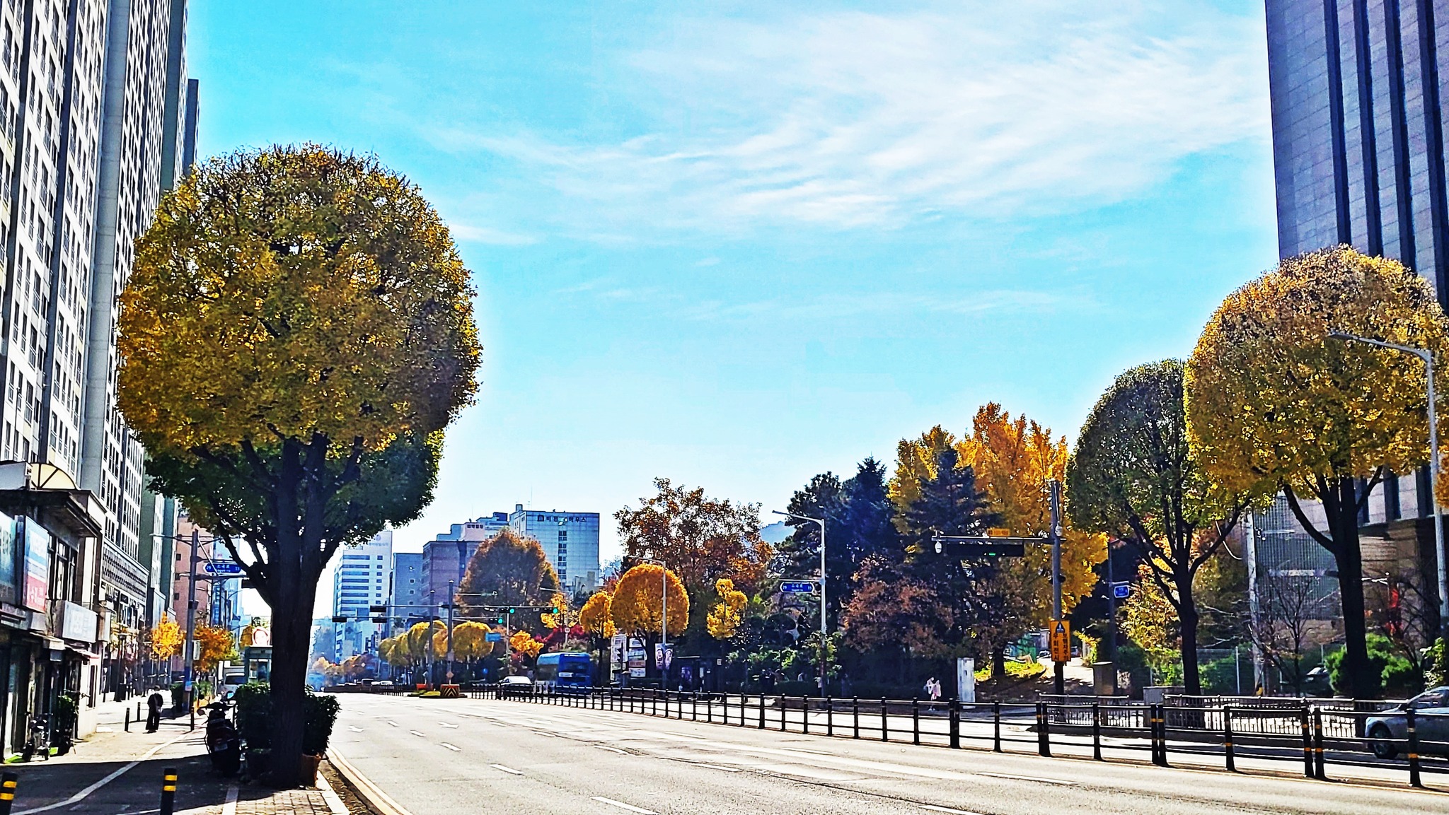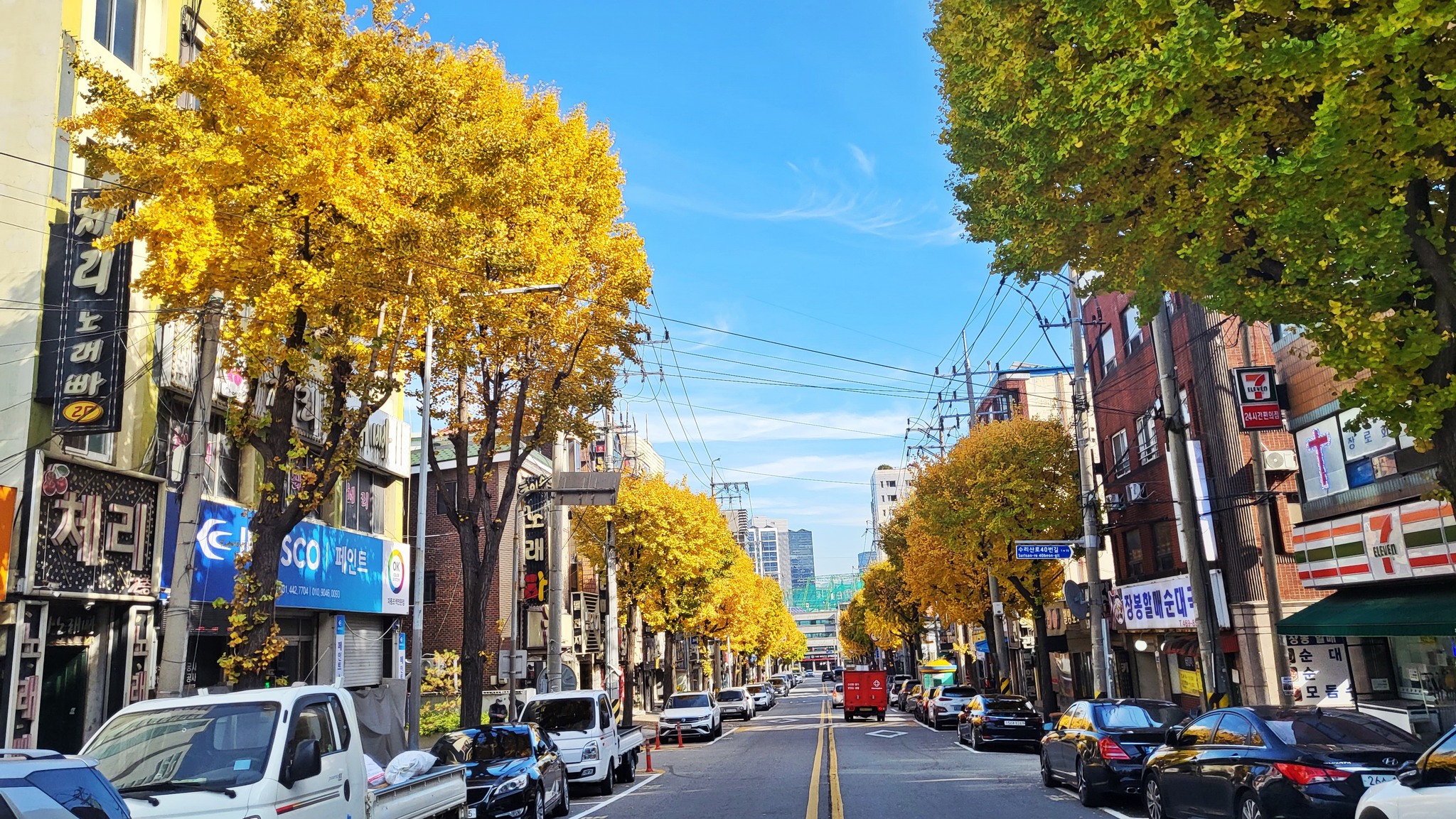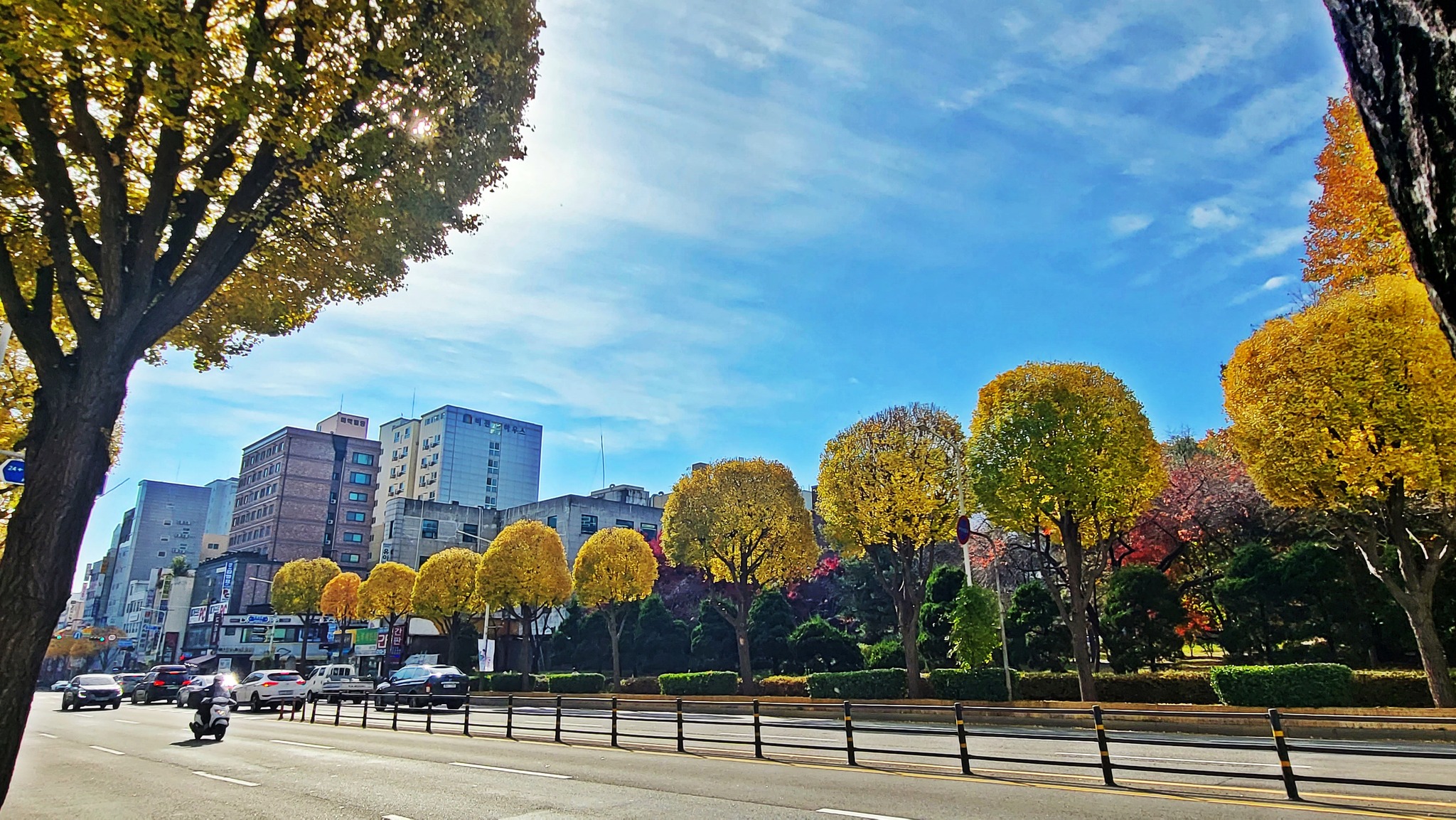 2025.11./ #도시기록 #안양 #디로수 #은행나무/ 안양 만안구 중앙로의 둥근공 모양의 은행나무 가로수들 노랗게 물들었다.