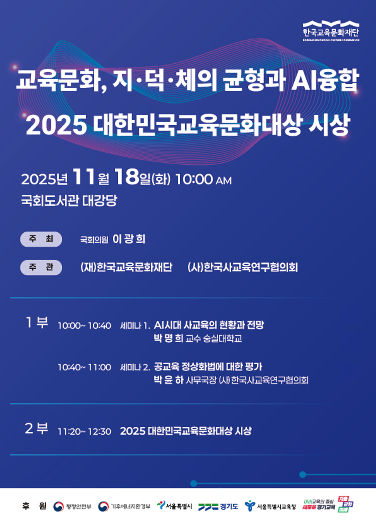 (재)한국교육문화재단이 주최하고 서울특별시, 경기도교육청, 경기도, 한국교육문화진흥협회가 후원한 '2024 대한민국 교육문화대상'이 지난 18일 국회도서관 대강당에서 열렸다.