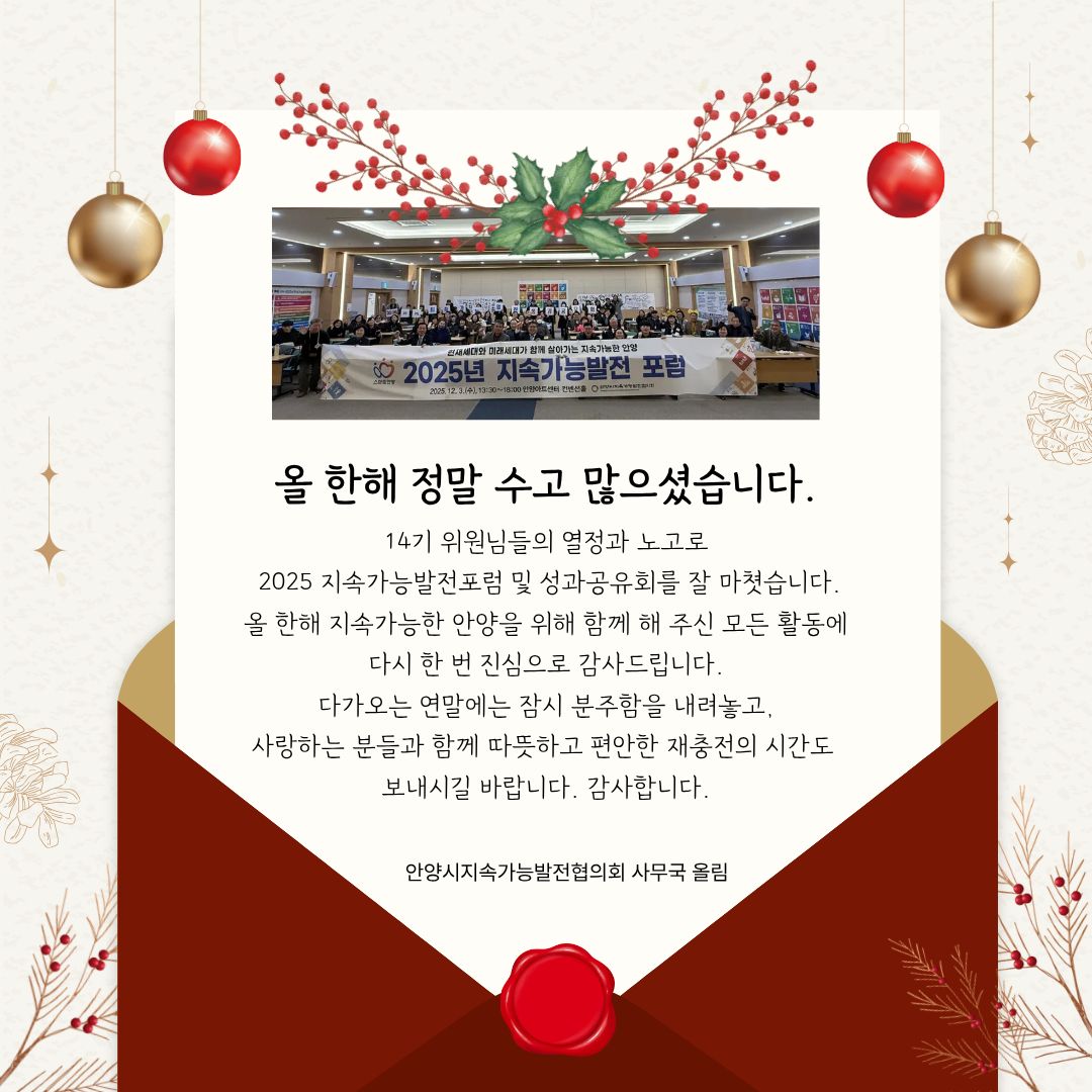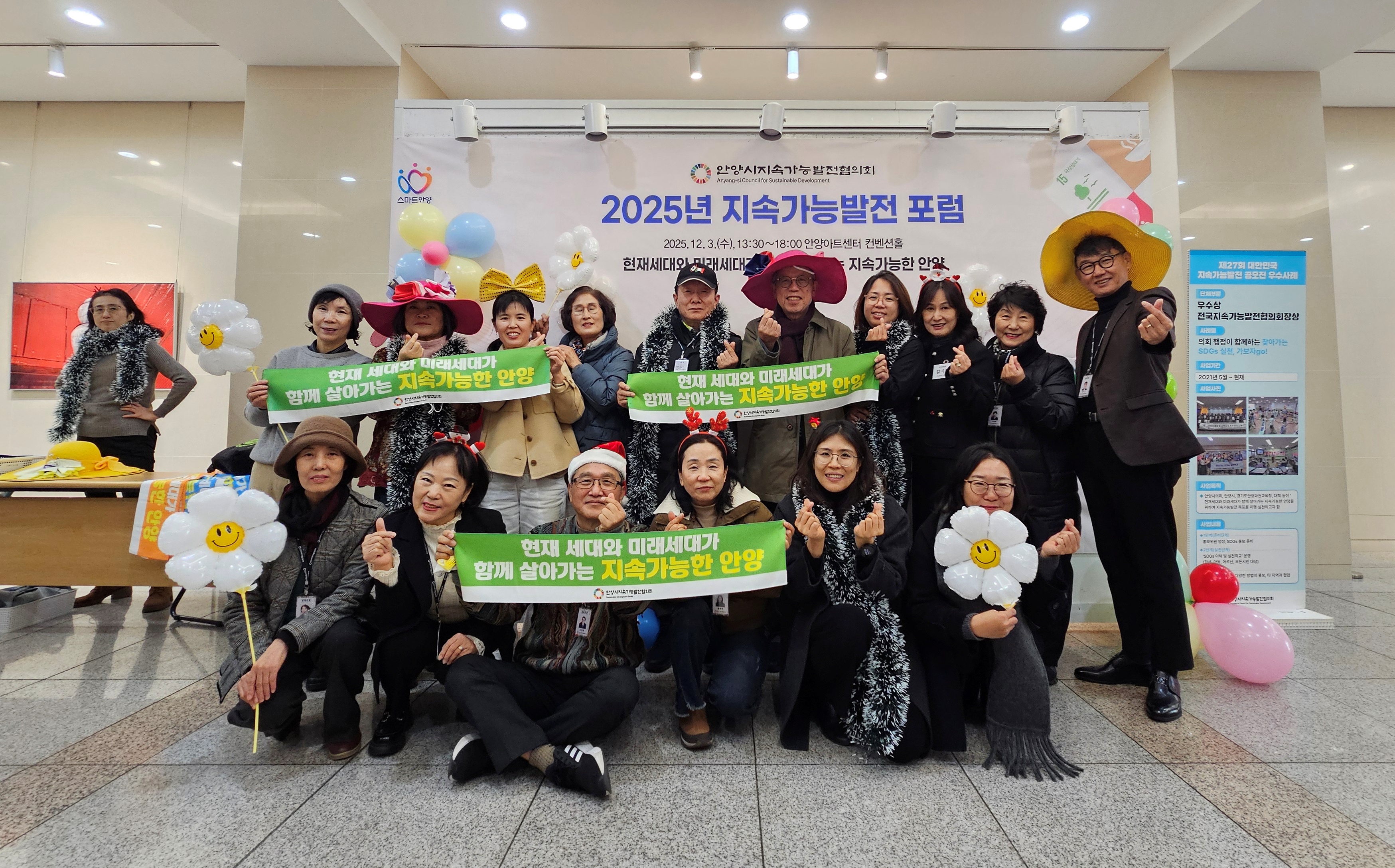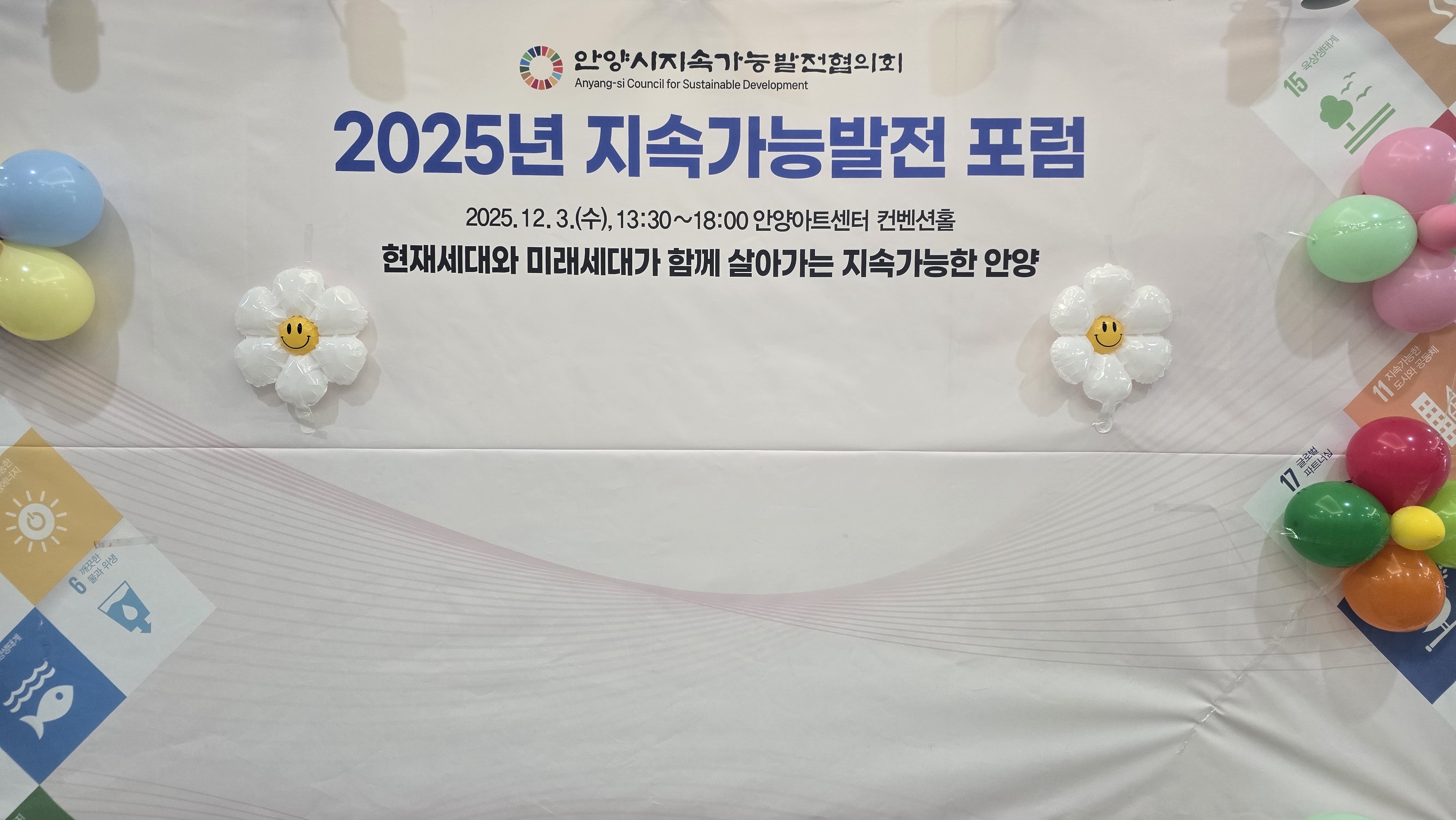 12월 3일 오후, 안양아트센터 컨벤션홀에는 겨울볕처럼 따뜻한 사람들이 모였다. "현재세대와 미래 세대가 함게 살아가는 지속가능한 안양"을 모토로 올 한해동안 열심히 퐐동해 온 안양시지속가능발전협의회 사업을 소개하고, 나누고, 평가하는 자리인 ‘2025 지속가능발전포럼’이 열리는 날이다.