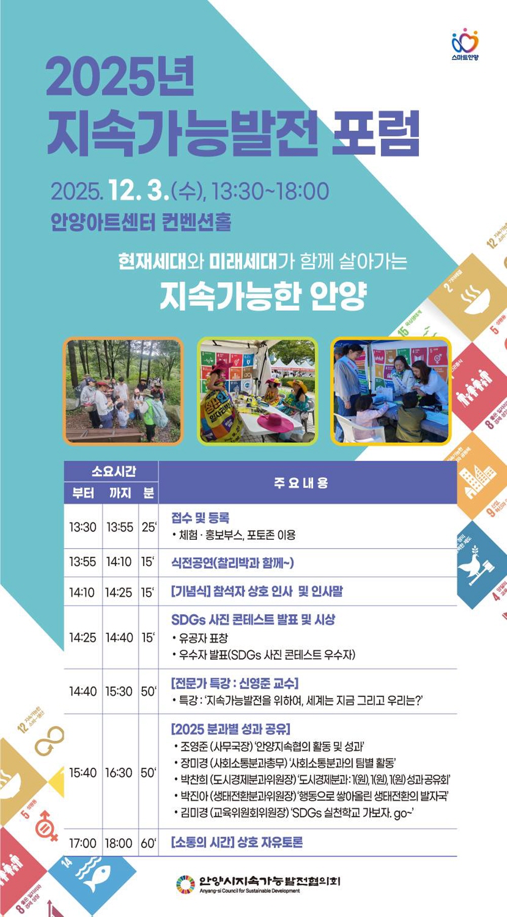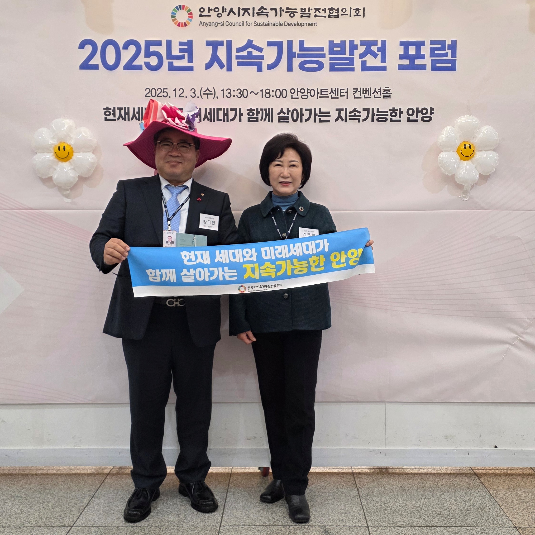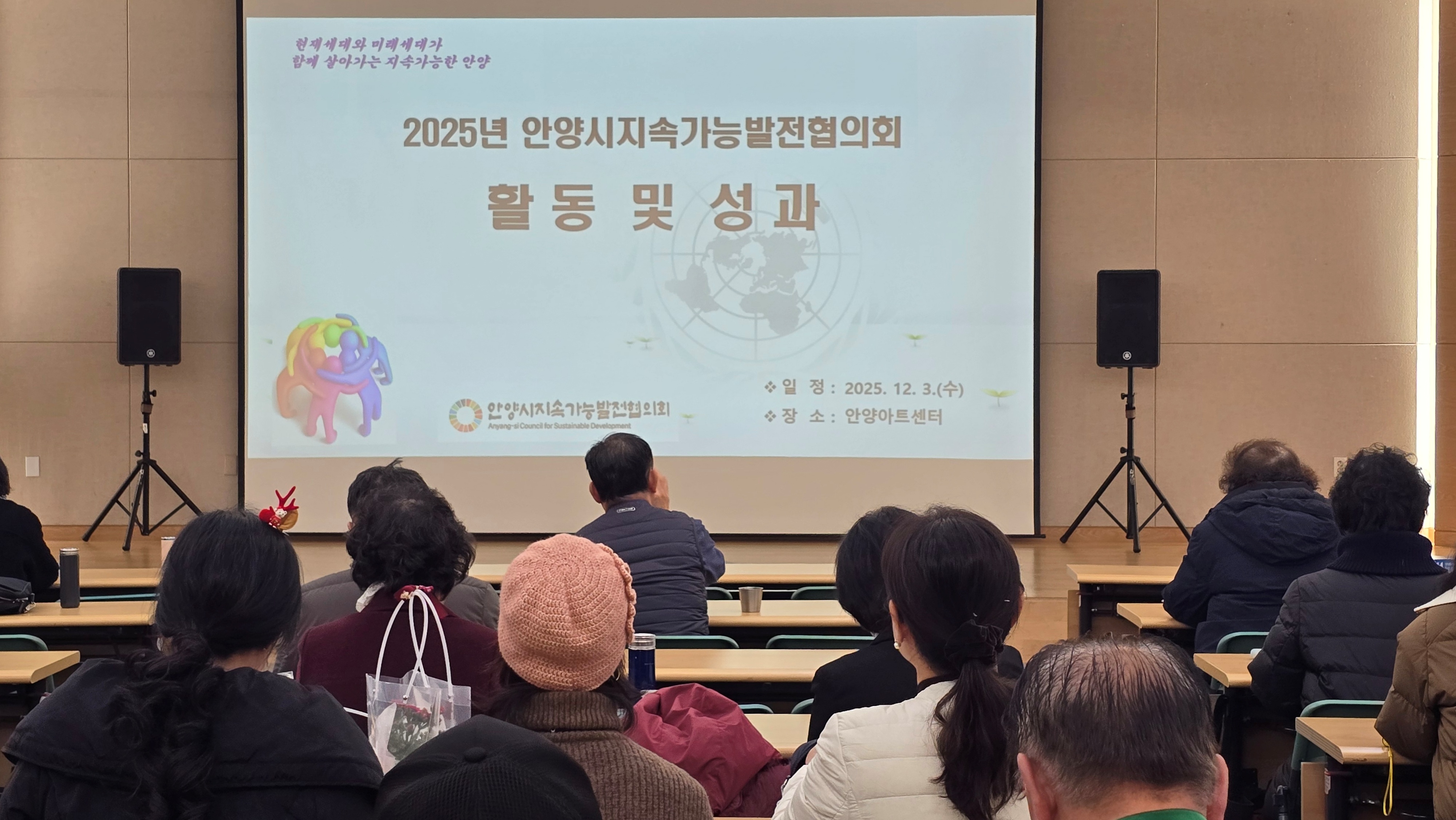 12월 3일 오후, 안양아트센터 컨벤션홀에는 겨울볕처럼 따뜻한 사람들이 모였다. "현재세대와 미래 세대가 함게 살아가는 지속가능한 안양"을 모토로 올 한해동안 열심히 퐐동해 온 안양시지속가능발전협의회 사업을 소개하고, 나누고, 평가하는 자리인 ‘2025 지속가능발전포럼’이 열리는 날이다.