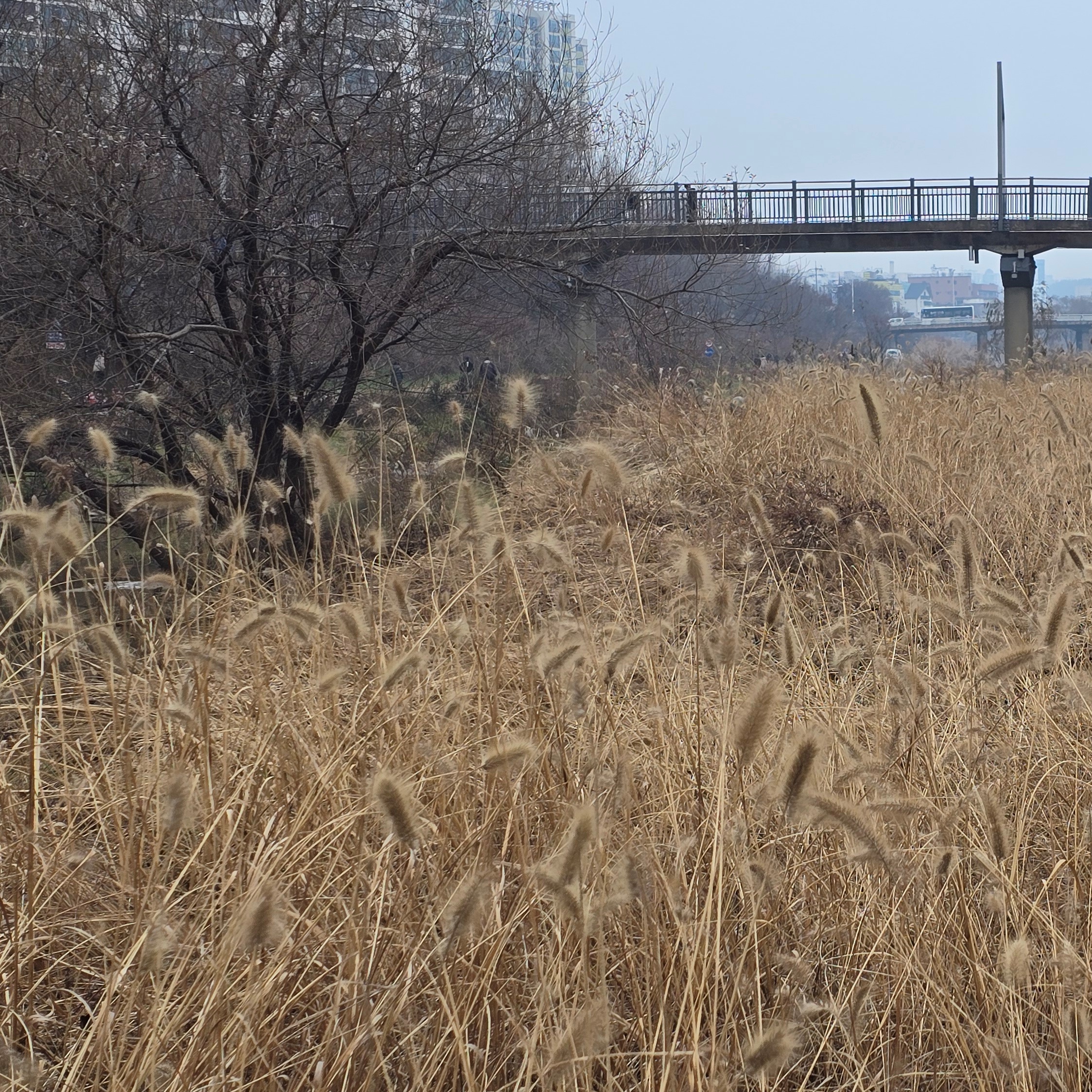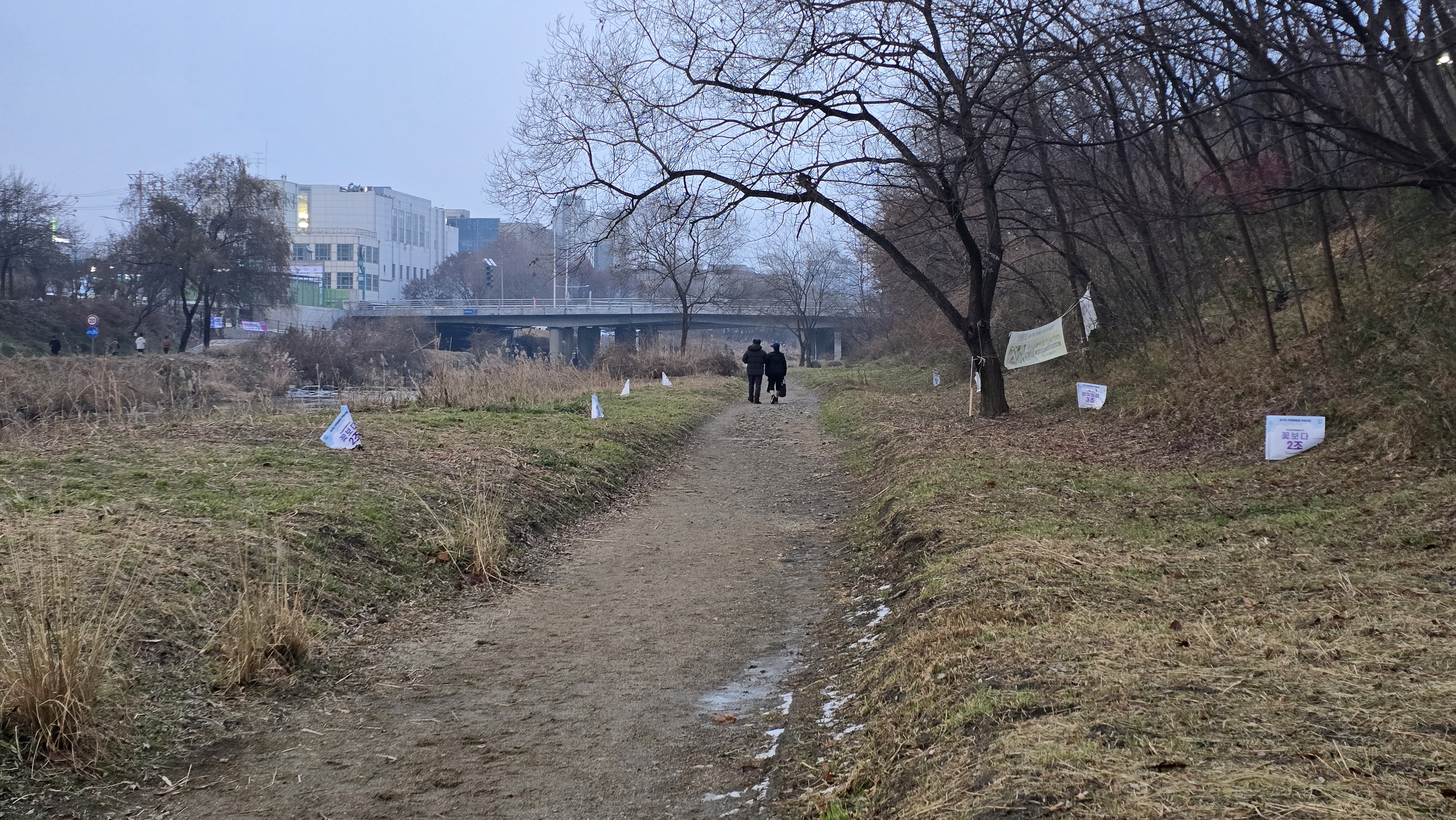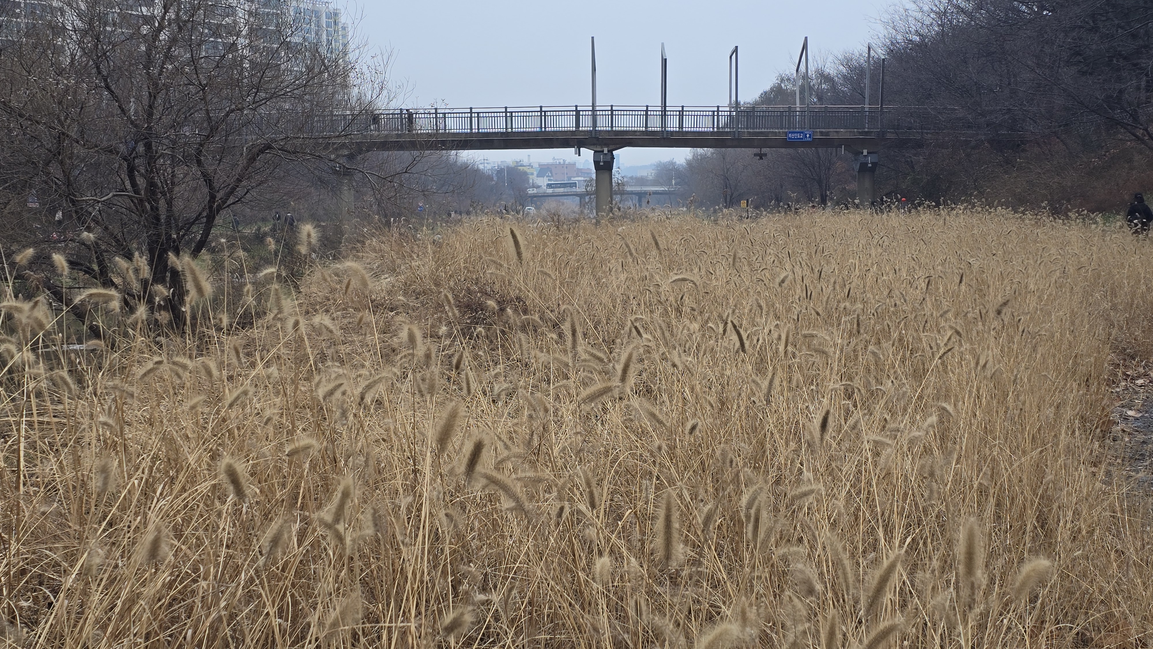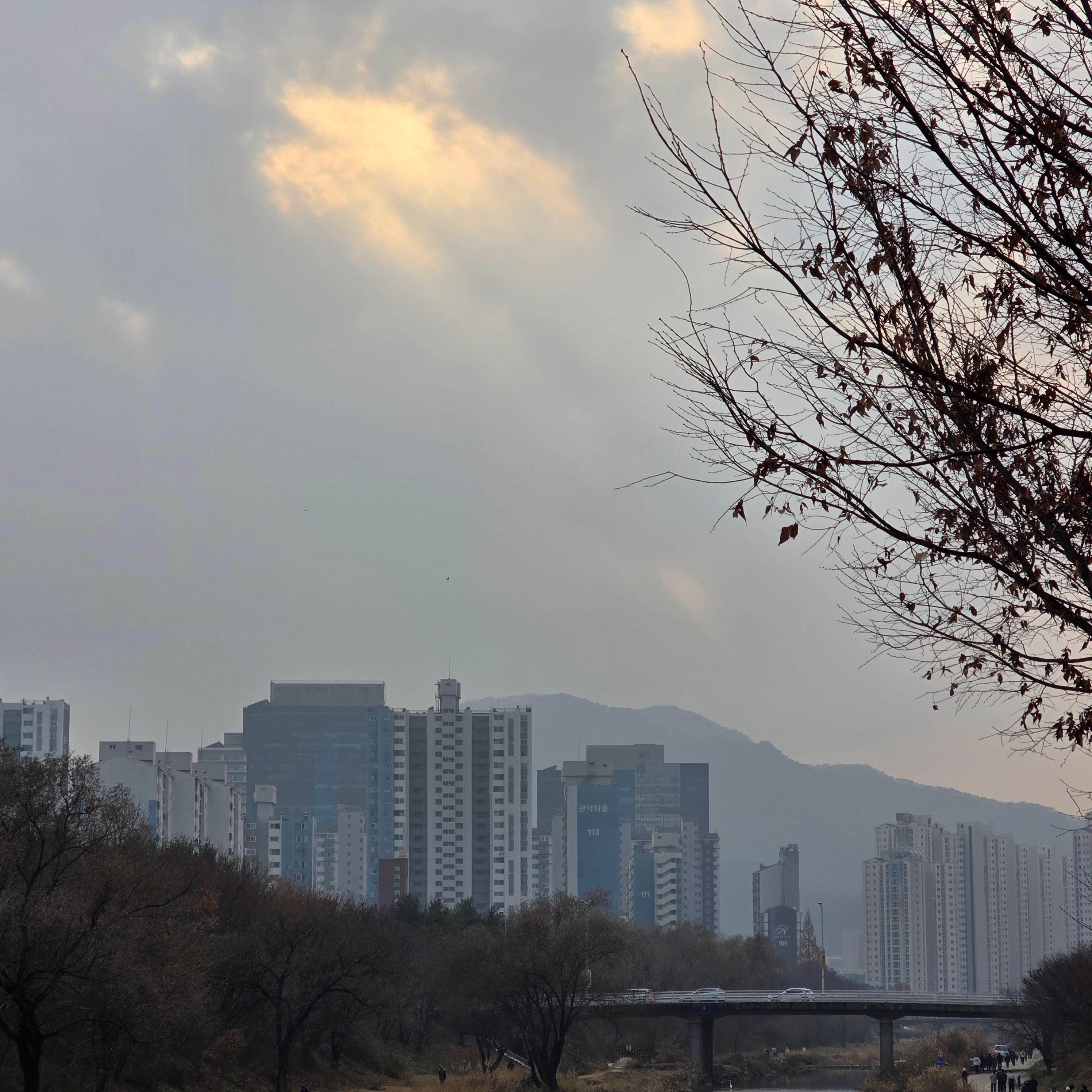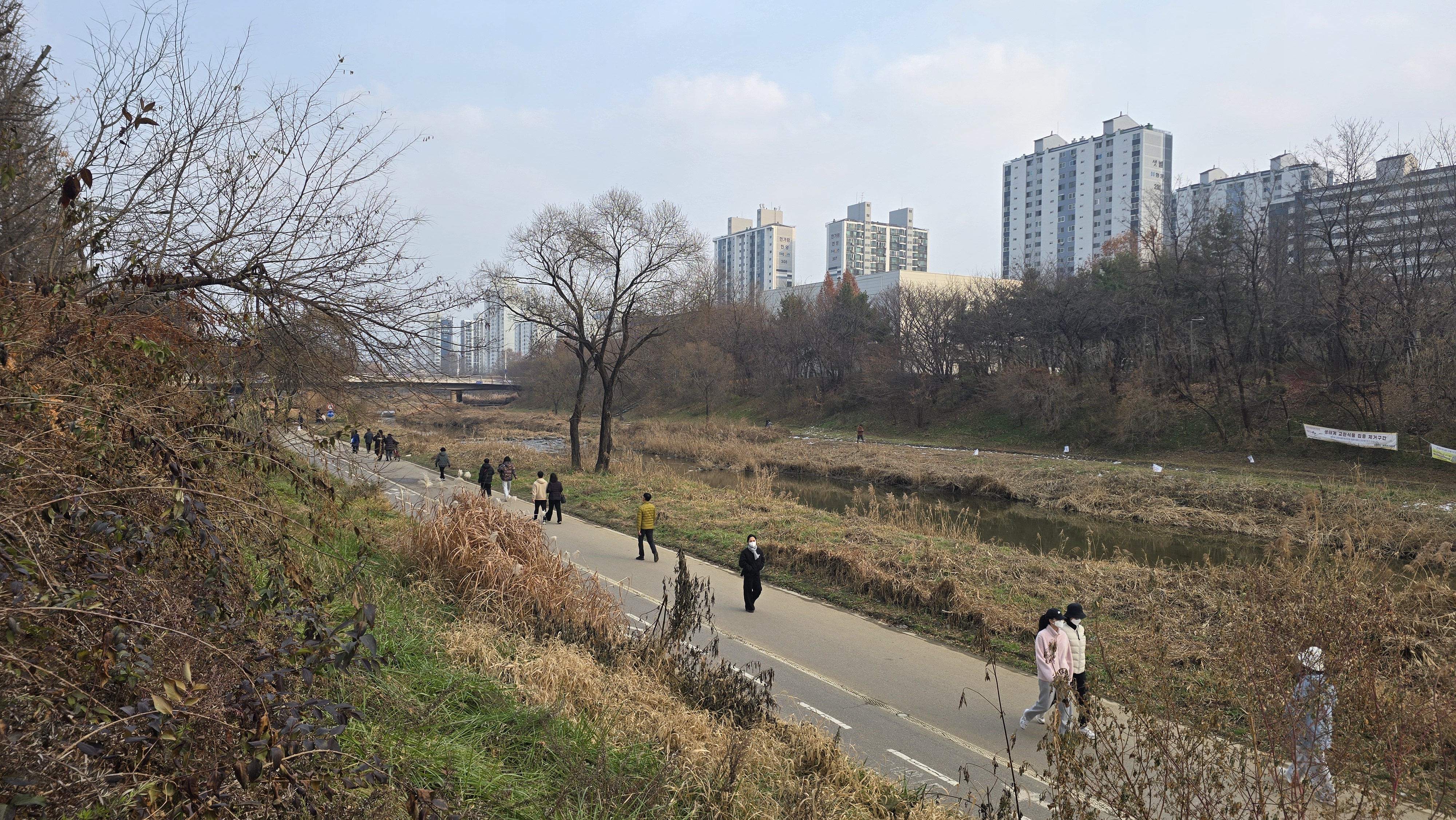 2025.12.07/ #도시기록 #안양 #학의천/ 가을과 겨울 사이 풍경. 하늘은 우증충하지만 노란 개나리꽃 피어난 포근한 날씨.