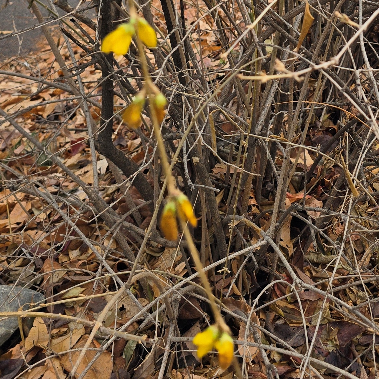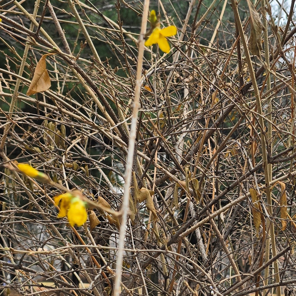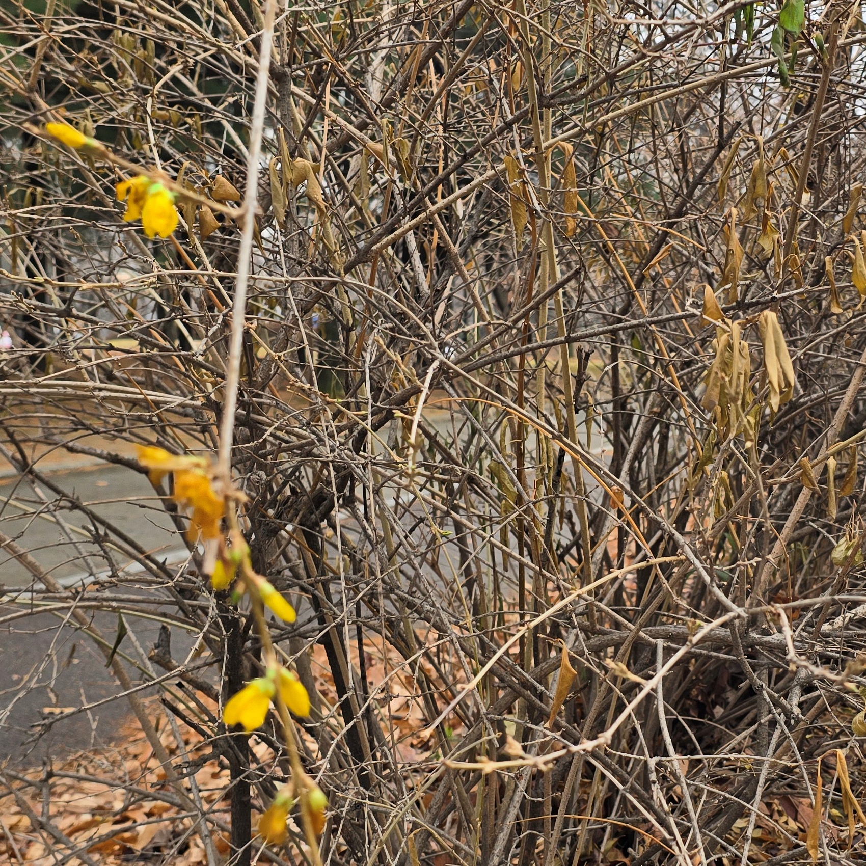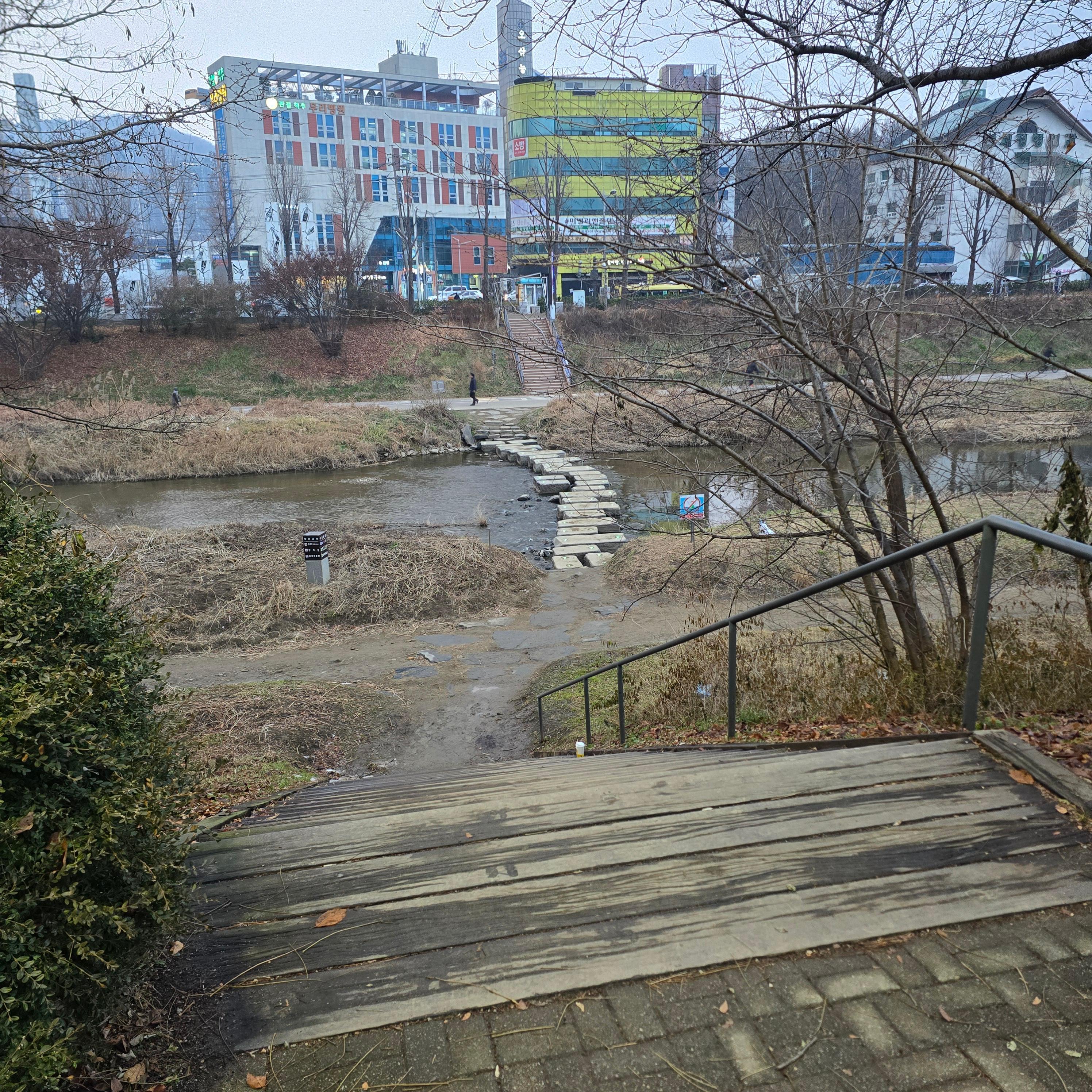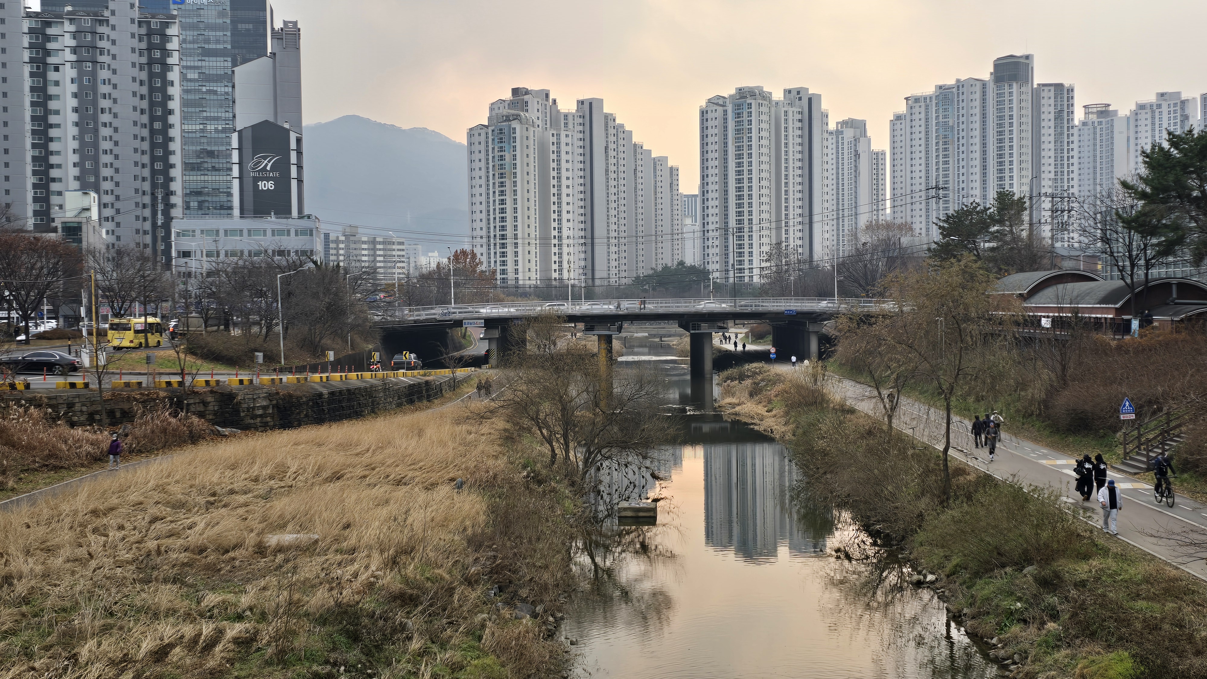 2025.12.07/ #도시기록 #안양 #학의천/ 가을과 겨울 사이 풍경. 하늘은 우증충하지만 노란 개나리꽃 피어난 포근한 날씨.