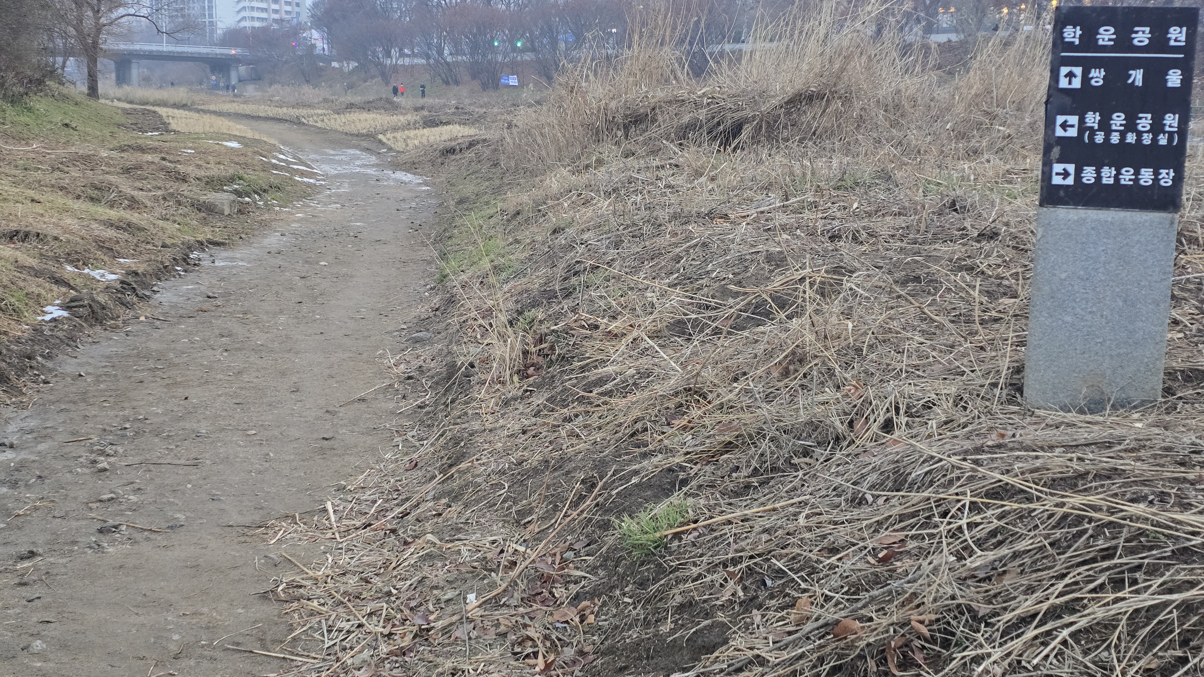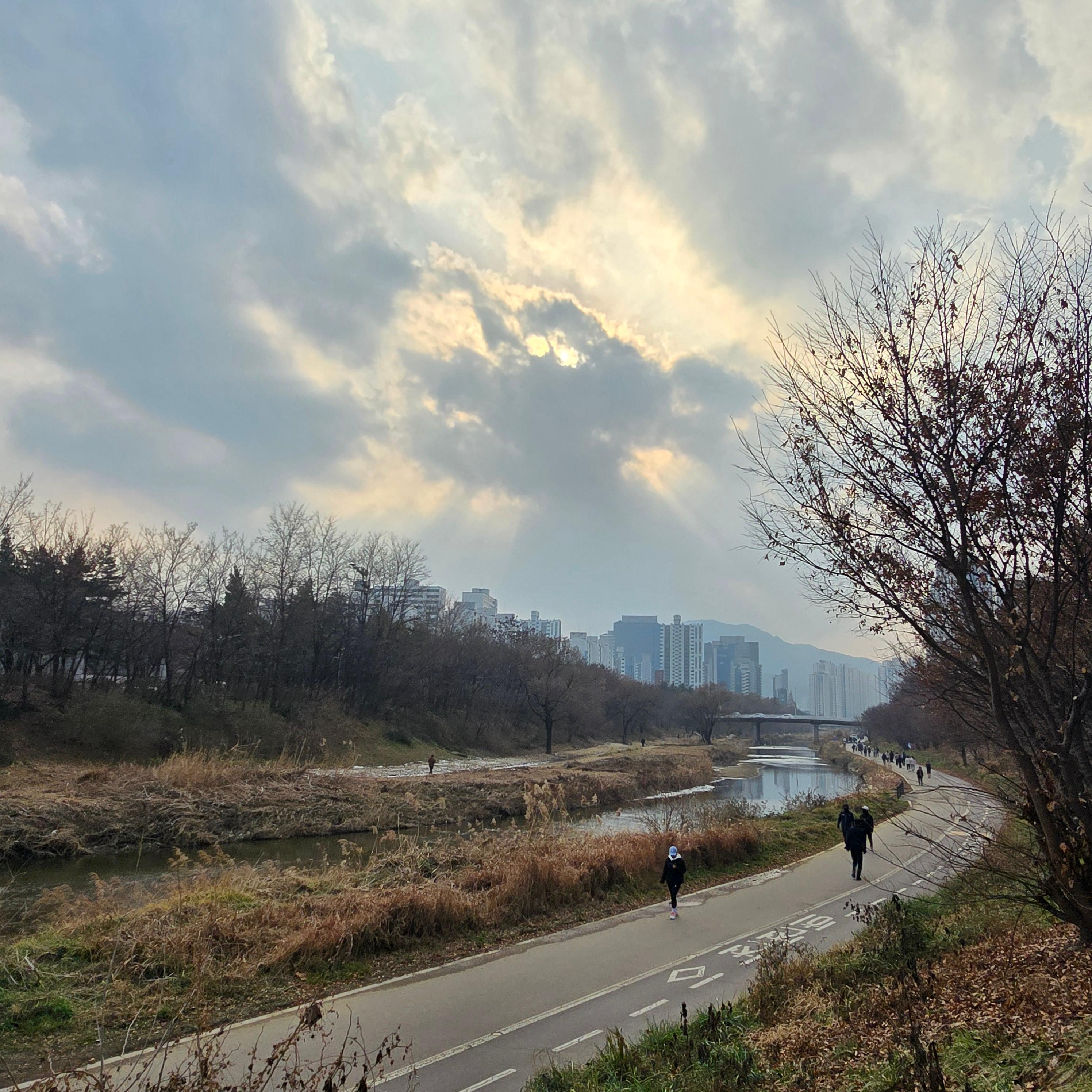 2025.12.07/ #도시기록 #안양 #학의천/ 가을과 겨울 사이 풍경. 하늘은 우증충하지만 노란 개나리꽃 피어난 포근한 날씨.