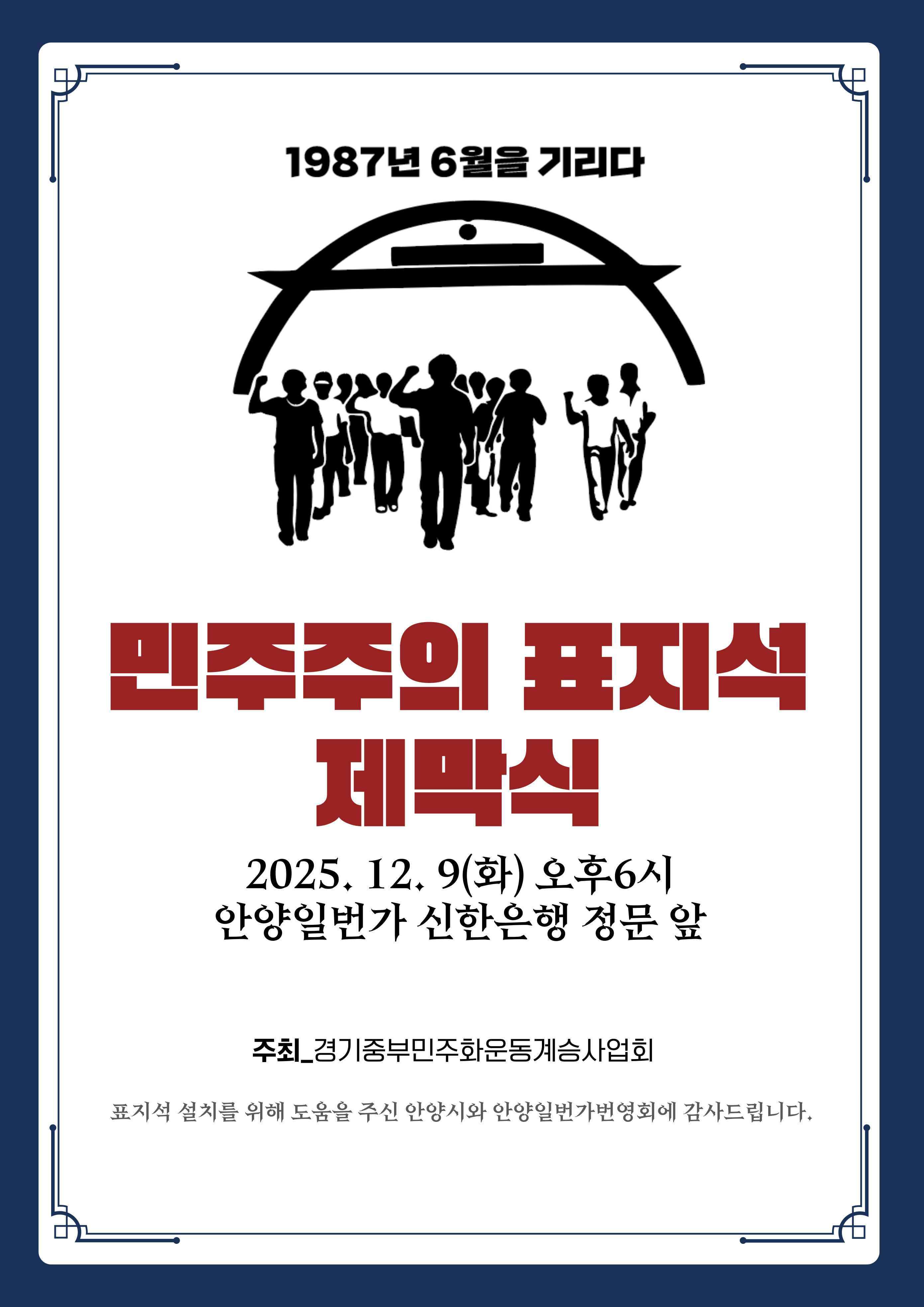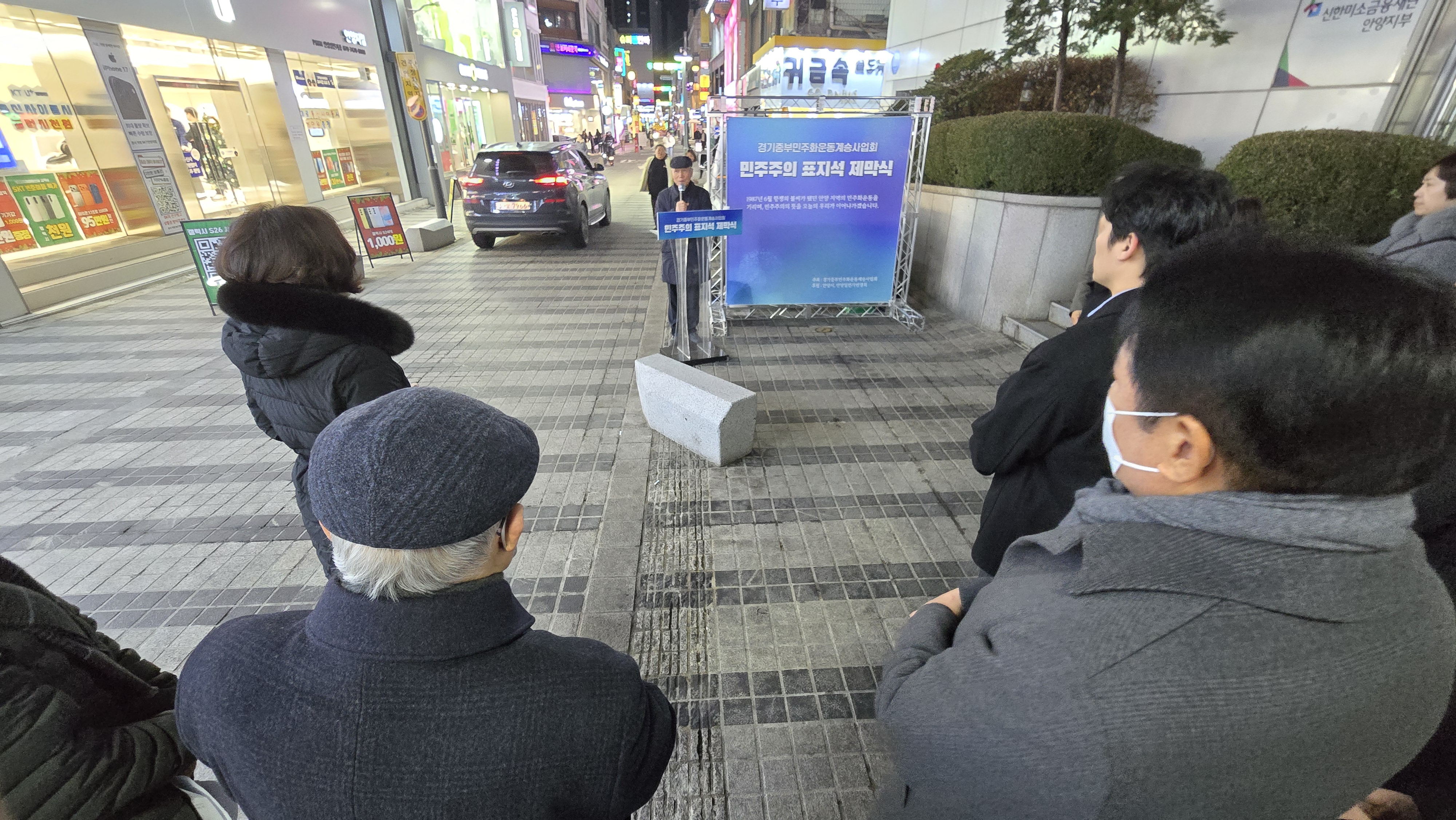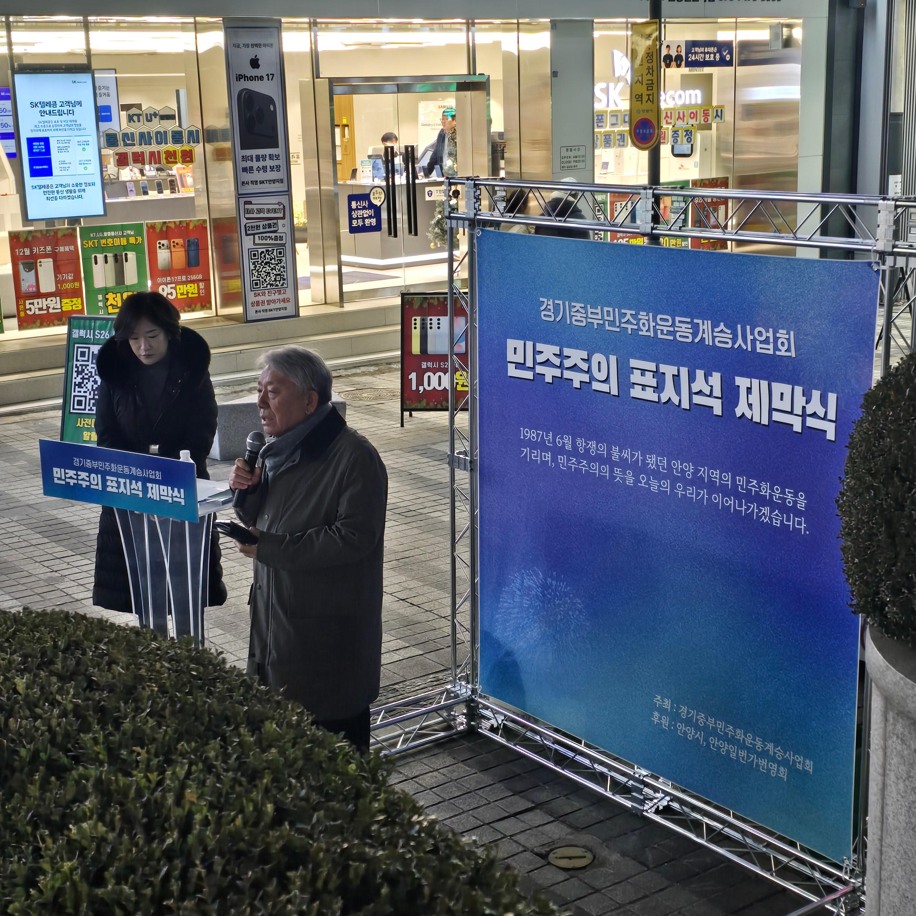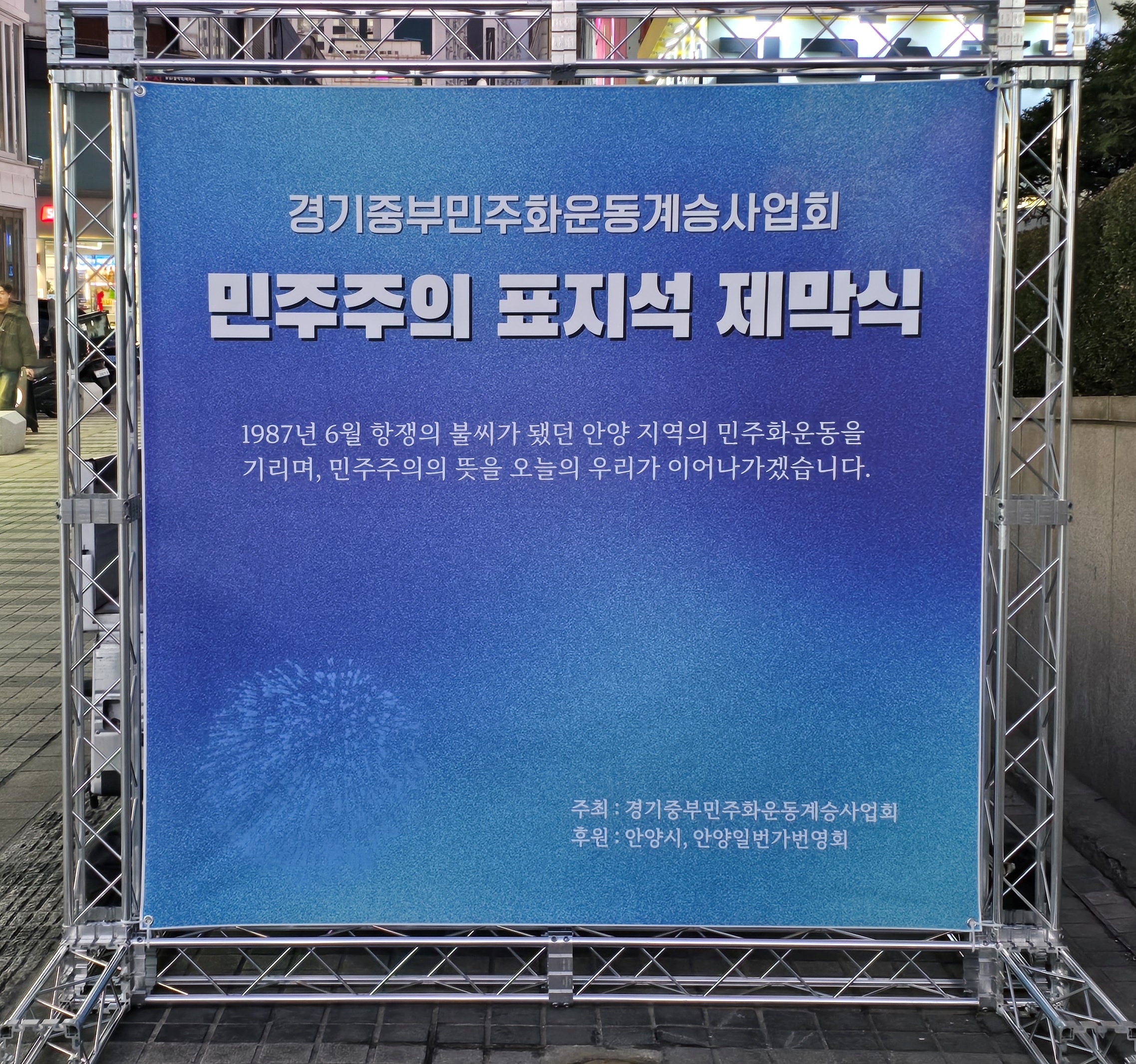 2025.12.09/ #도시기록 #안양 #민주주의 #표지석 #안양일번가/ 1987년 8월 안양지역로 최초로 수천명의 시민이 모여 "독재타도 #민주쟁취"를 외쳤던 역사적 현장인 안양일번가 입구 신한은행앞에 경기중부민주화운동계승사업회에서 설치한 민주주의 표지석이 세워져 2025년 12월 9일 오후6시 제막식을 가졌다.