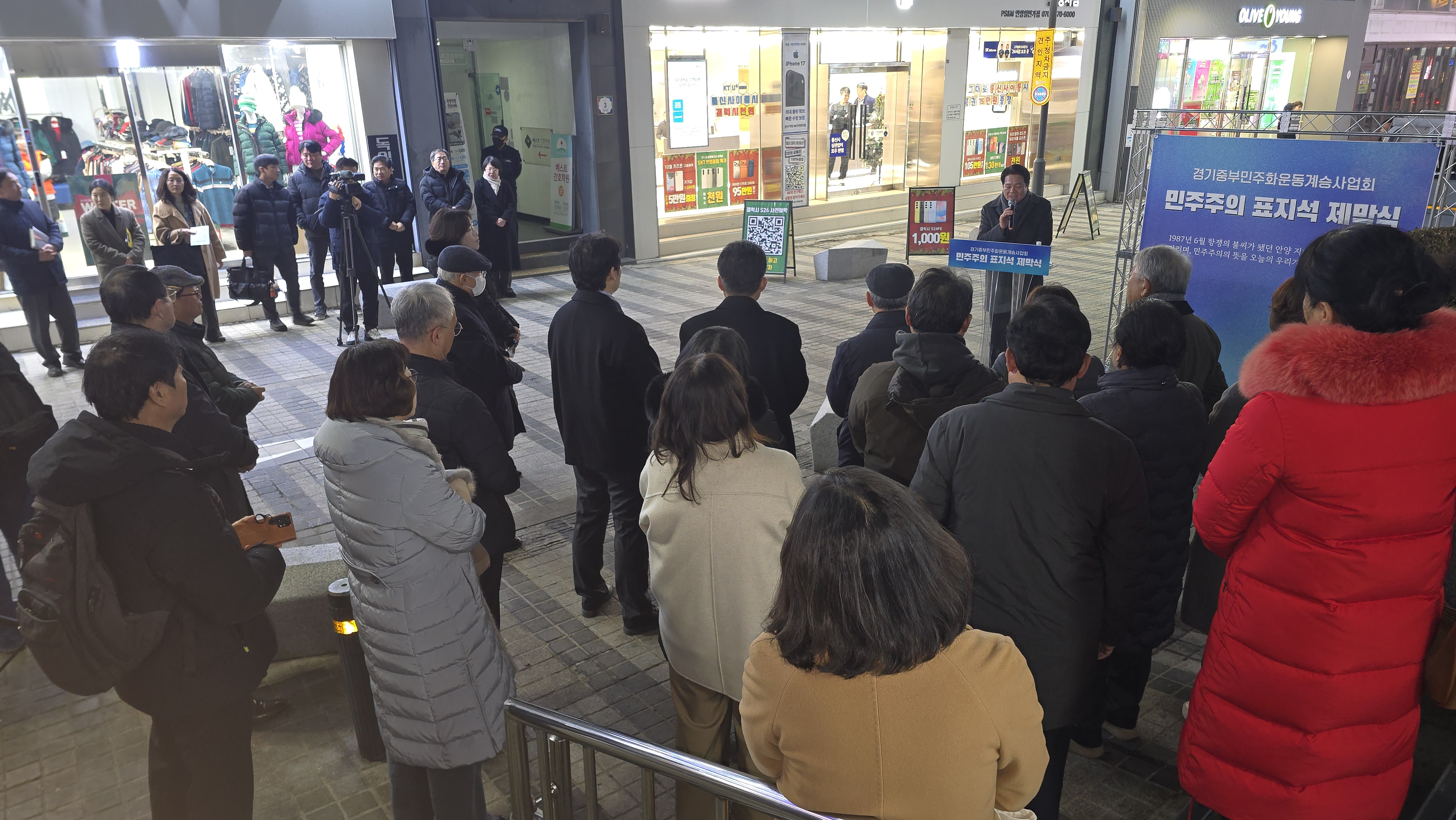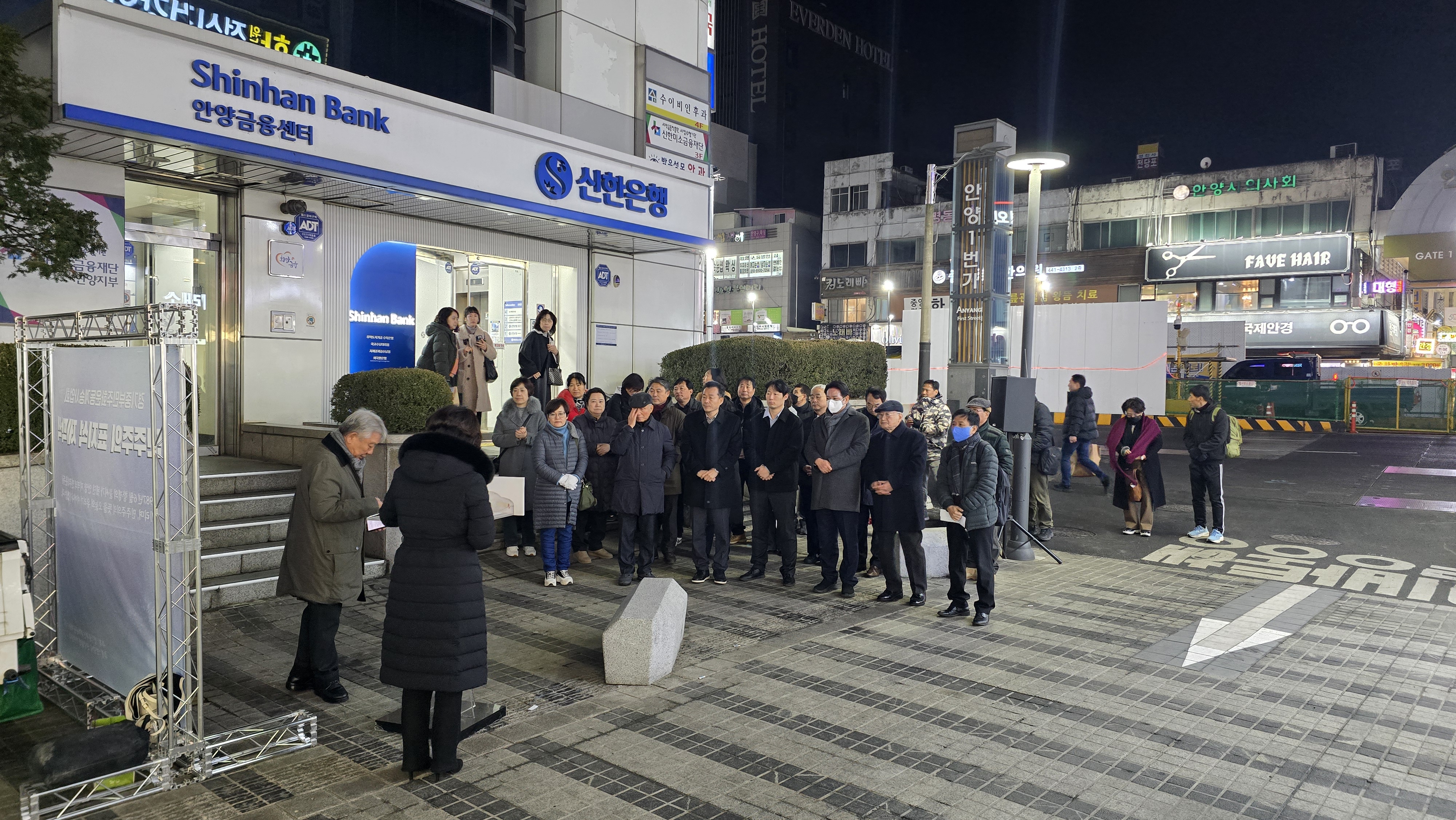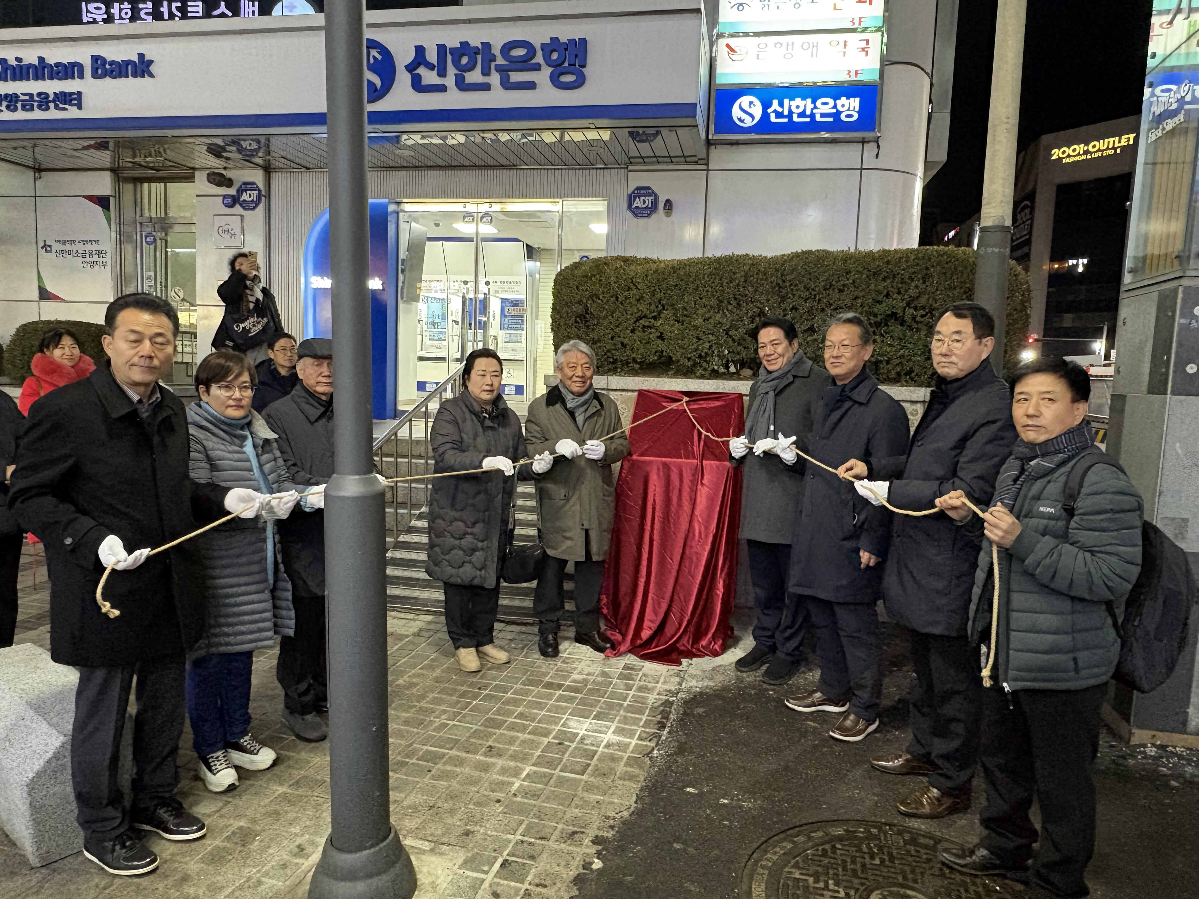 2025.12.09/ #도시기록 #안양 #민주주의 #표지석 #안양일번가/ 1987년 8월 안양지역로 최초로 수천명의 시민이 모여 "독재타도 #민주쟁취"를 외쳤던 역사적 현장인 안양일번가 입구 신한은행앞에 경기중부민주화운동계승사업회에서 설치한 민주주의 표지석이 세워져 2025년 12월 9일 오후6시 제막식을 가졌다.