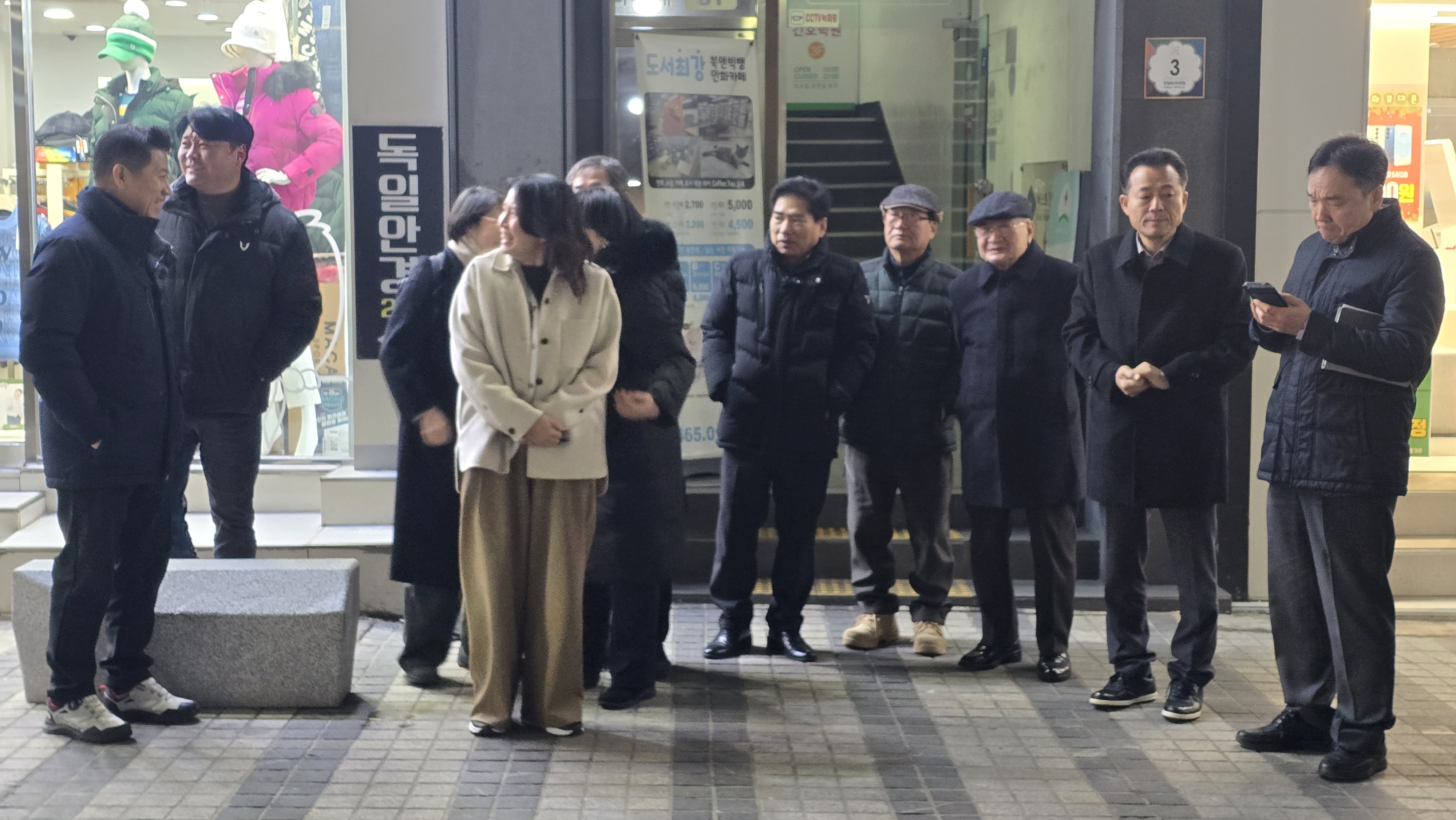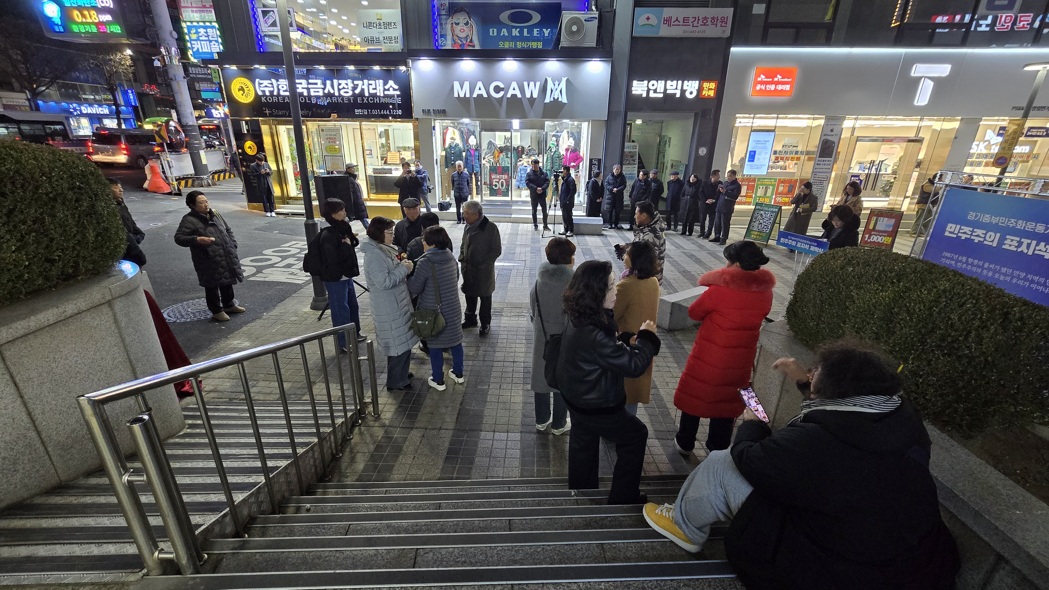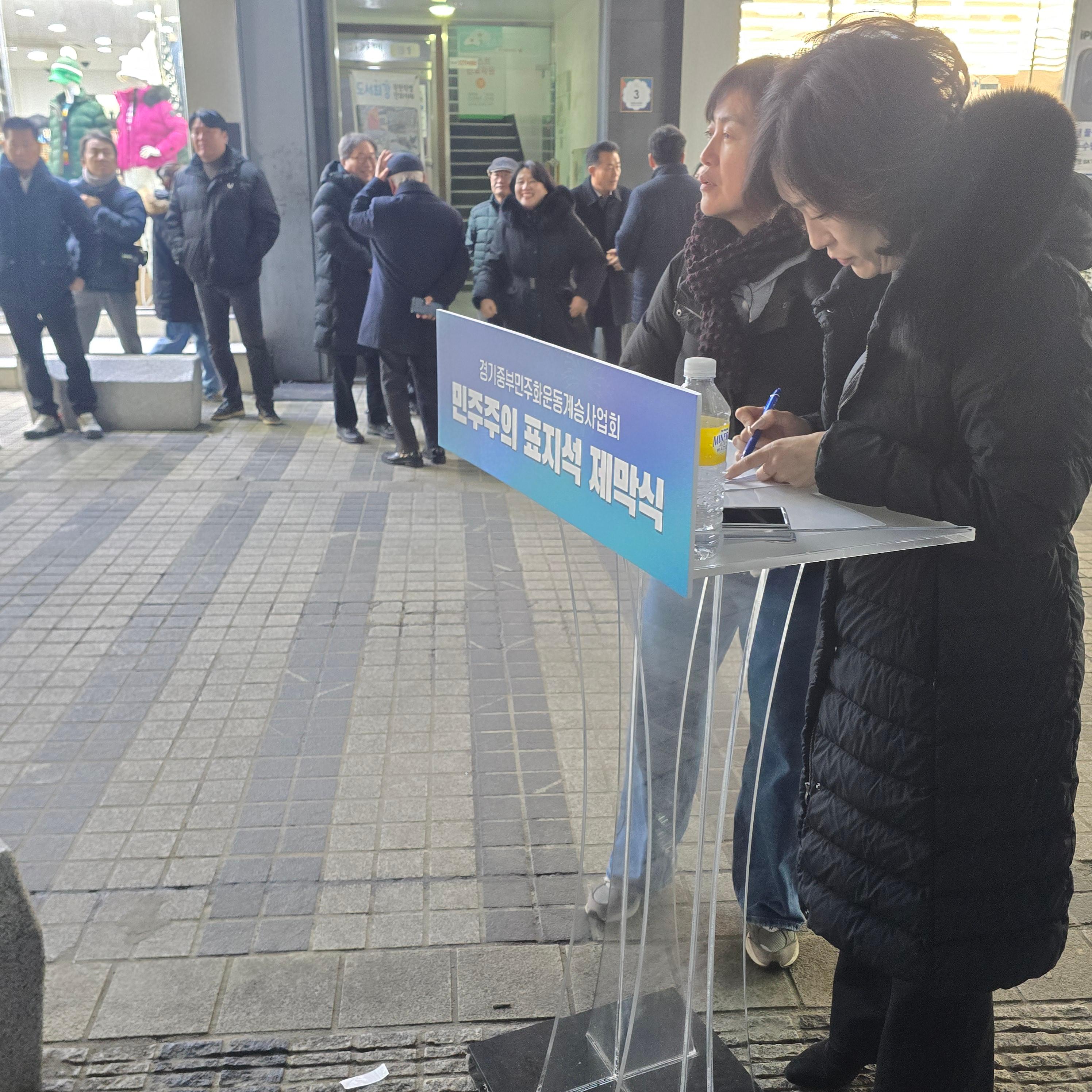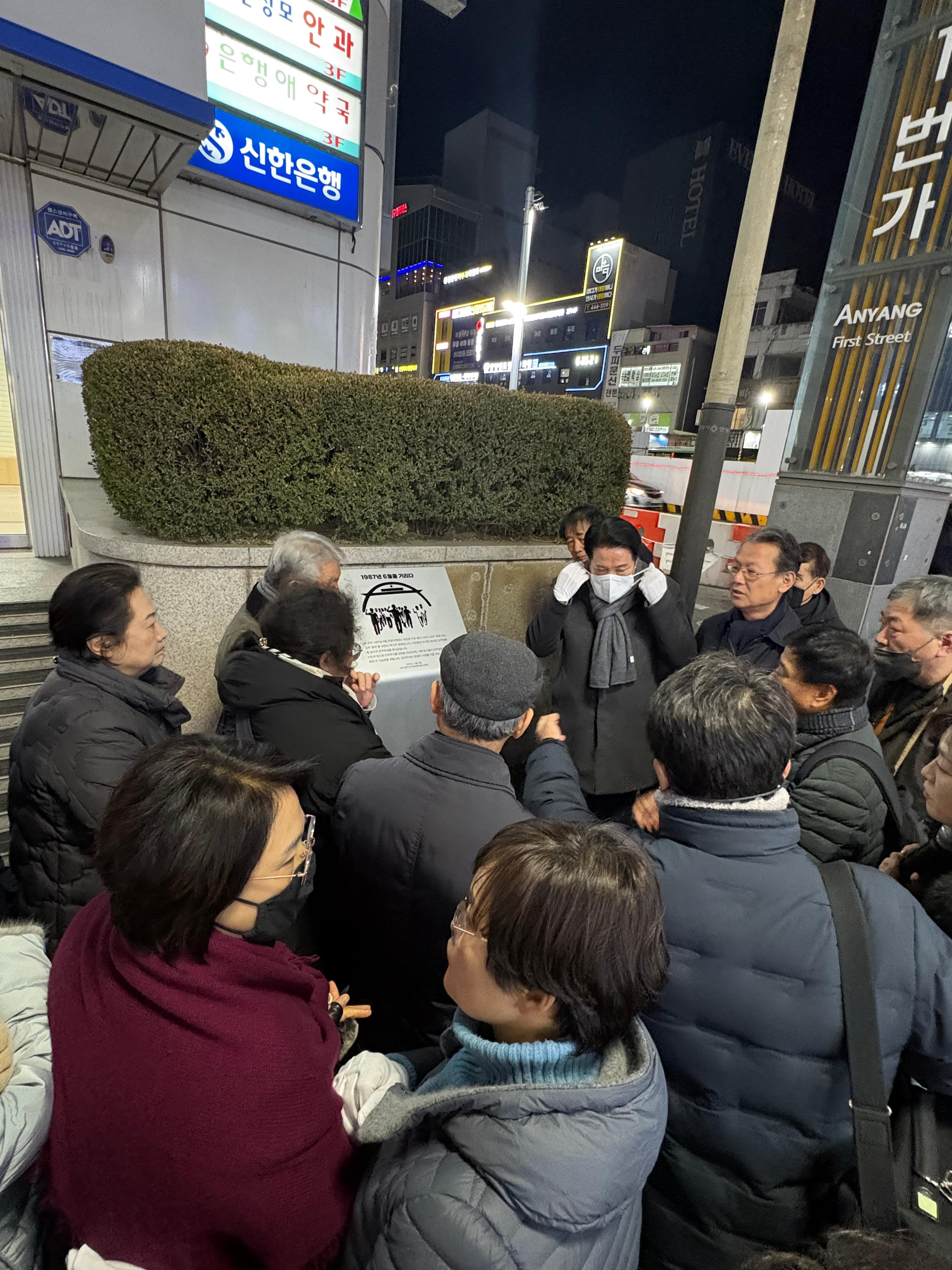 2025.12.09/ #도시기록 #안양 #민주주의 #표지석 #안양일번가/ 1987년 8월 안양지역로 최초로 수천명의 시민이 모여 "독재타도 #민주쟁취"를 외쳤던 역사적 현장인 안양일번가 입구 신한은행앞에 경기중부민주화운동계승사업회에서 설치한 민주주의 표지석이 세워져 2025년 12월 9일 오후6시 제막식을 가졌다.