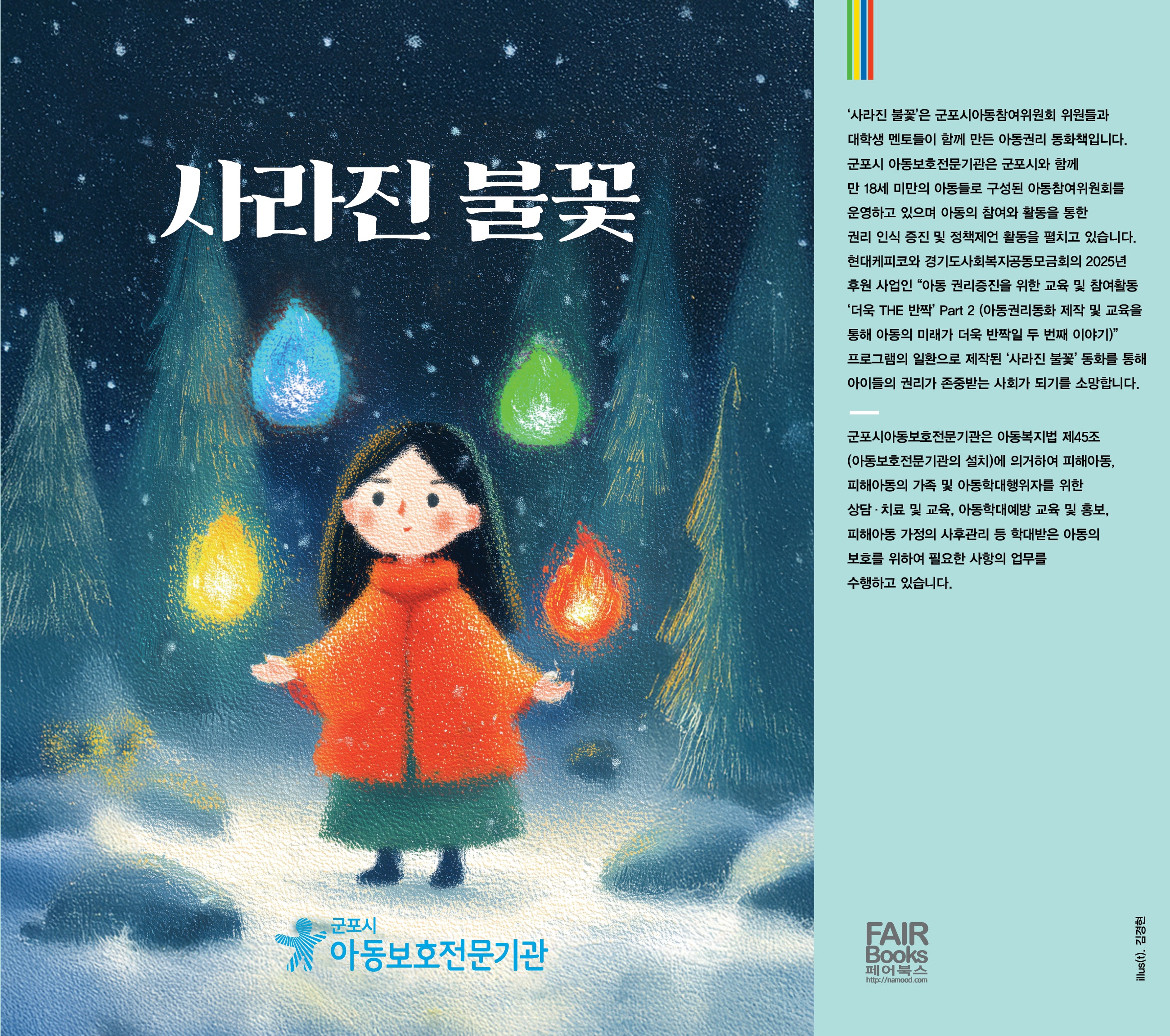 군포시 2025년 아동참여위원회 아동 위원과 대학생 멘토들이 6개월간 협력하여 아동의 시각에서 권리와 존중의 메시지를 담은 아동권리 동화 “사라진 불꽃”을 발간됐다.