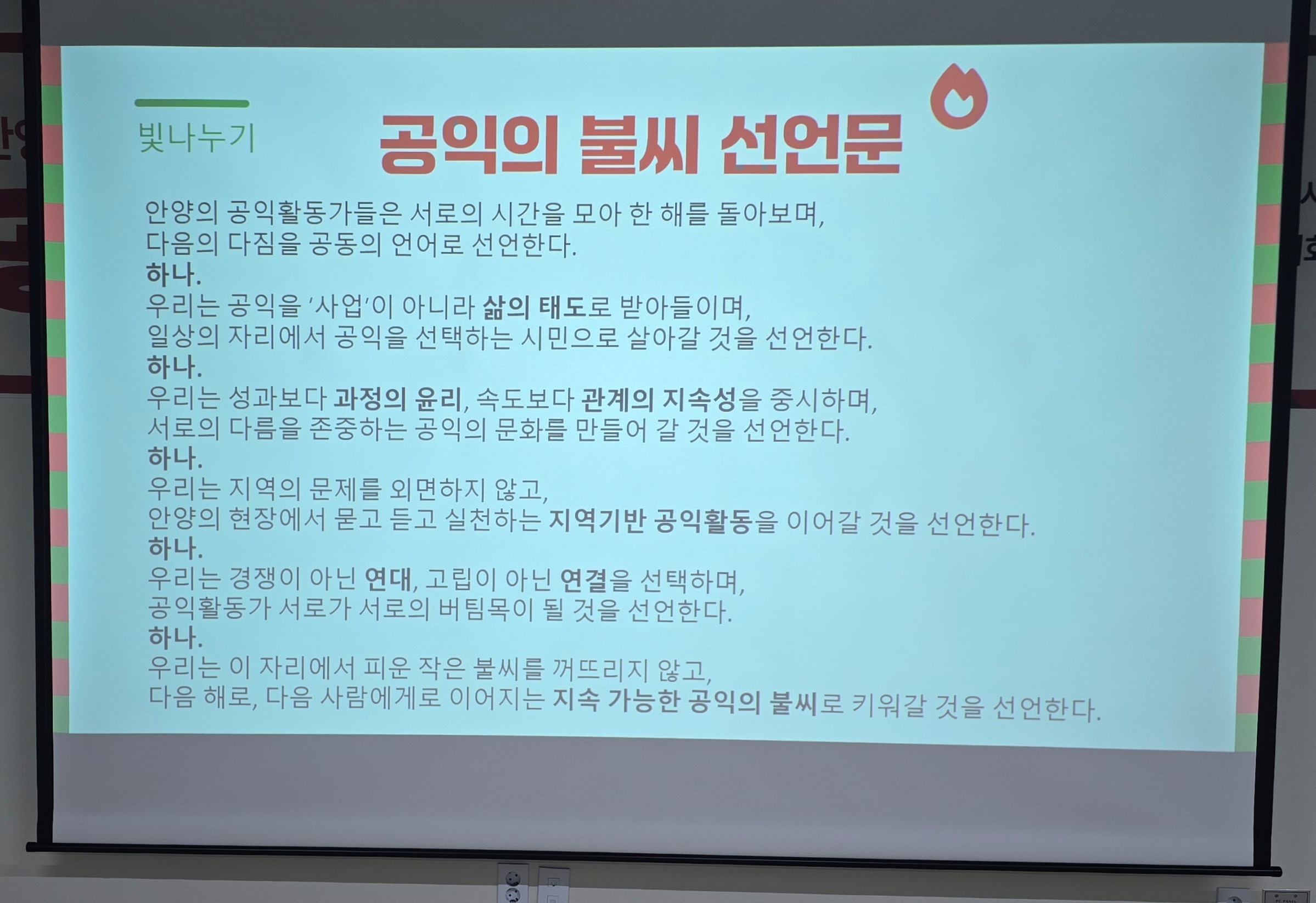안양시공익활동지원센터(이하 센터)가 지난 12월 17일(수), 센터 대회의실에서「안양시 공익활동 네트워크 컨퍼런스 - 공익의 불씨」를 개최했다.