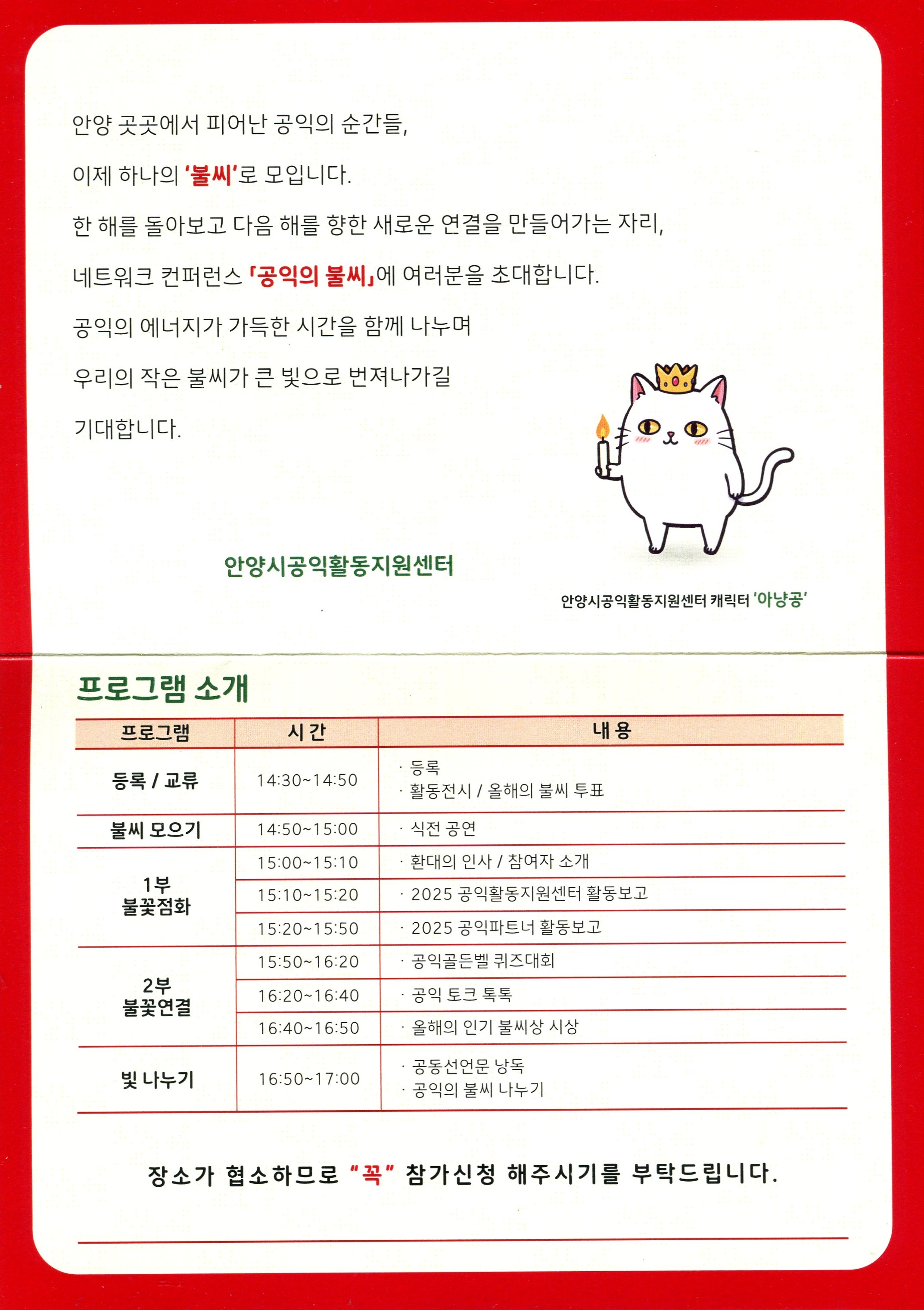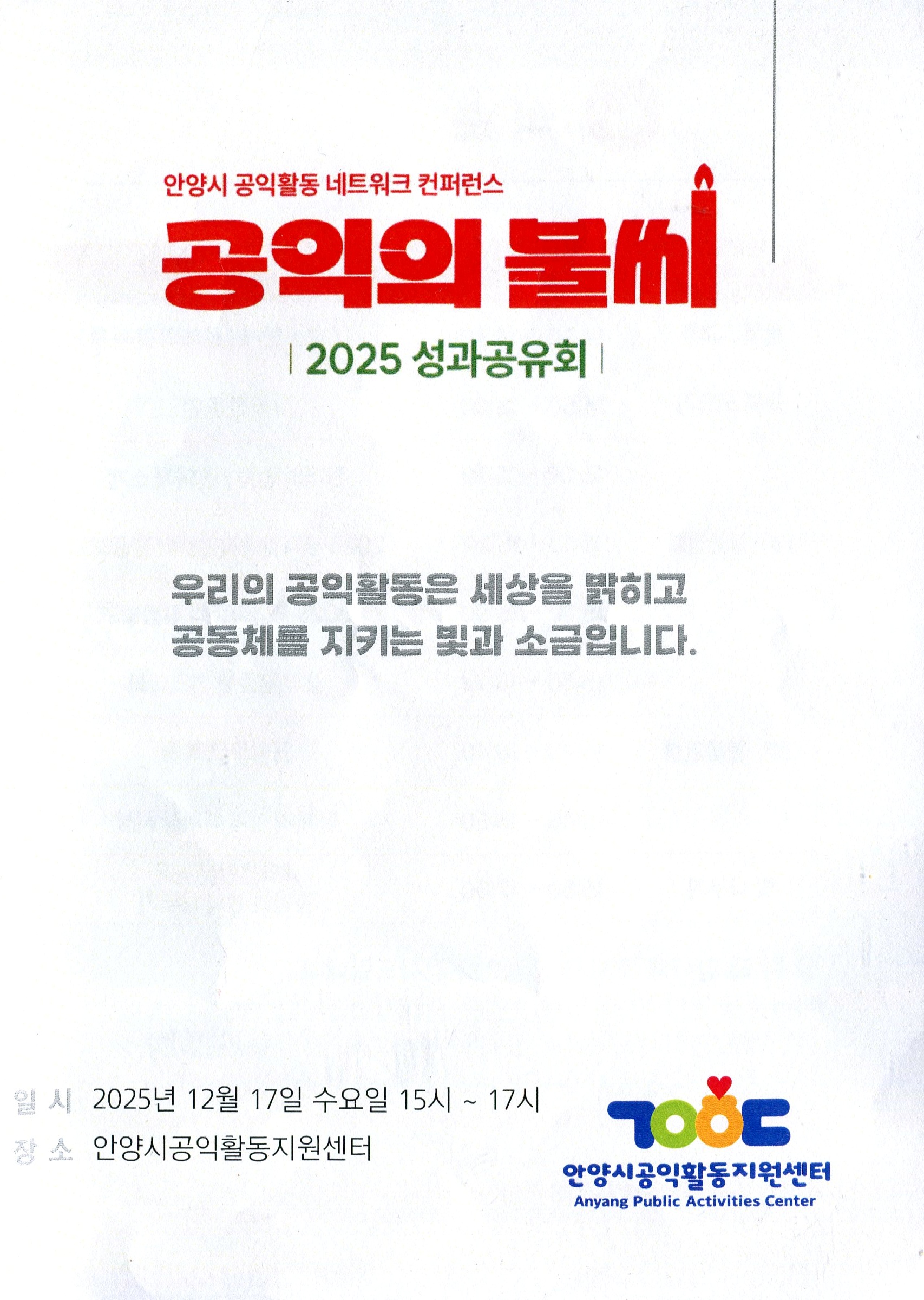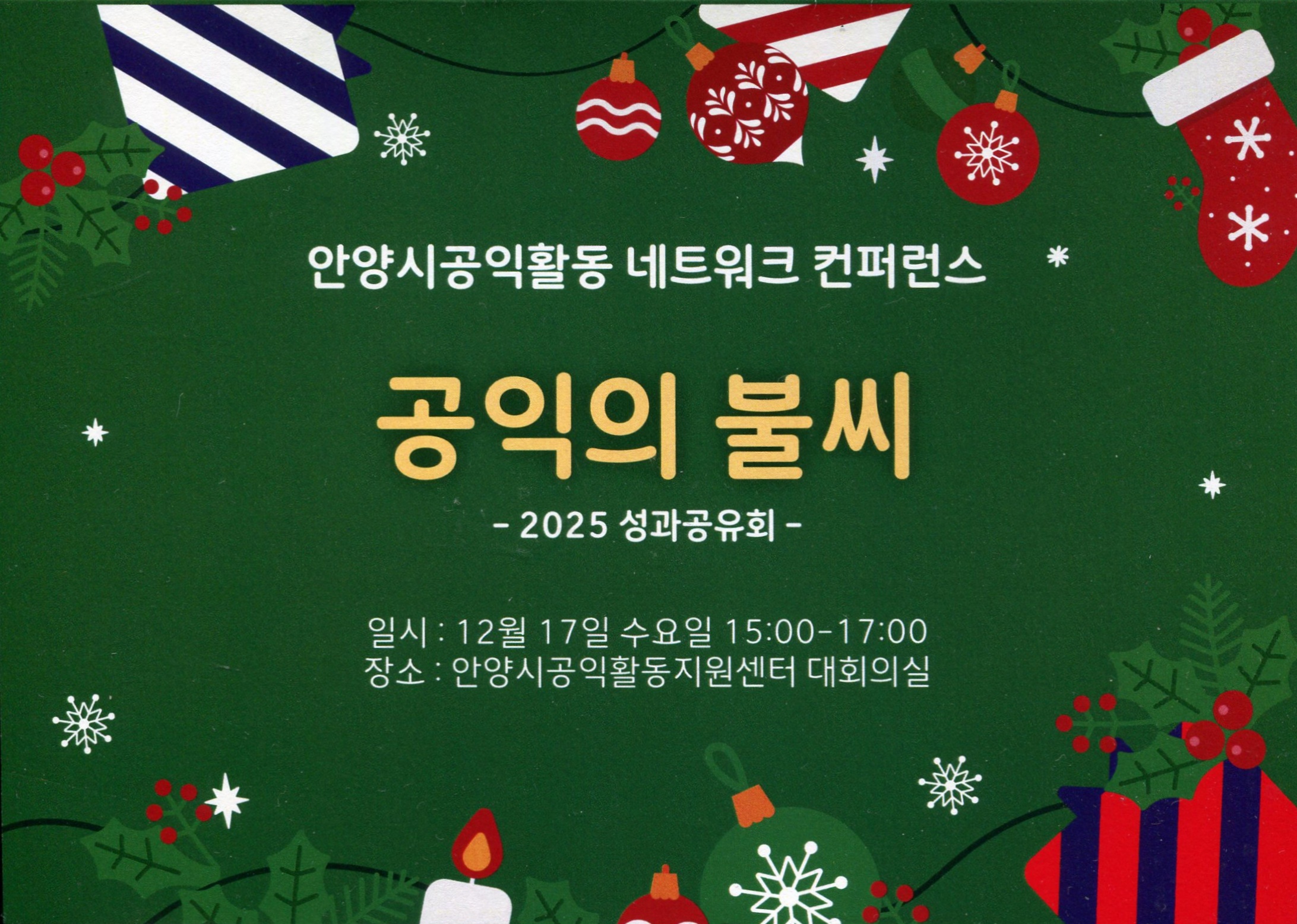 안양시공익활동지원센터(이하 센터)가 지난 12월 17일(수), 센터 대회의실에서「안양시 공익활동 네트워크 컨퍼런스 - 공익의 불씨」를 개최했다.