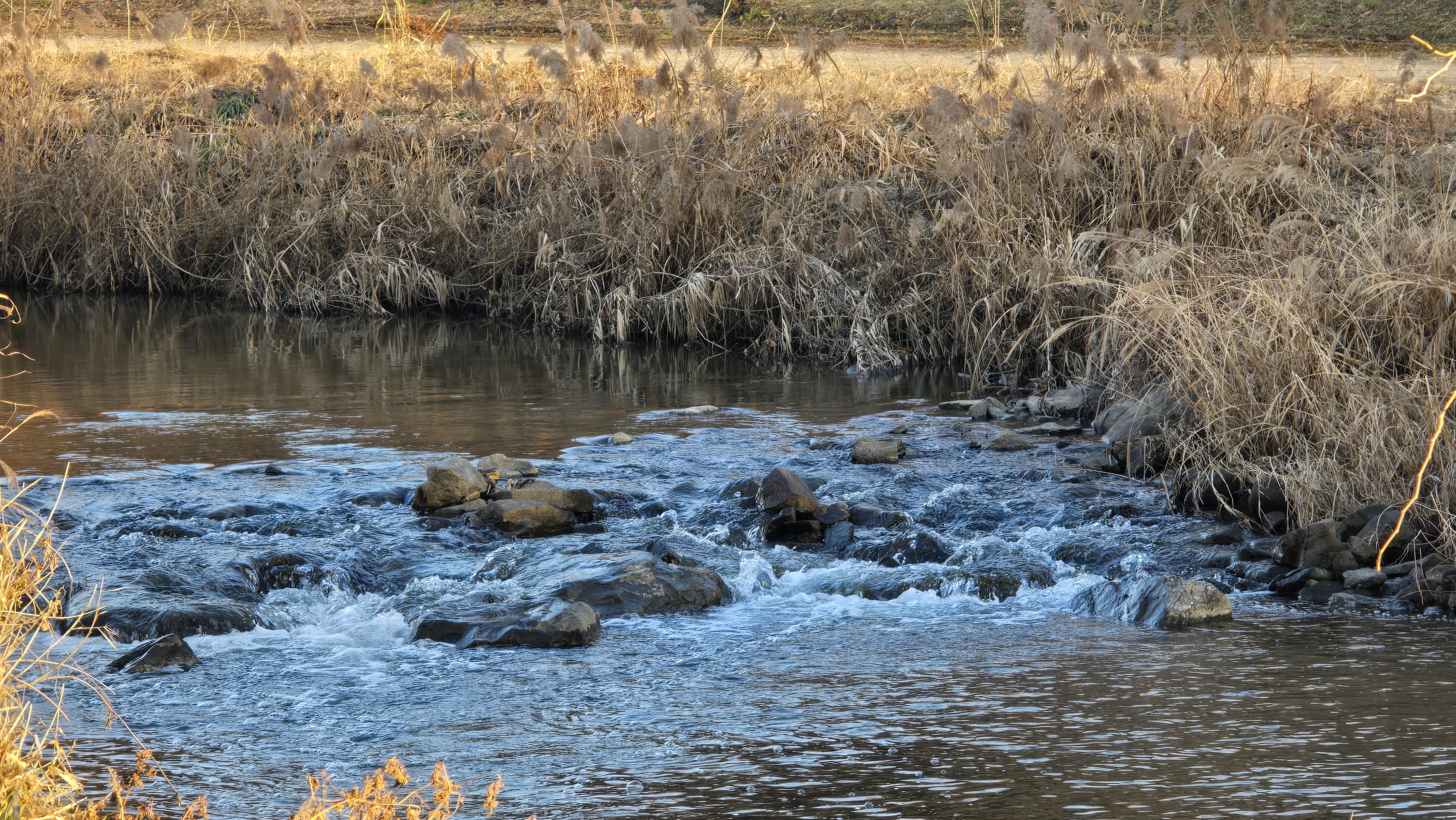2025.12.21/ #도시기록 #얀양 #학의천 #여울/ 비산인도교와 학운교 중간에 위치한 시원한 물소리 들려주는 여울. 여울 아래에는 송사리 등 작은 물고기들과 메기, 자라 등 많은 물고기들이 노닌다. 더불어 쇠백로, 중대백로, 왜가리, 민물가마우지, 논병아리 등 각종 새들도 찾아온다.