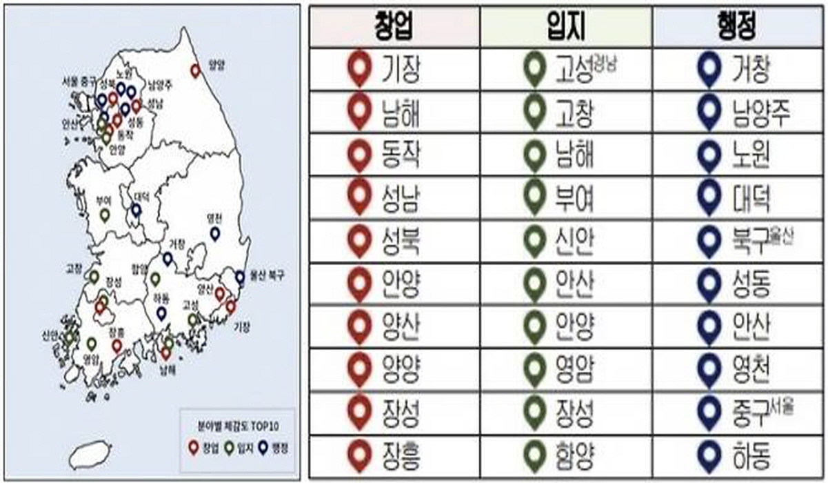 '창업 우수지역'에는 경기도의 안양 성남을 비롯 서울 동작·성북, 강원 양양, 경남 남해·양산, 부산 기장, 전남 장성·장흥 등이 톱 10에 선정됐으며 '입지 분야'에는 경기도의 안양, 안산을 비롯 충남 부여, 경남 고성·남해·함양, 전남 신안·영암·장성, 전북 고창 등이 톱 10에, '행정 편의성 우수지역에는 경기도의 안산, 남양주를 비롯 경남 거창·하동, 경북 영천, 대전 대덕, 울산 북구, 서울 노원·성동·중구 등이 톱 10에 이름을 올렸다.