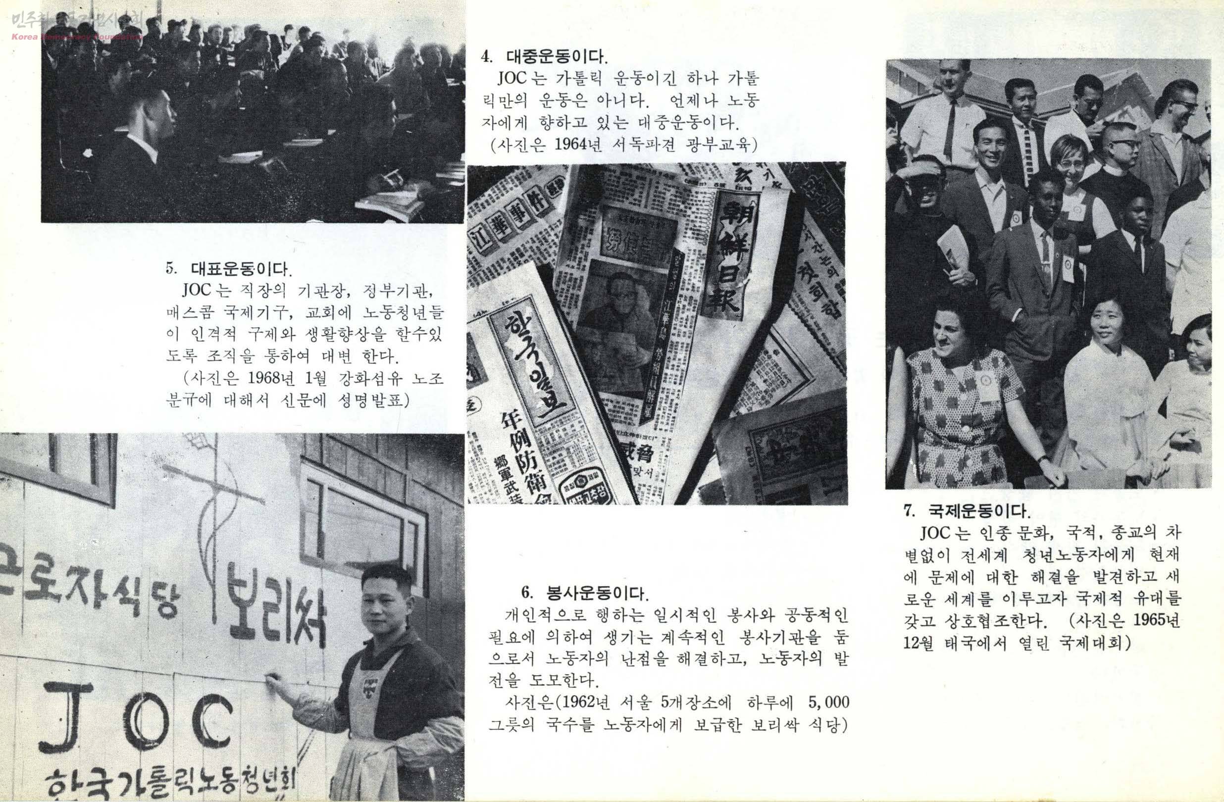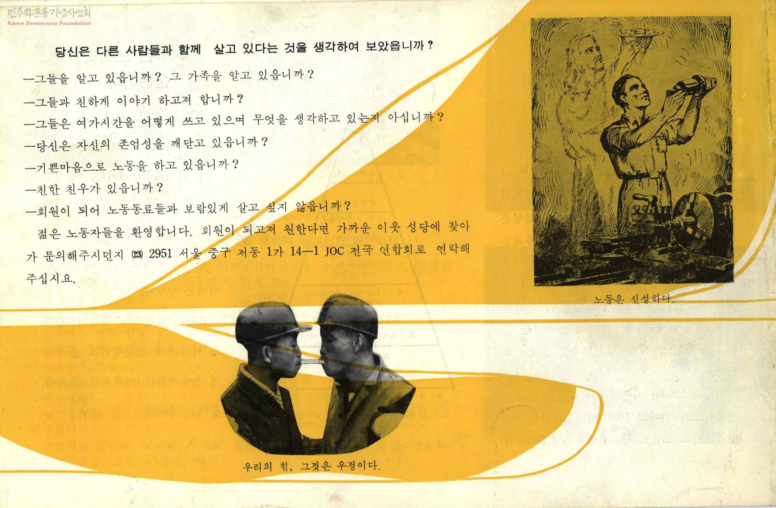 ‘가톨릭노동청년회(JOC·가노청)’하면 떠오르는 것이 1970~80년대 치열했던 청년 노동운동의 역사다. 가노청이 설립된 1958년으로부터 약 반세기가 지난 지금, 이 땅의 노동현실은 참 많이도 변했다. 군부 독재정권 하에서 민주노조운동에 동참하면서 복음화 방식에 대한 의견차로 갈등을 겪기도 했지만, 한국사회의 노동 현실을 개선하고 노동 영성의 불꽃을 뜨겁게 타오르게 했던 것만큼은 변하지 않는 사실이다.
