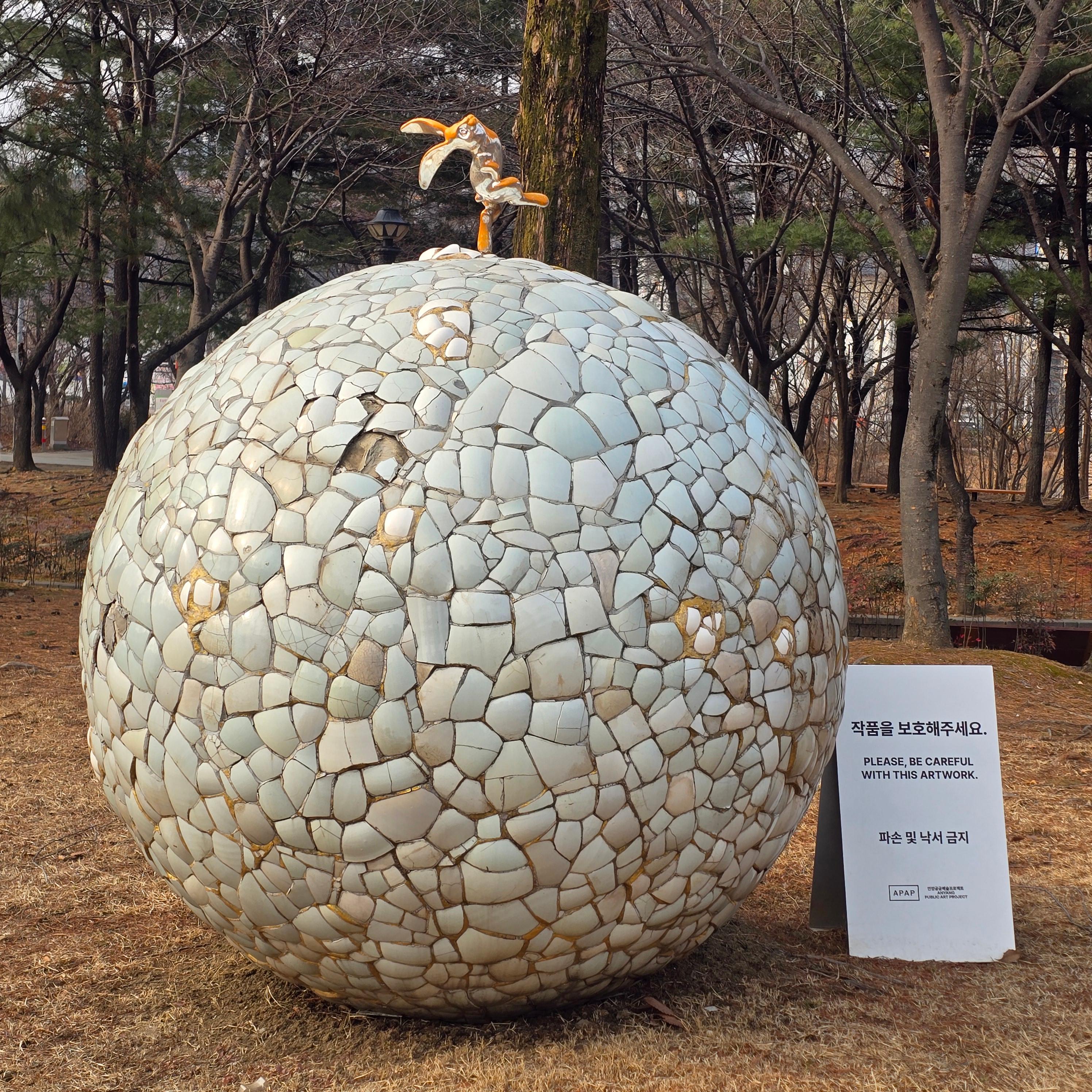 도자기 파편을 덧붙이고 금분, 브론즈로 만든 이 작품은 2007년 설치된후 세월이 지나면서 이곳저곳이 부분적으로 훼손됐다.