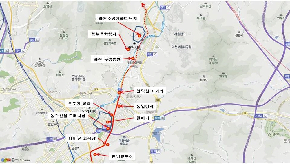 제가 서울을 오가던 길 중에서는 북문운동장에서, 송죽동, 파장동, 고천동, 오전동과 안양교도소 인근인 호계3동까지가 국도 1호선 구간이었네요.