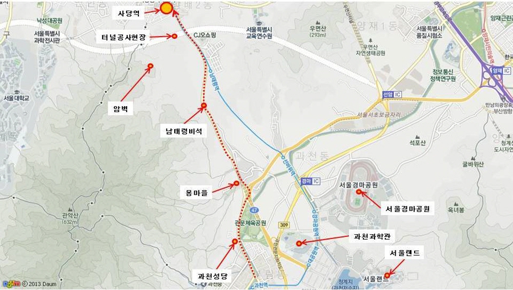 하여간 남태령을 넘어가는 길이 수원이나 경기지역으로 나가는 관문역할을 했었기 때문에 주변의 산들을 깎아서 길이 점점 더 넓어지기 시작했었는데요.