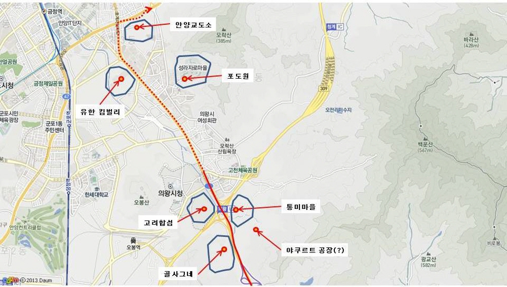지금 이야기하고 있는 동네들을 지도에 표시해본 것인데 이제 수원 경계를 넘어와서 안양 이전에 의왕시를 지나가고 있는 중이지요.