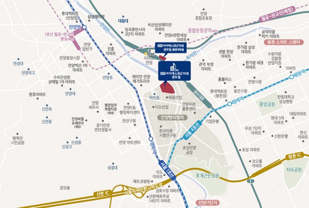 A동, B동(지식산업센터)과 C동(기숙사) 3개동으로 세워진 안양 아이에스 비즈타워는 스트리트형 상가와 지식산업센터, 기숙사로 구성하고 다양한 지원시설등으로 원스톱 비즈니스가 가능한 공간이며 건물밖으로 나오지 않아도 모든것이 해결 가능한 작은 도시 같은 곳이다,
