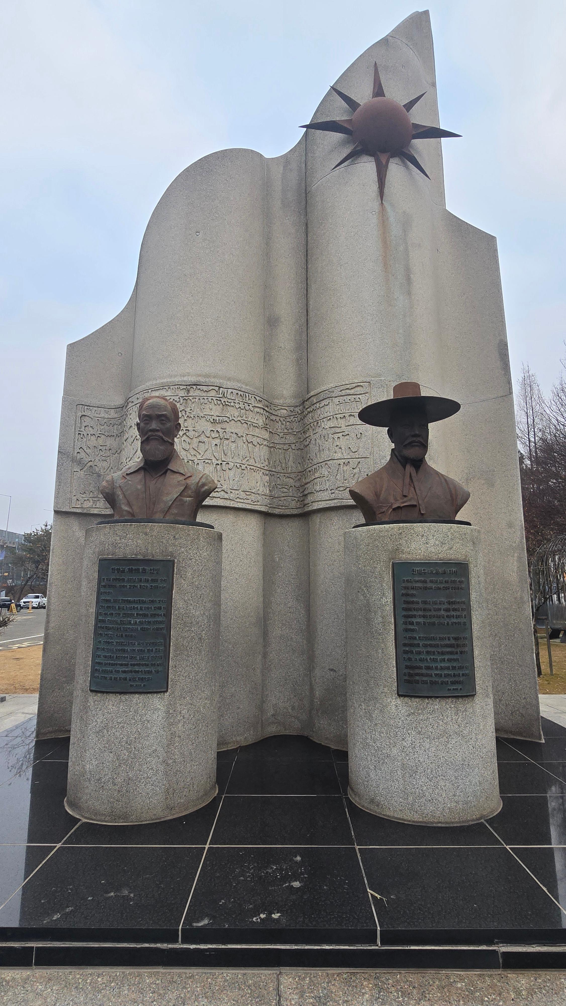 2026.02.13/ #도시기록 #안양 #에국지사 #자유공원/ 안양시 평촌 자유공원에는 항일애국지사인 한항길 선생과 원태우 의사, 이재천·이재현 지사의 흉상과 동상 등 기념조형물이 설치돼 있다.