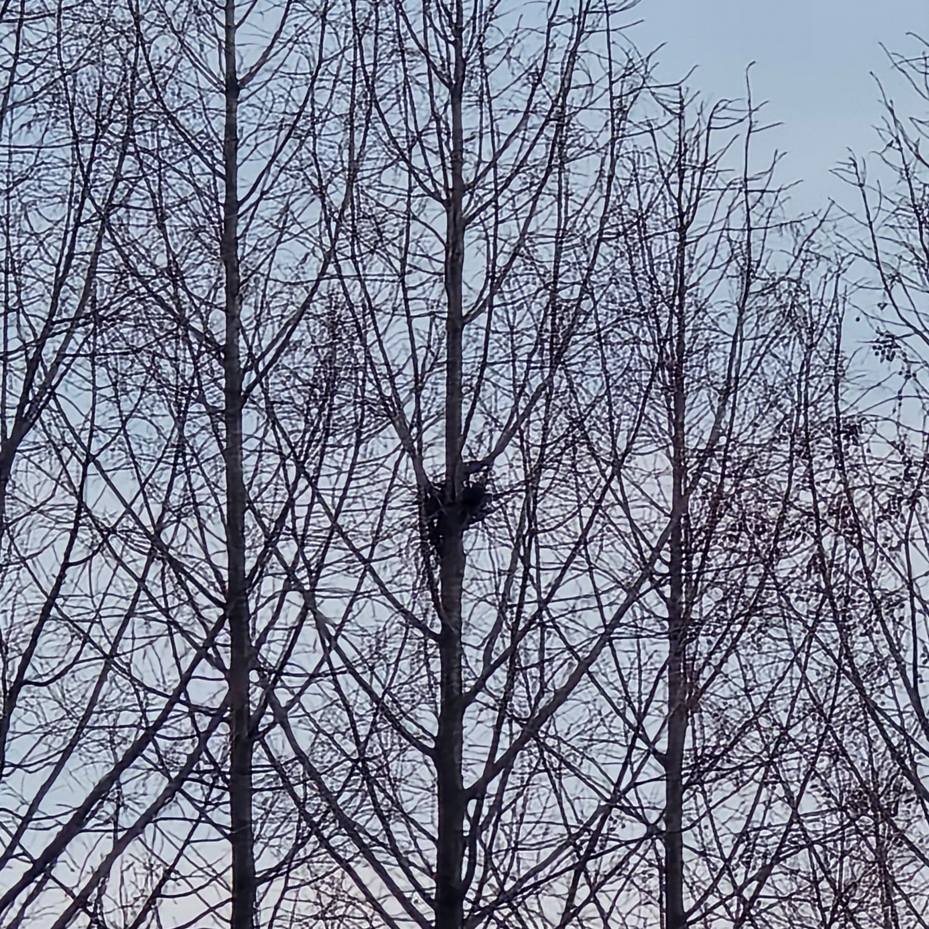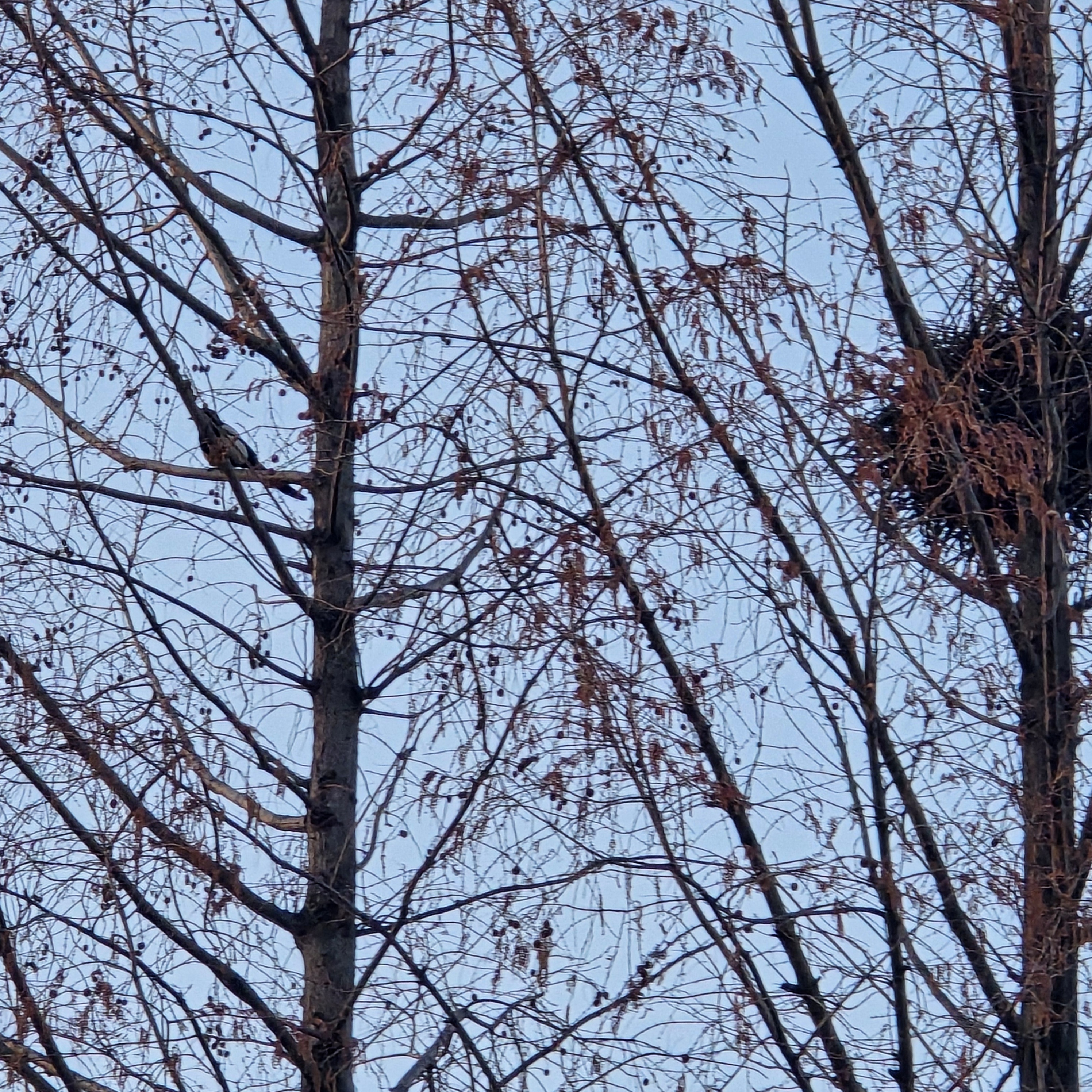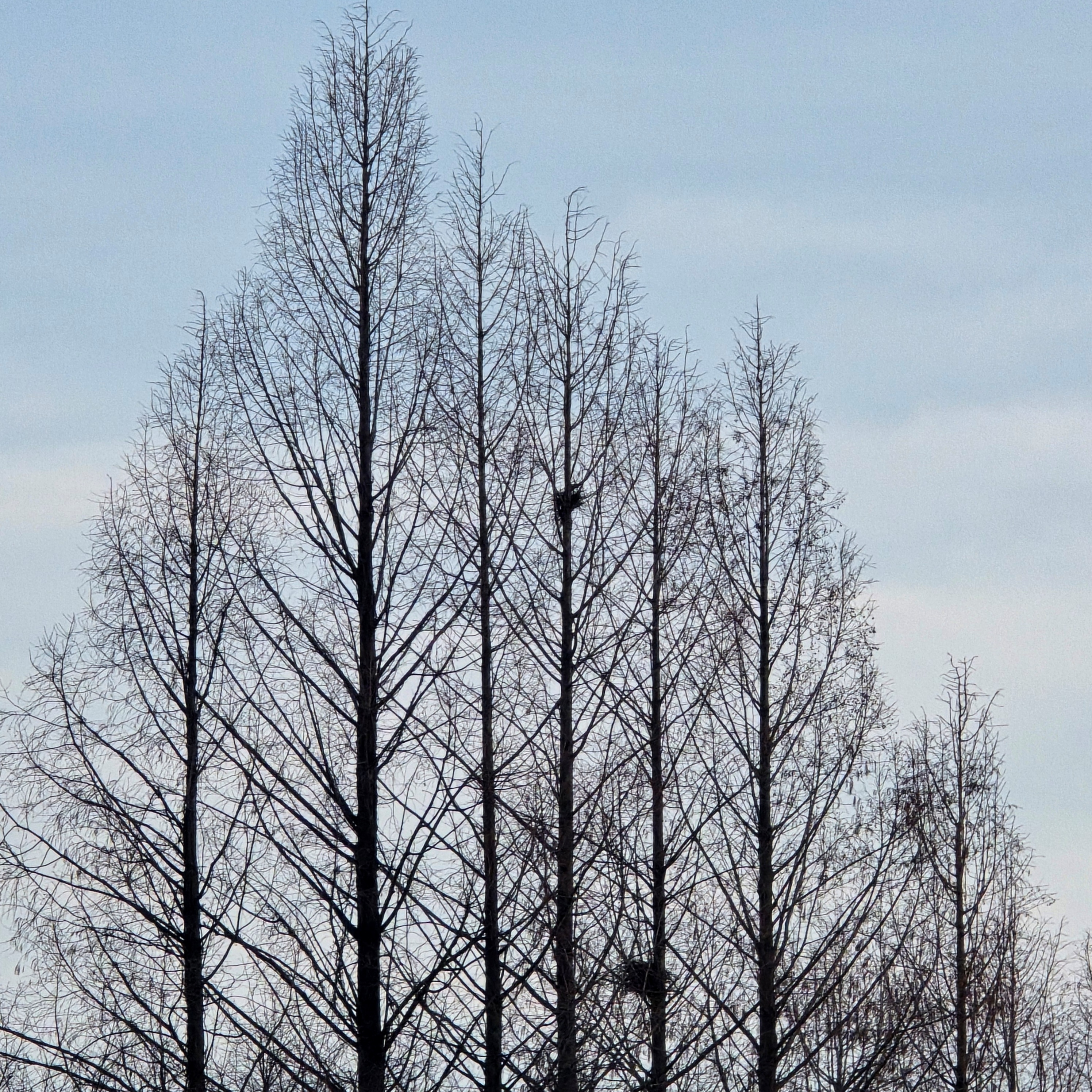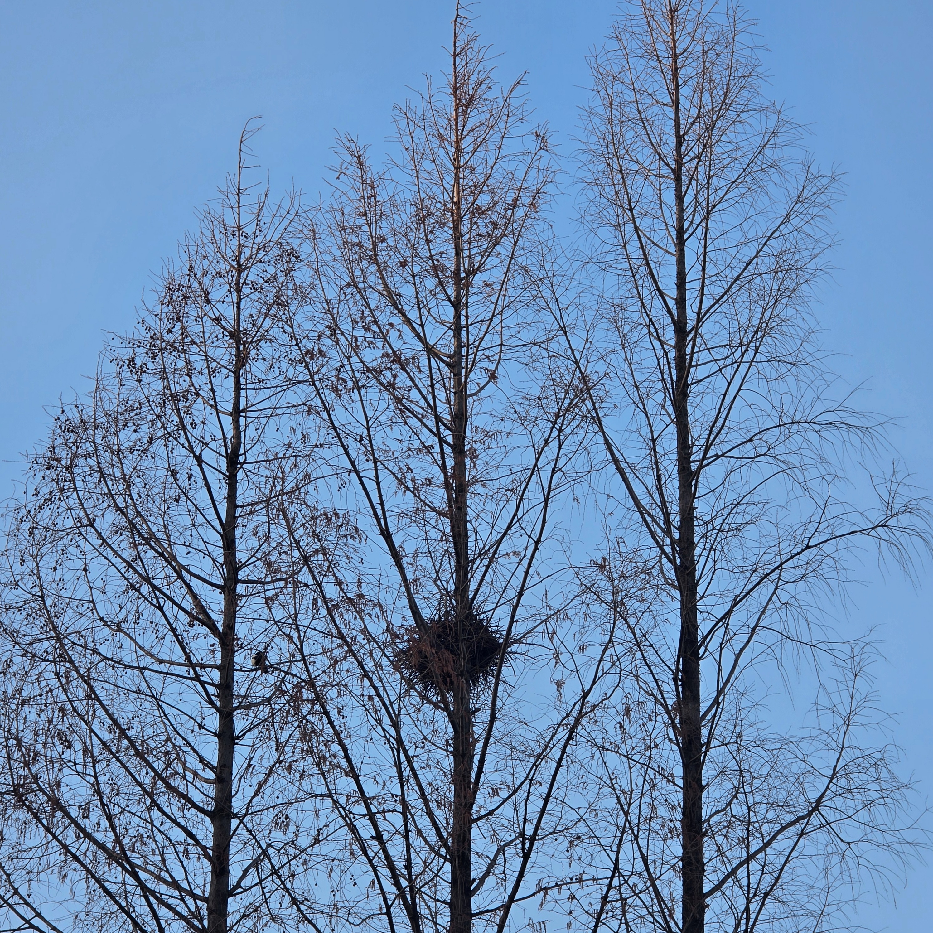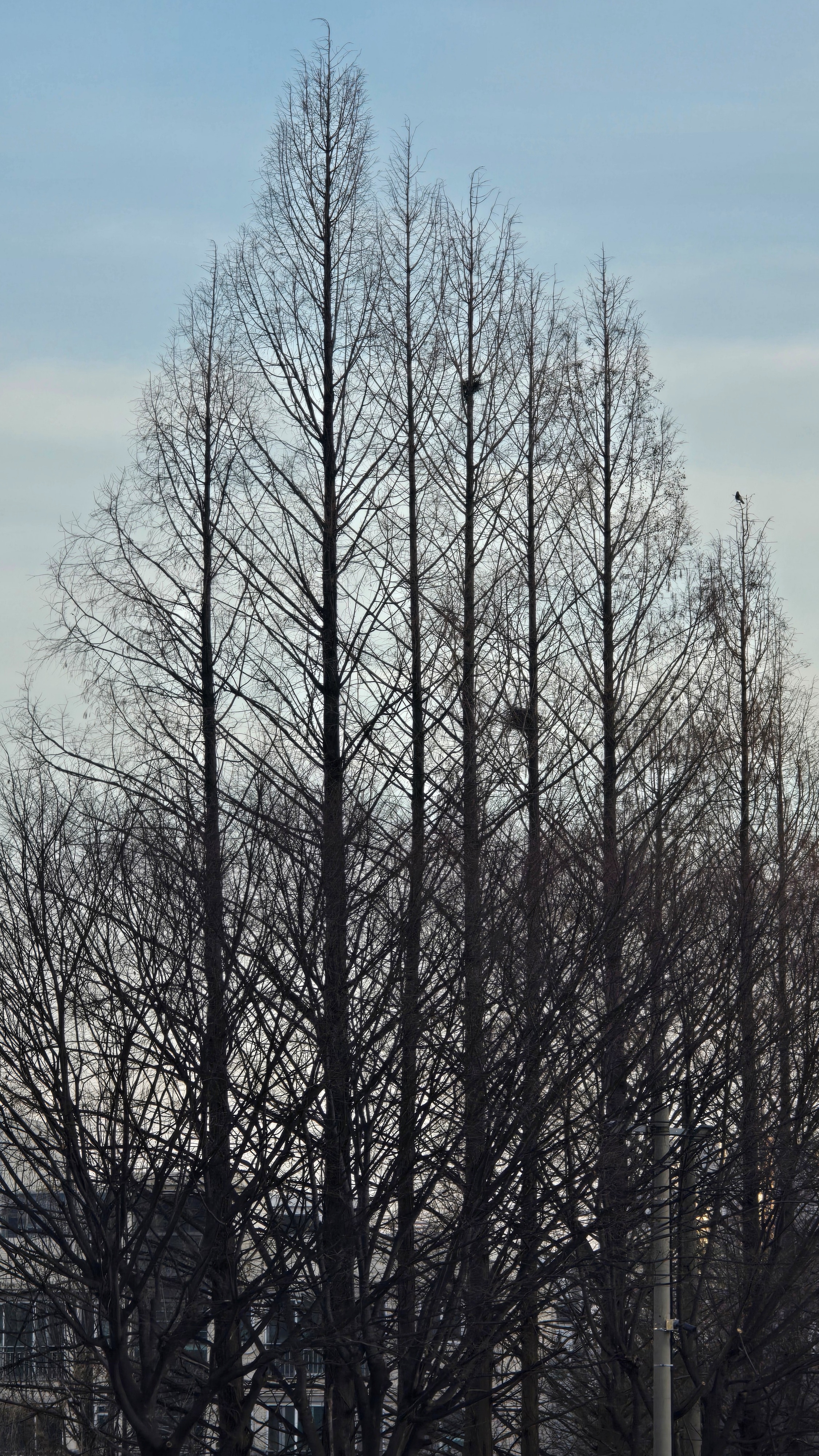 2026.02.16/ #도시기록 #안양 #메타쉐콰이어 #까치집/ 안양6동에는 중앙정부 공공기관들이 있었다, 주변 도로 가로수와 건물 경계에 메타쉨하이;어 나무들이 심어졌는데 마각및 재개발과정에서 대부분 베어져 없어지고 옛검역원 담장과 건물 경계에 일부 남아있으며 까치들의 놀이터이자 산란 장소인 둥지가 있다.