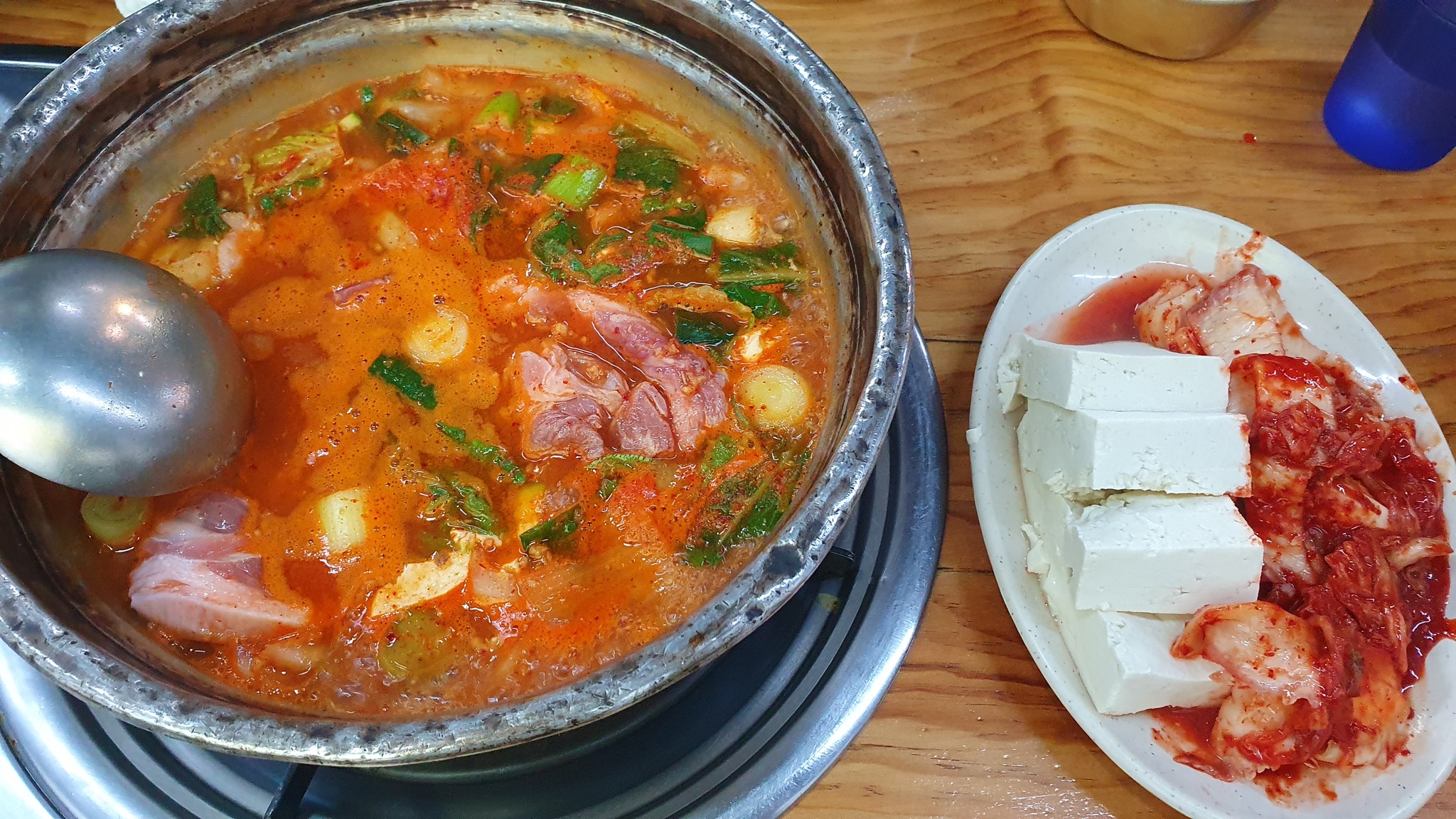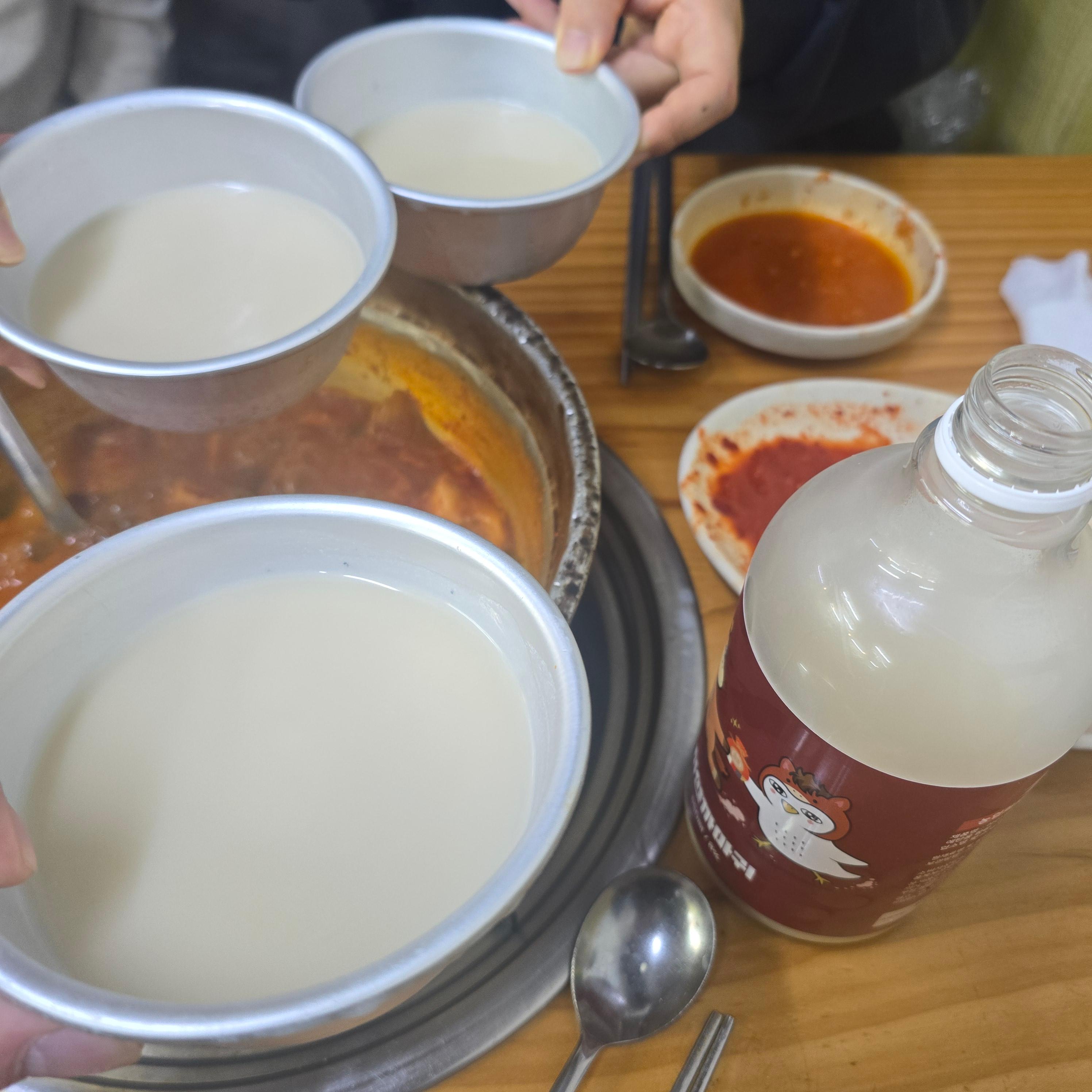 두부김치 한 입 먹으면 뭔가 한 잔 마셔야 할 것 같다. 막걸리 주문, 찌개를 먹을땐 소주 한잔으로 변경, 공깃밥은 따로 주문해야 하는데 그래도 인당 만 원이 안 되는 가성비 굿이다.