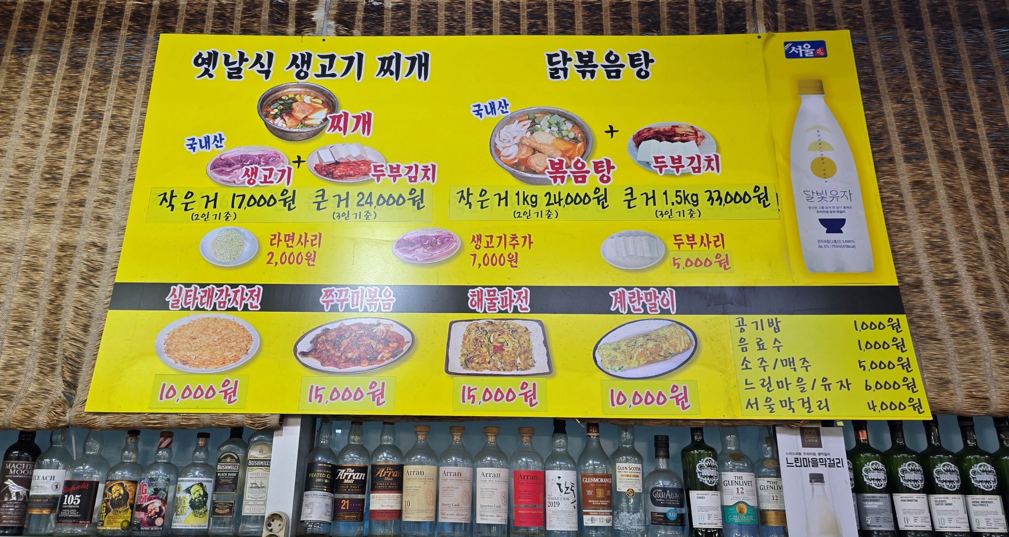 메인 메뉴는 옛날식 생고기 찌개, 닭볶음탕이고, 사이드로는 실타래감자전, 쭈꾸미볶음, 해물파전, 계란말이가 있다.