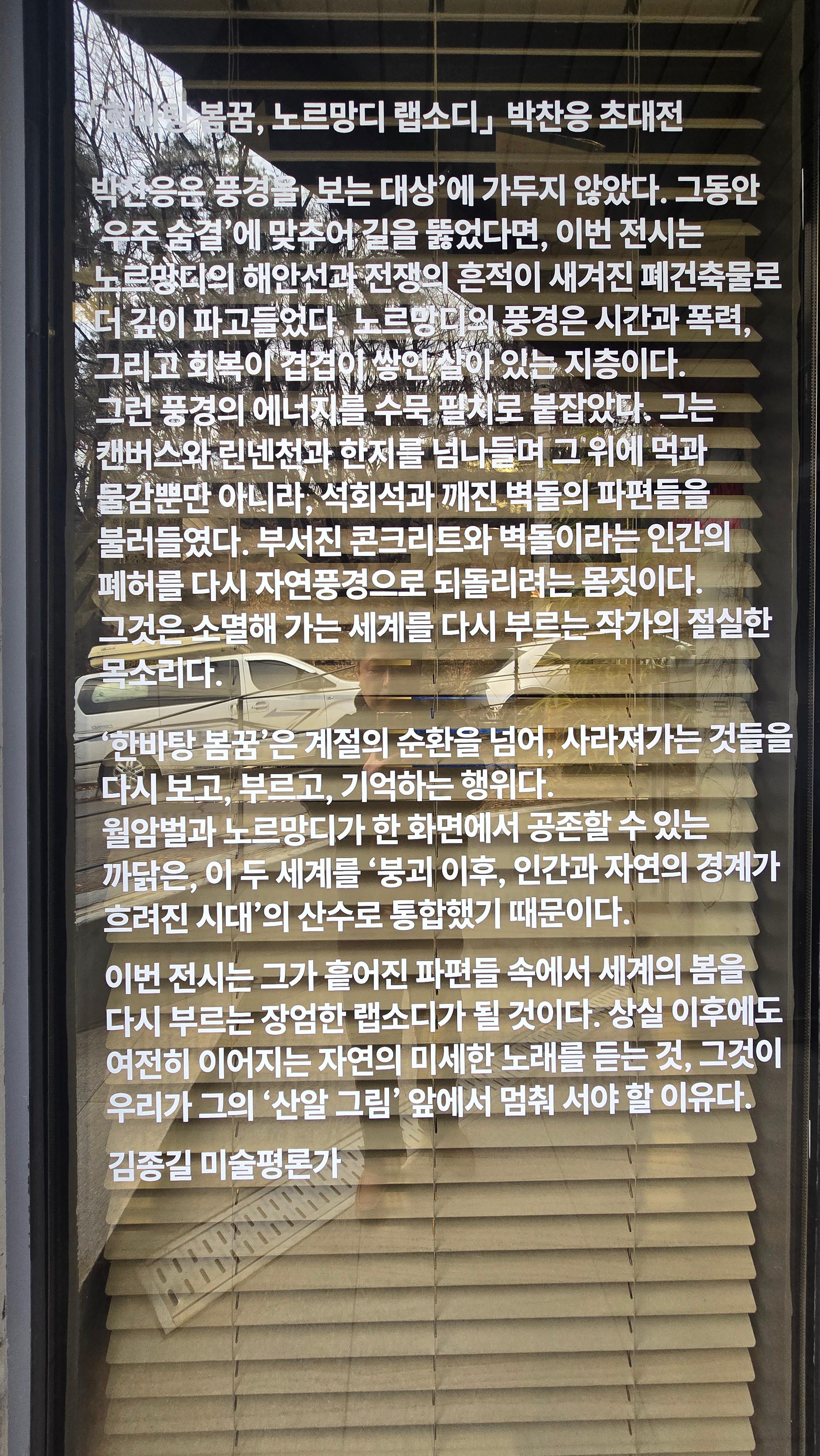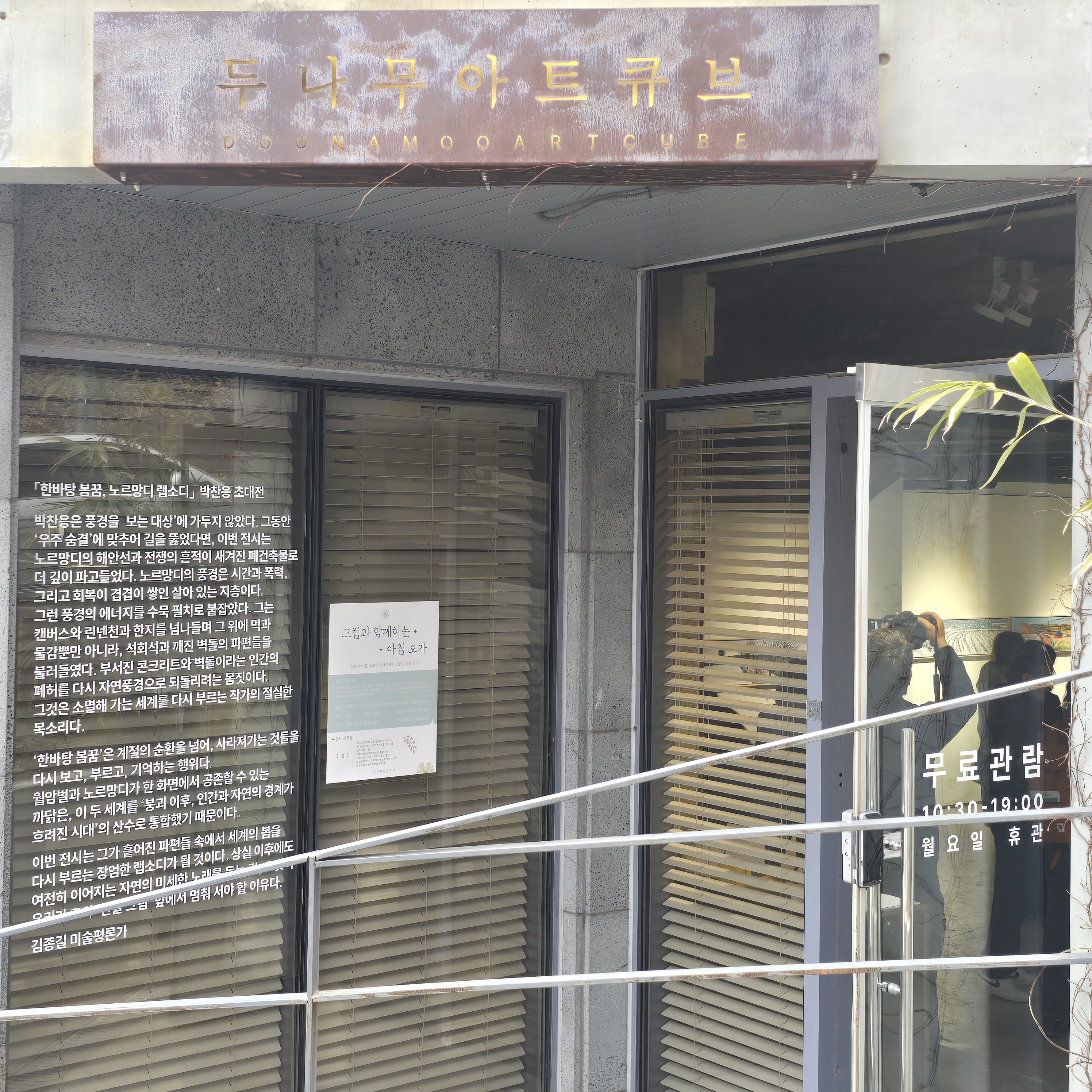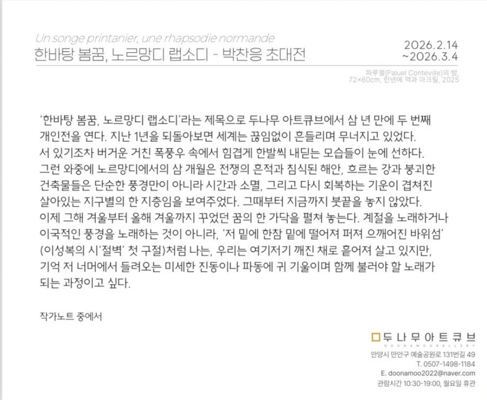 2026.02.25/ #도시기록 #안양 #갤러리 #두나무아트큐브 #안양예술공원 #전시공간/ 전시공간 불모지 안양에 2022년 겨울 새로 오픈한 두나무아트큐브. 건물주인 금영보 작가 마련한 공간. 현재 박찬응작가 초대전 "한바탕 봄꿈, 노르망디 햅소디" 열리고 있다.