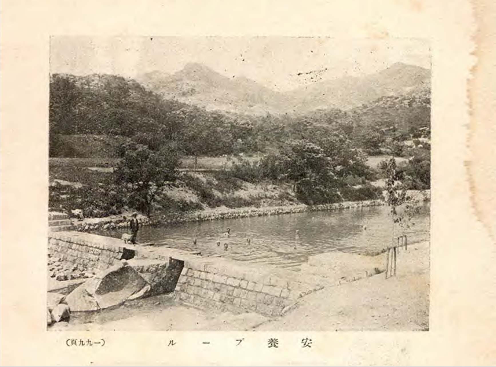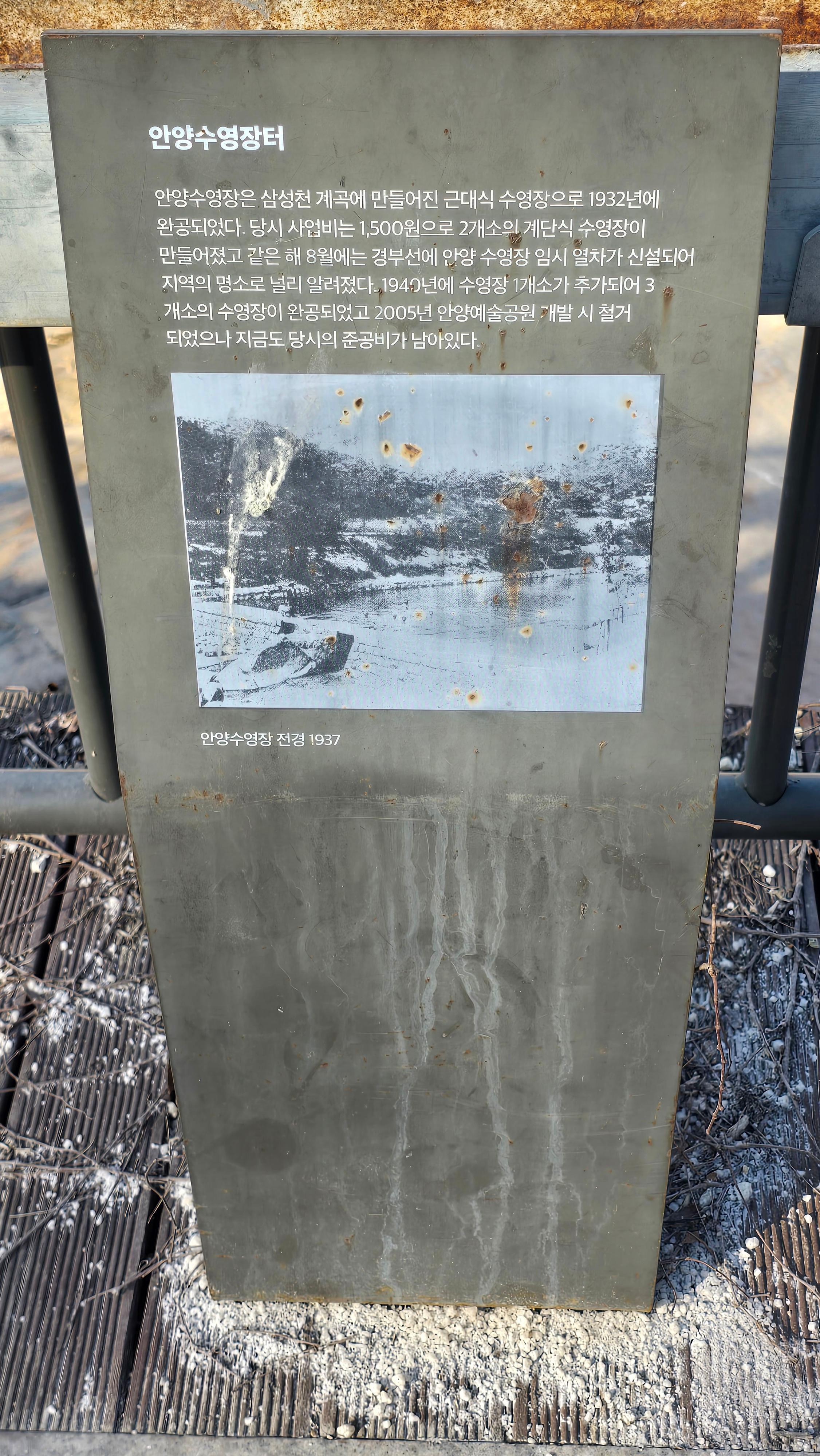 현재의 안양예술공원. 과거 안양 풀 또는 안양유원지로 불리우던 이곳에도 일제강점기 당시 계곡을 막아 풀장을 조성하고 하천 암반 초석에 한자와 일본어를 섞어 安養プ―ル(안양 풀 pool)'이라고 기록하고 일본 연호와 조성자 이름도 새겼다.