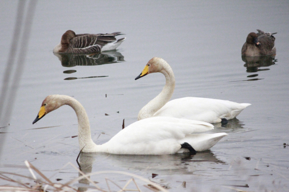 오리과에 속하는 대형 조류인 큰고니는 백조를 상징하는 우아한 흰색 깃털과 검은색 부리 끝에 이어지는 노란색 기부가 특징으로 주로 겨울철 우리나라를 찾는 대표적인 겨울 철새로 알려져 있다.