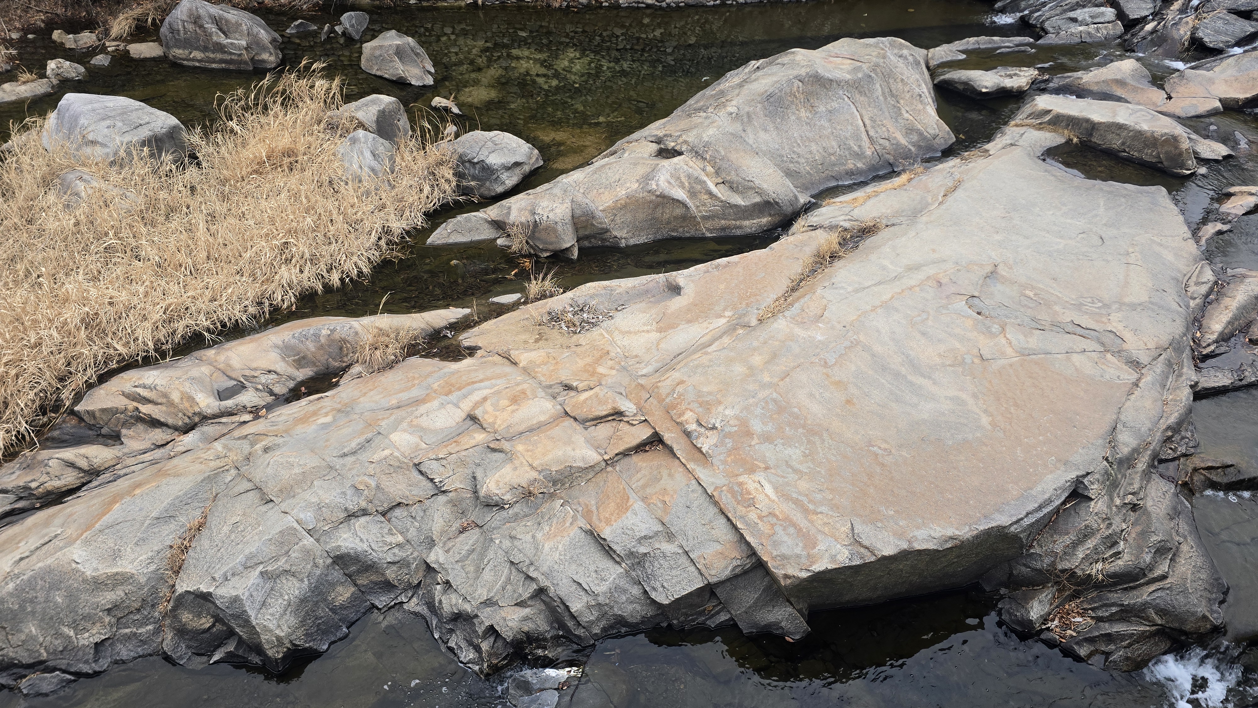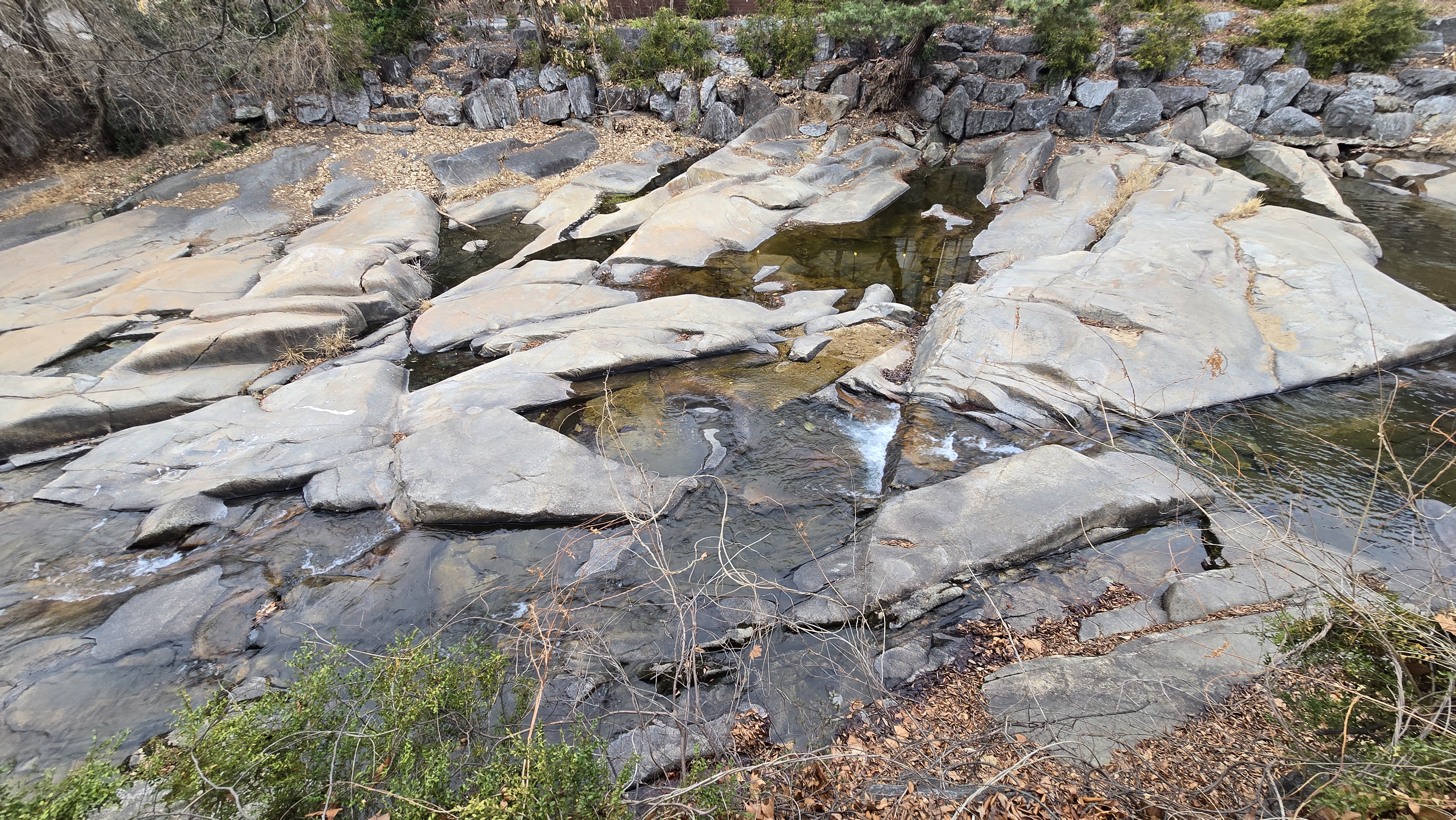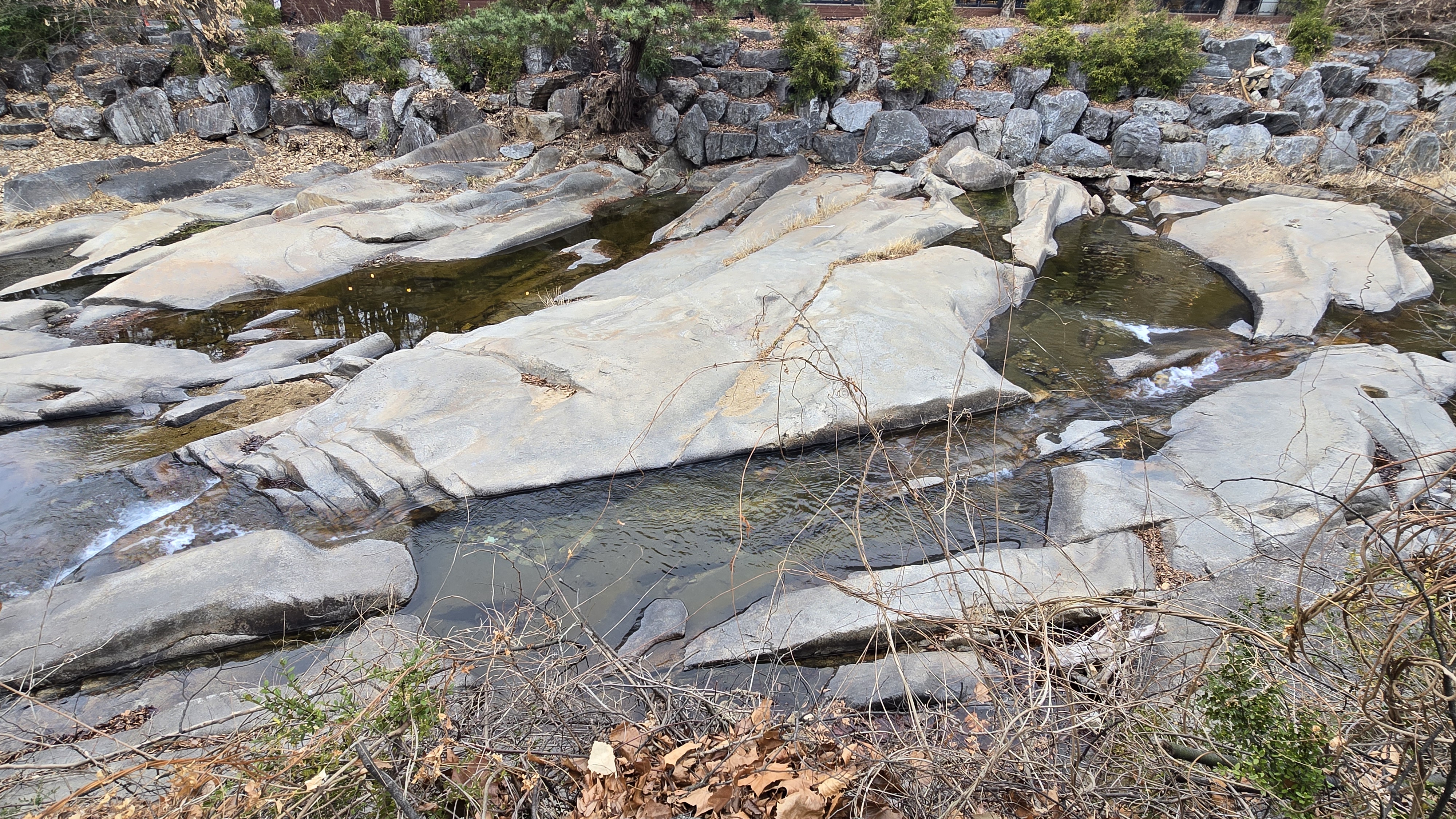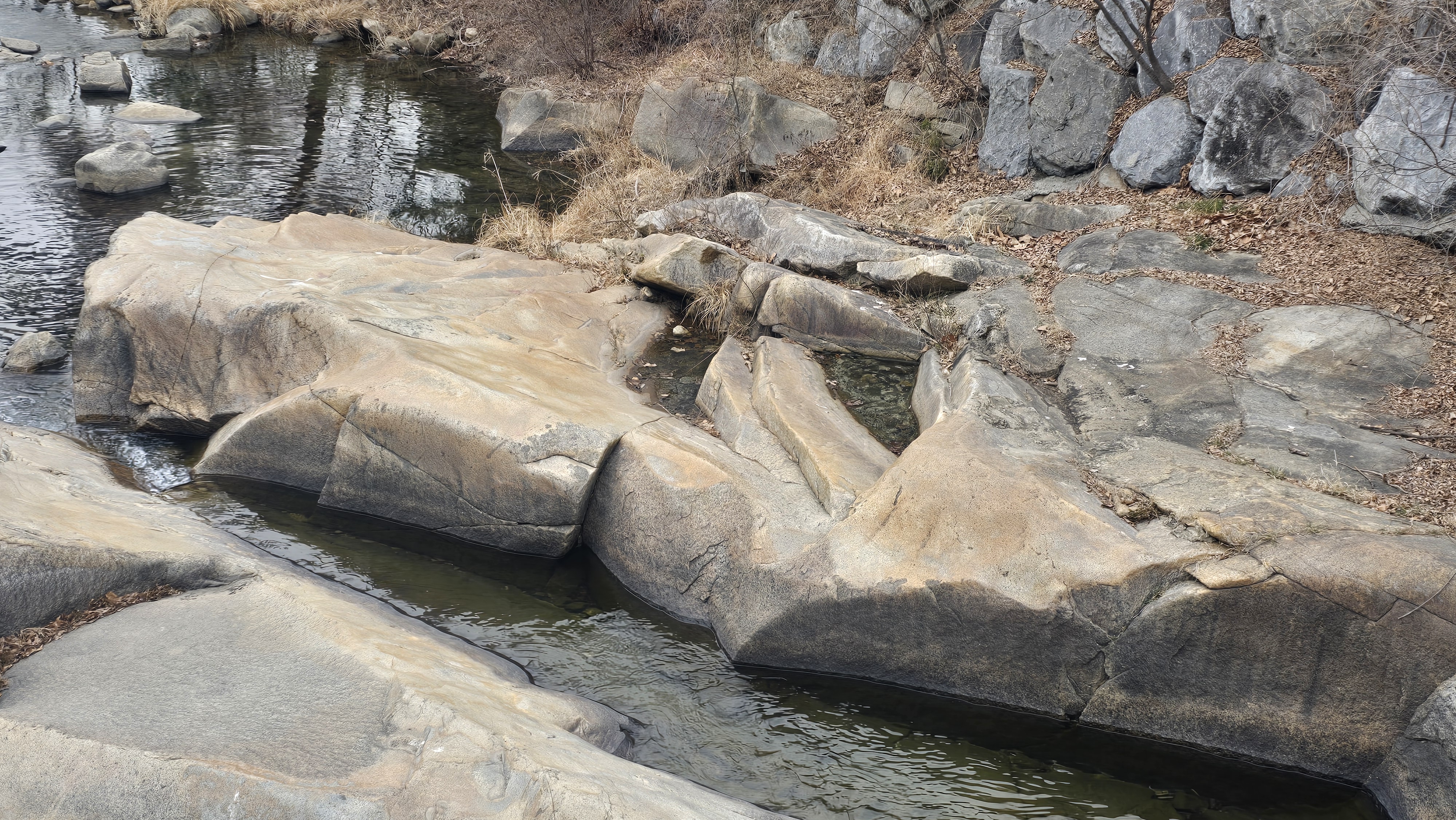 2026.03.14/ #도시기록 #안양 #삼성천 #너럭바위 #안양유원지/ 안양예술공원 삼성천 계곡에는 한가족이 둘러앉아도 될만큼 넓직하고 평탄한 멋진 암반들이 곳곳에 있다.
