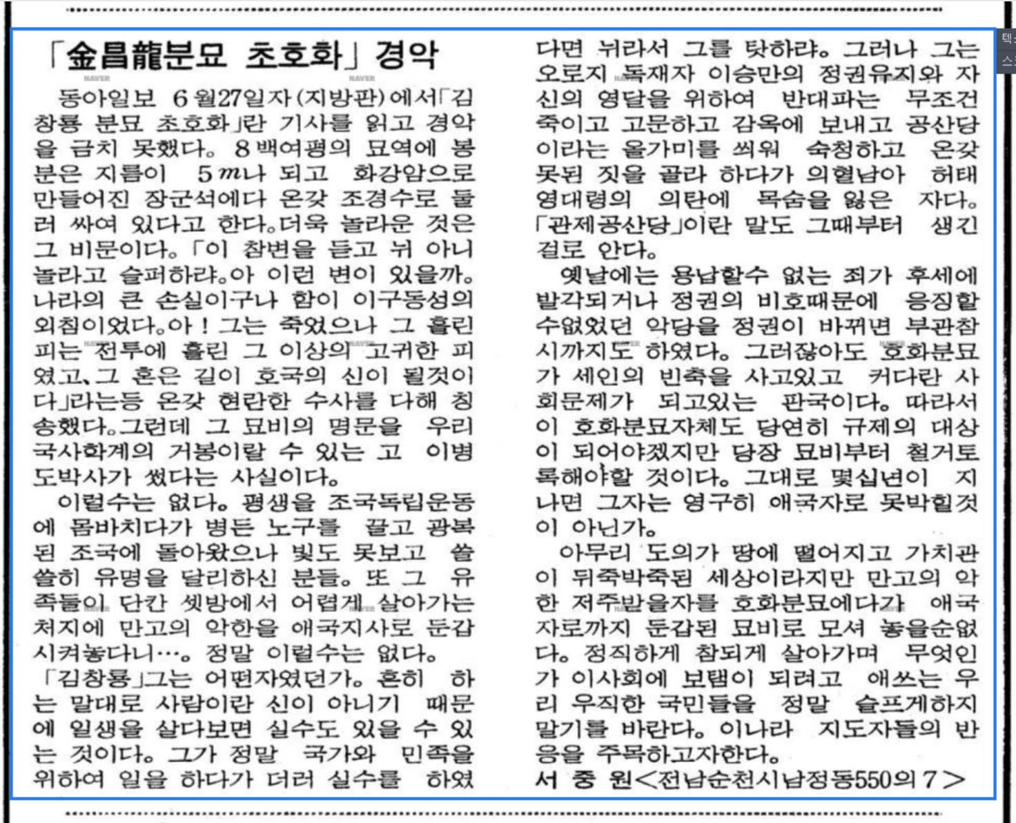 역사의 아이러니는 김창룡의 비명을 쓴 장본인이 역사학자 이병도 박사였다는 사실이 바로 그것이다. 이병도 박사가 누군가. 그는 '한국 사학계의 태두'이자 '실증사학의 대부'로 불렸던 인물이다. 그러나 그가 작성한 김창룡의 비명에는 '객관적인 역사적 사실'과 다른 내용으로 가득 차 있었다. 우선 「고 김창룡 중장 묘갈」이라는 제목의 비명 전문을 읽어보면 다음과 같다.