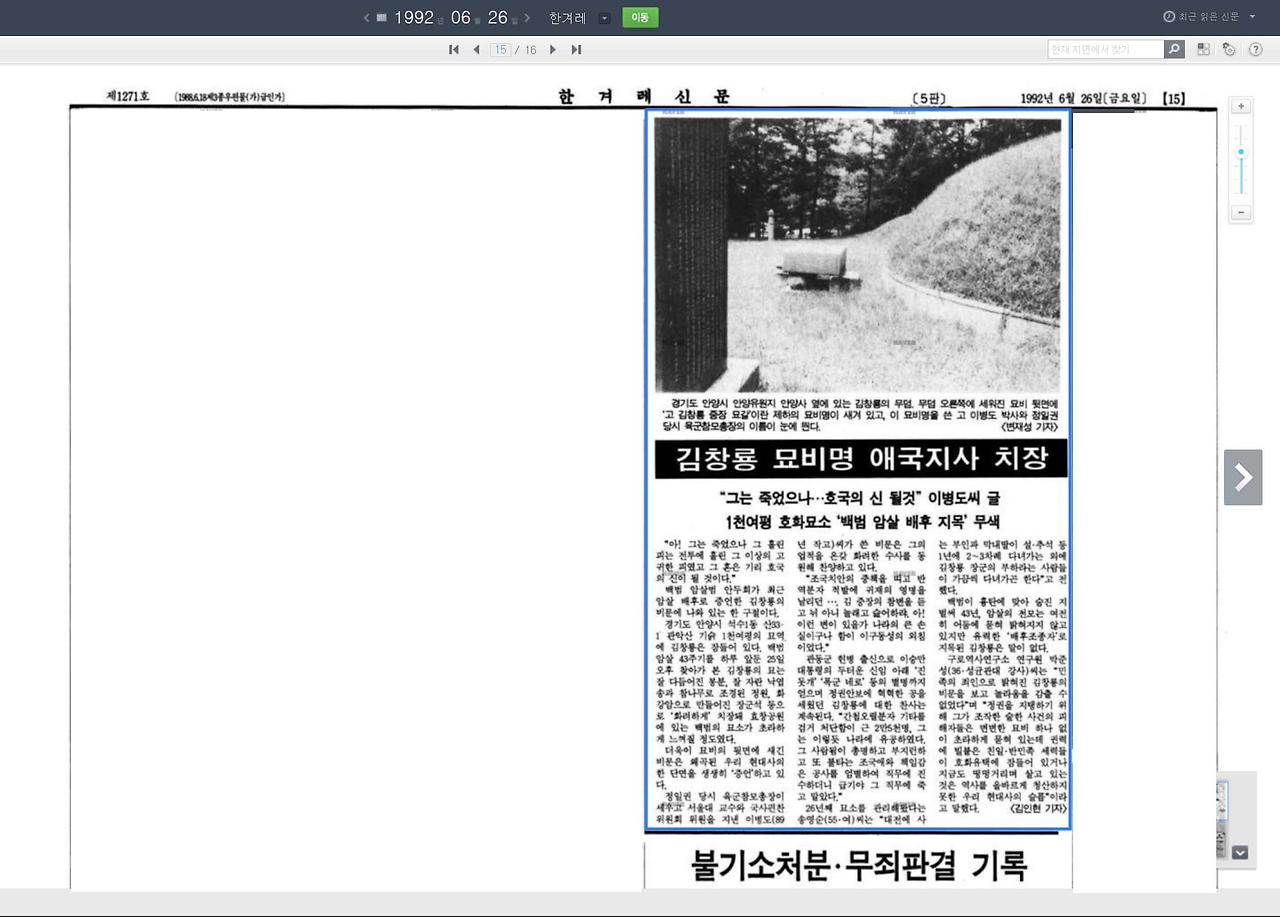 조국 치안의 중책을 띠고 반역분자 적발에 귀재의 영명을 날리던 고 육군특무부대장 김창룡 중장은 4289년(1956년―저자주) 1월 30일 출근 도중에 돌연 괴한의 저격을 입어 불행히도 순직하였다. 이 참변을 듣고 뉘 아니 놀래고 슲어 하랴. 아! 이런 변이 있을가. 나라의 큰 손실이구나 함이 이구동성의 외침이었다. 그는 본시 영흥 출생으로 80년(1947년)에 육사를 마치고 그후 육군본부 정보국 방첩과장에 취임하여 이래 누차 숙군을 단행하여 군의 육성 발전에 이바지하였다. 특히 동난 중에는 군검경합동수사본부장으로 맹활동을 개시하여 간첩오렬 부역자 기타를 검거 처단함이 근 2만5천명 전시 방첩의 특수 임무를 달성하였다. 84년(1951년) 육군특무부대장에 부임하여서는 더욱 헌신적 노력과 탁월한 지휘로써 국가 및 군사 안전 보장에 기여하였다. 그 중요한 적발만으로도 85년(1952년) 대통령 암살 음모의 김시현 사건 87년(1954년) 남도부 등의 대남 유격대 사건 88년(1955년) 대통령 암살 음모자 김재호 일당을 미연에 일망타진한 그것이다. 그는 이렇듯 나라에 유공하였다. 그 사람됨이 총명하고 부지런하고 또 불타는 조국애와 책임감은 공사를 엄별하여 직무에 진수하더니 급기야 그 직무에 죽고 말았다. 아- 그는 죽었으나 그 흘린 피는 전투에 흘린 그 이상의 고귀한 피였고 그 혼은 기리 호국의 신이 될 것이다. 그의 생년은 단기 4253년(1920년) 11월 23일. 형년은 37세. 순직과 동시에 육군 중장에 승진되었다.