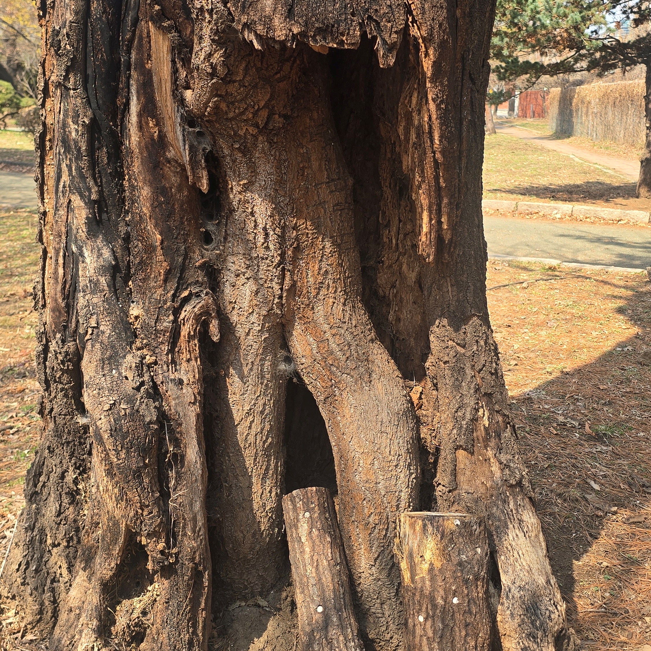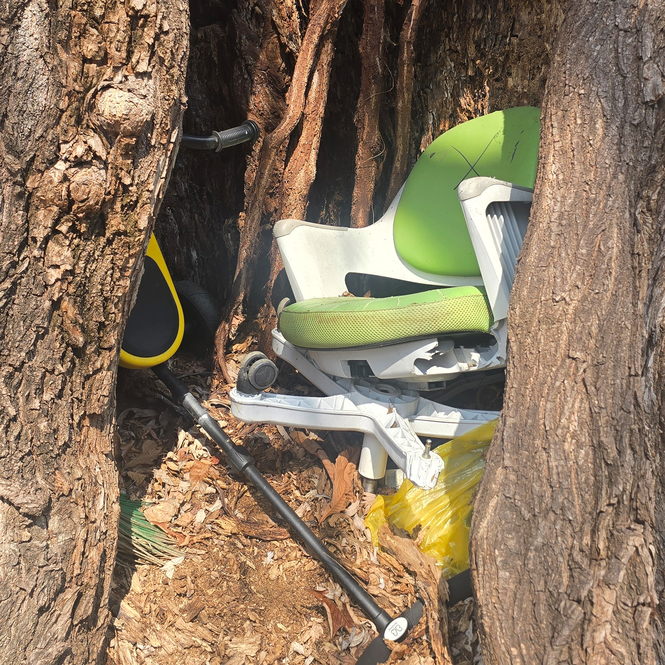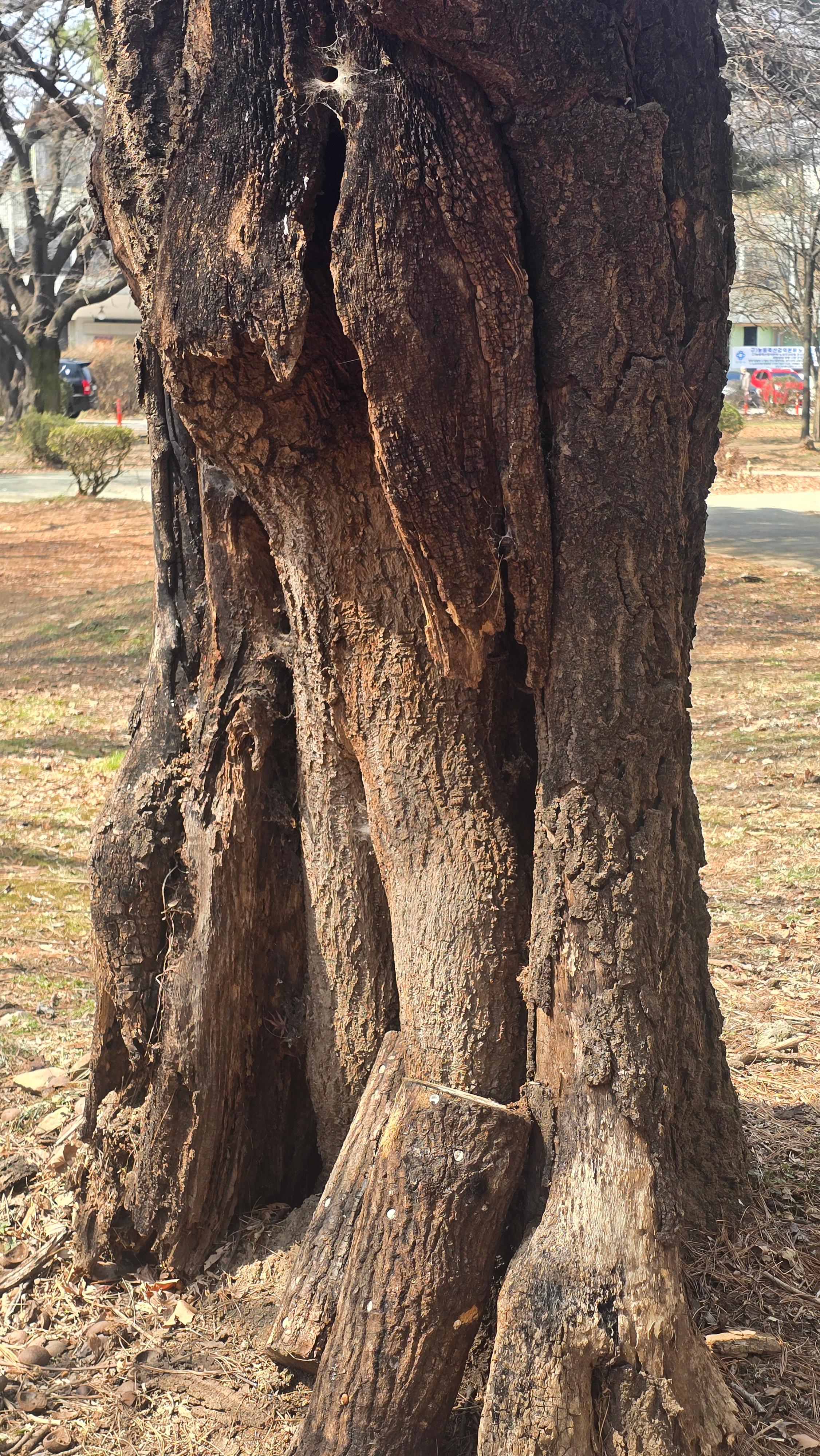 더욱이 안타까운 것은 구멍속이 썩어가고 있으나 치료는 커녕 관리 누군가 페기물과 쓰레기를 버려 나무 구멍 보기가 미안할 정도다. 에전에 작은 쓰레기는 끄집어내기도 했으나 지금은 폐기물이 가득하다. 정원 관리는 누가? 책임은 어디서?