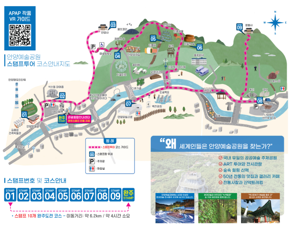 안양예술공원 스탬프 투어는 9개 지점 완주 후 관광종합안내센터에서 왼주 스탬프를 찍은후 안양시 관광기념품(마그넷, 뱃지 중 선택)을 받는다. 코스는 안양박물관 → 석수동 마애종 → 안양사 → 정령의 숲 → 전망대 → 비밀의 숲 → 안양파빌리온 → 나무 위의 선으로 된 집 → 염불사 → 관광종합안내센터로 돓아보며 이동거리는 약 6.2Km로 약 3시간 소요된다.