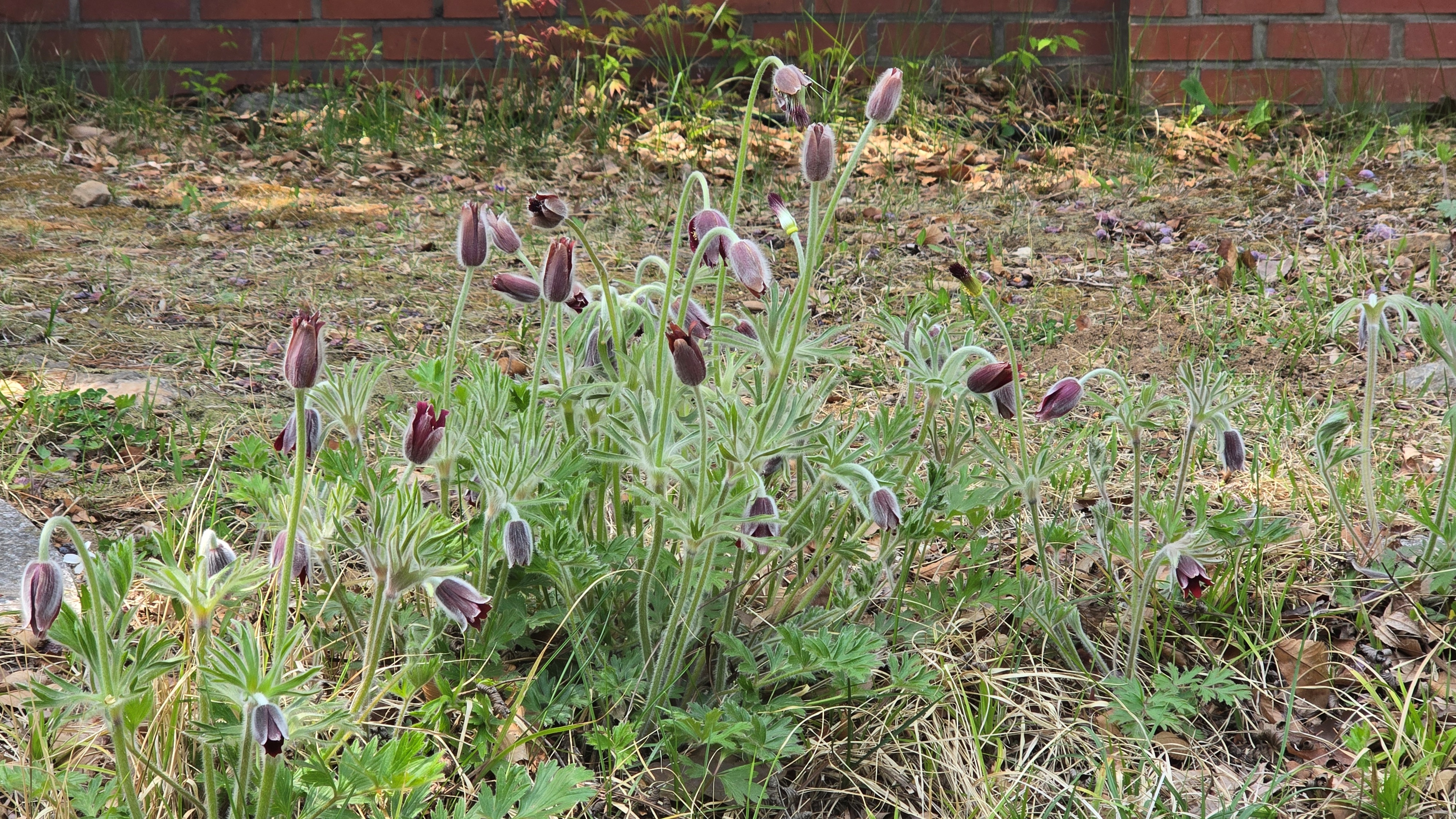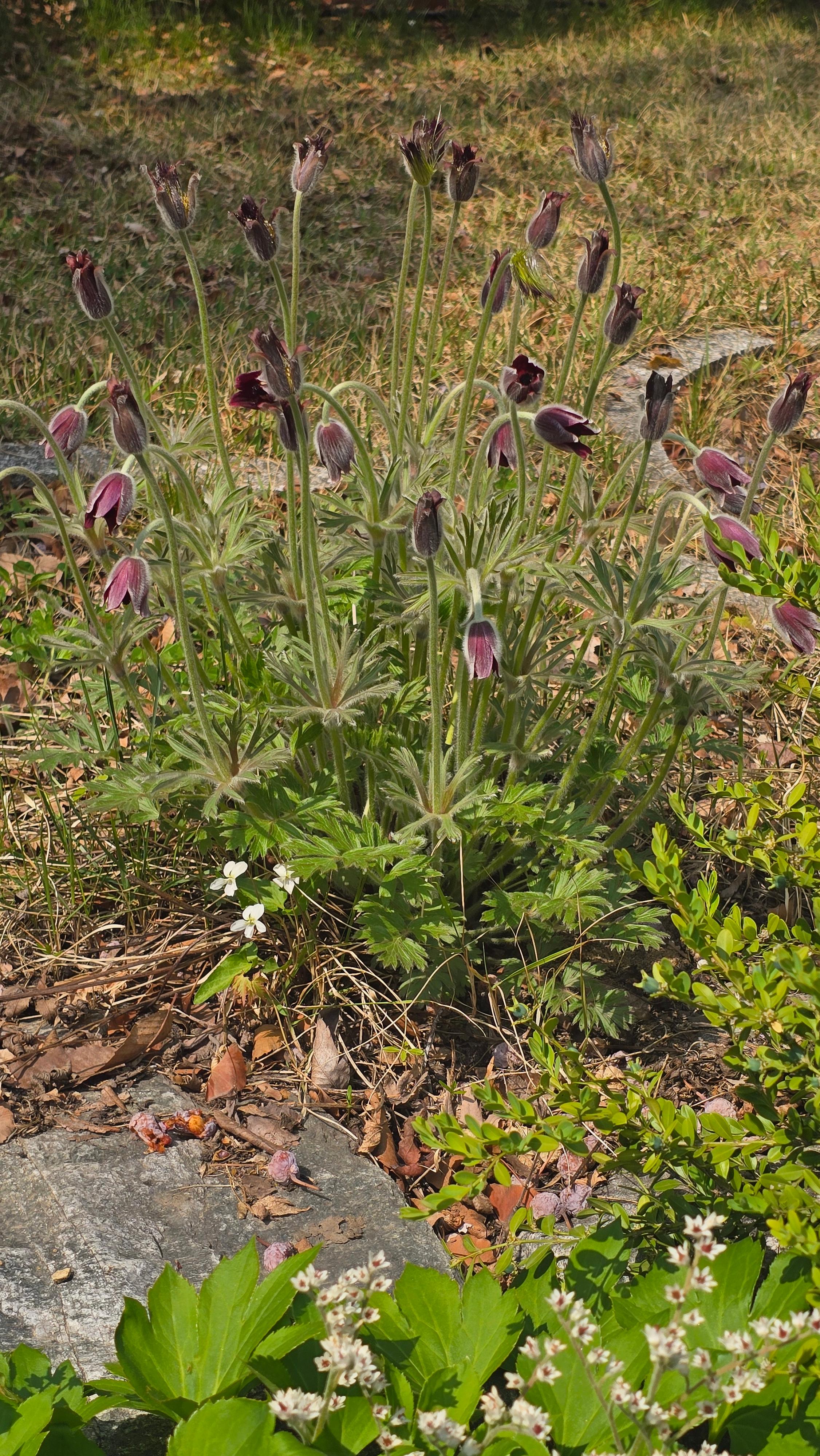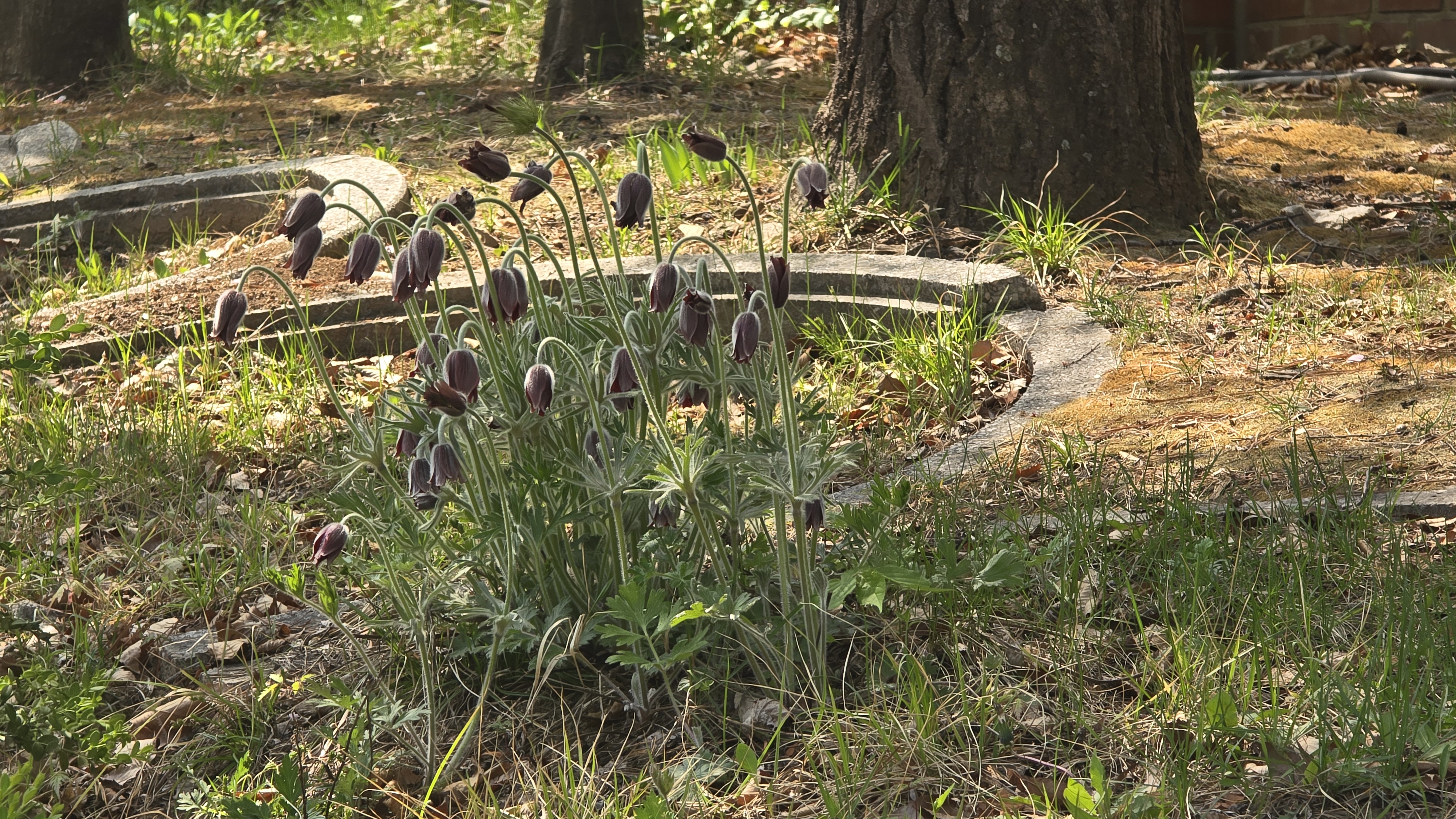 2026.04.15/ #도시기록 #생태 #안양 #할미꽃 #야생화/ 안양6동 안양세무서 뒷 뜨락에 자리한 할미꽃 군락지. 꽃 피어난 면적이 예전보다 더 넓어졌다.