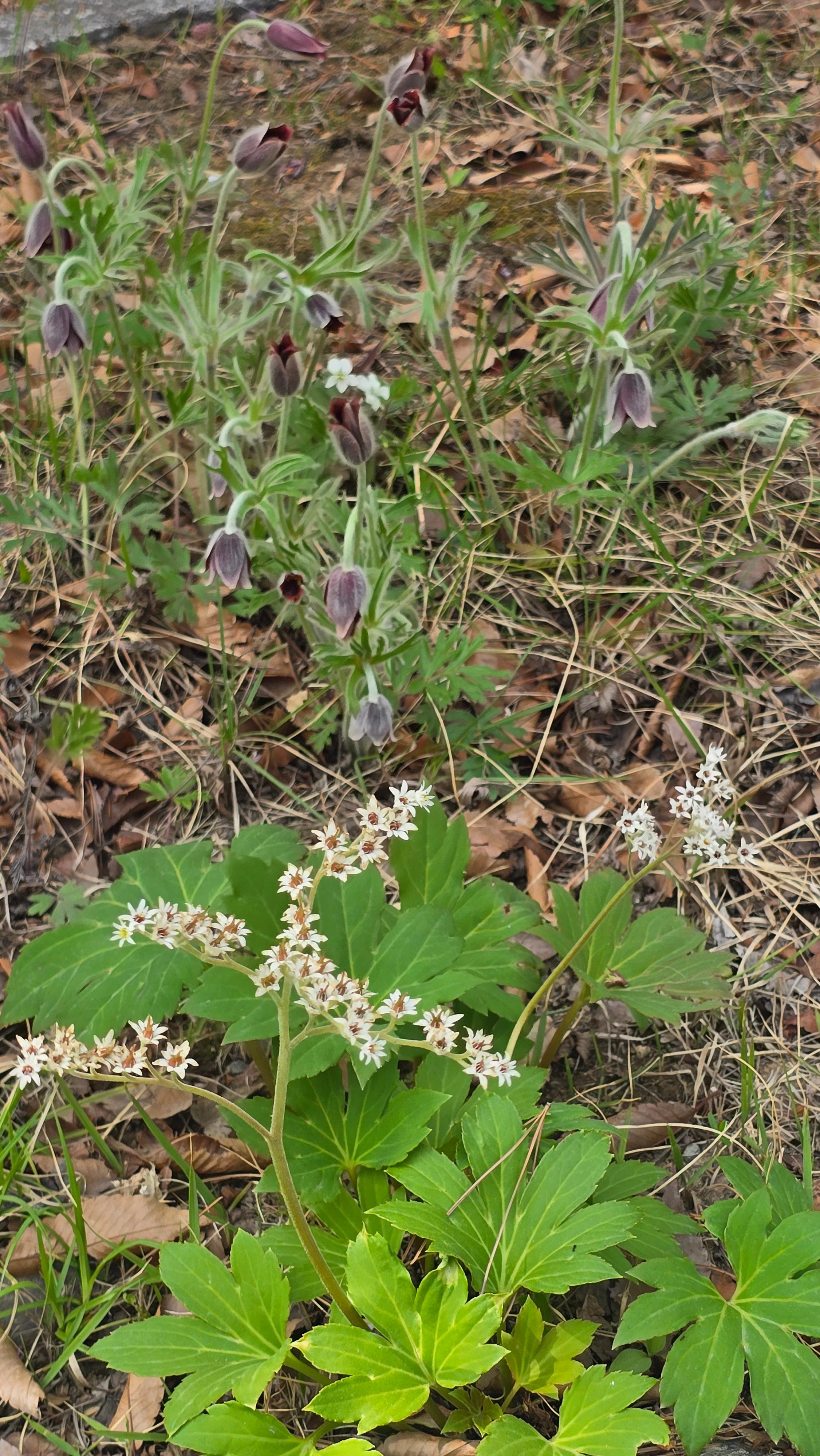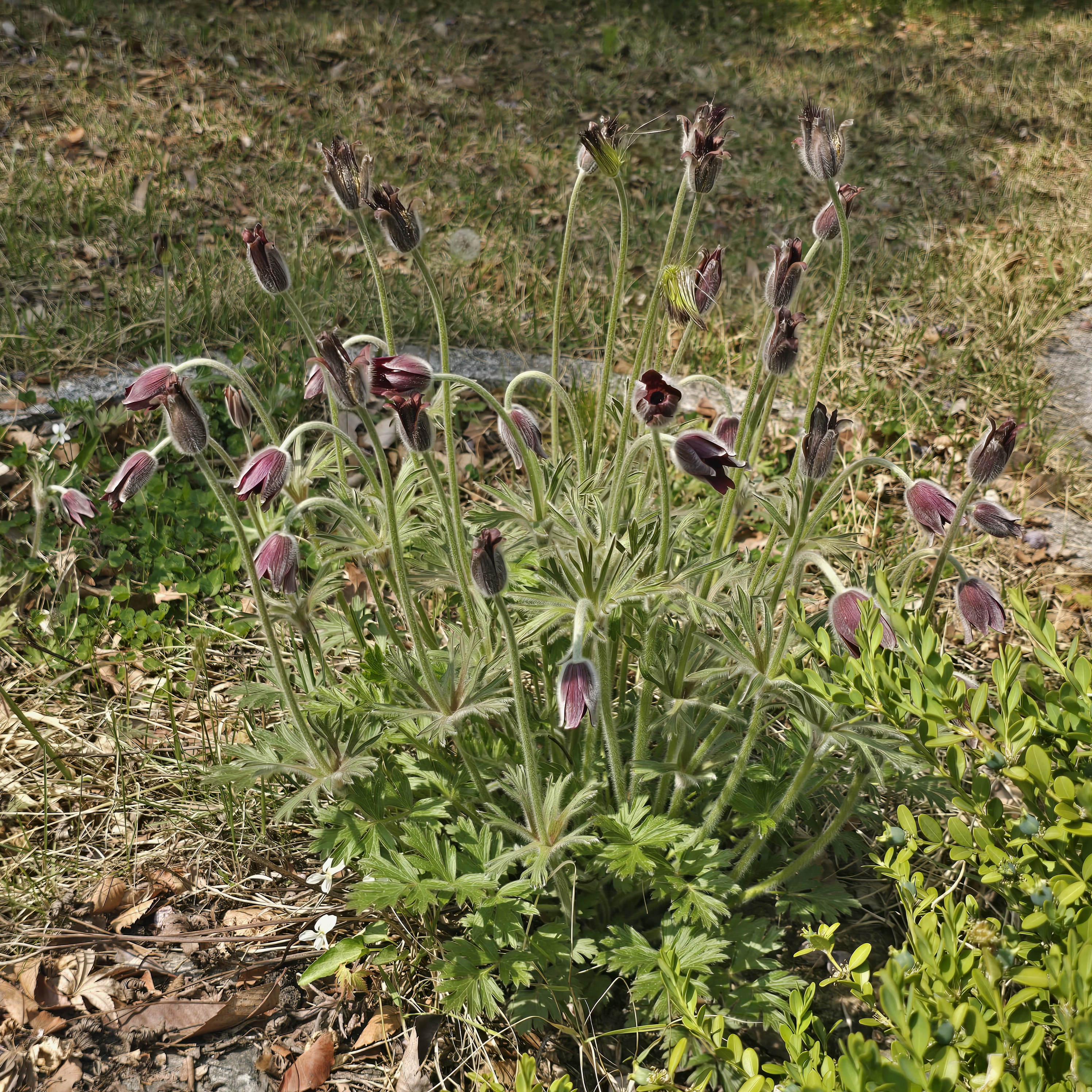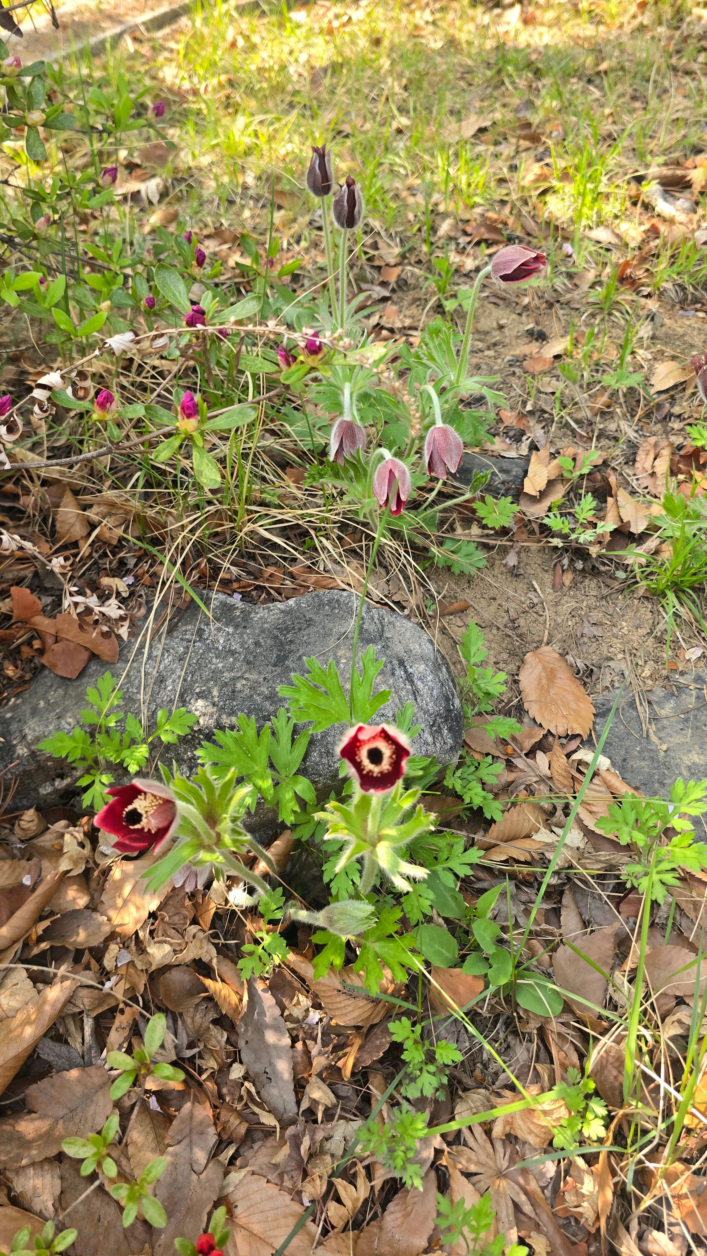 2026.04.15/ #도시기록 #생태 #안양 #할미꽃 #야생화/ 안양6동 안양세무서 뒷 뜨락에 자리한 할미꽃 군락지. 꽃 피어난 면적이 예전보다 더 넓어졌다.