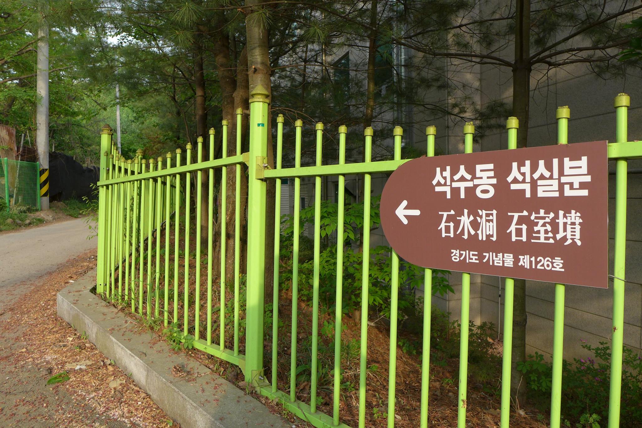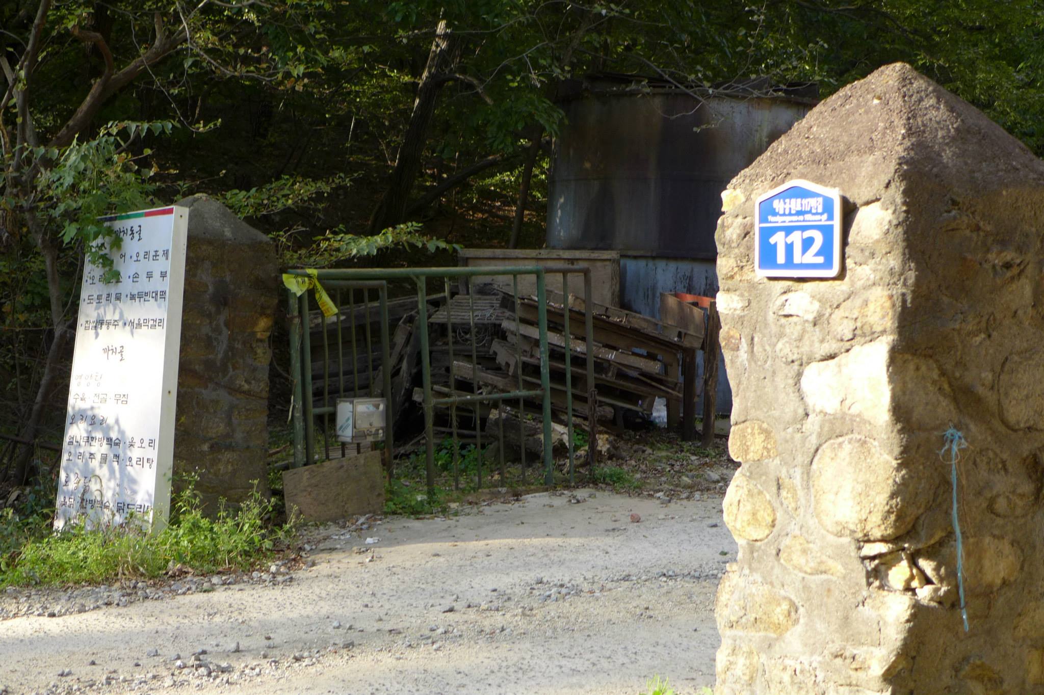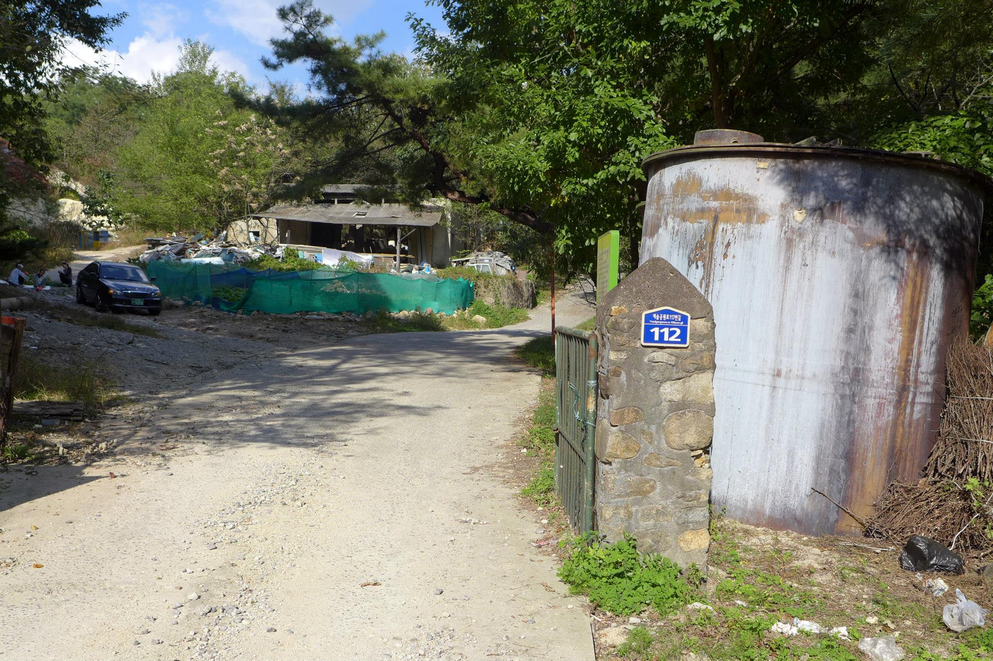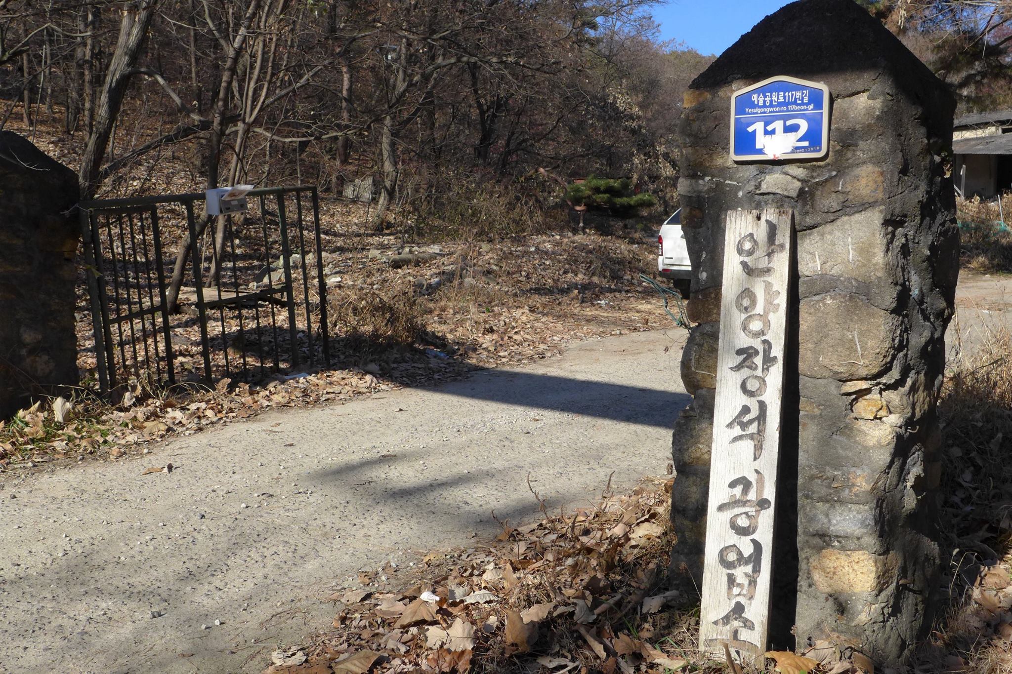 안양예술공원 입구 주차장 뒷쪽의 안양의집(보육원)에서 왼쪽으로 난 안양노인전문요양시설로 가는 길(까치골)로 접어 들어 새소리가 들리는 산길로 15분여를 올라가면 예술공원로 117번길 112(지번 석수1동 456-7)이라 적힌 녹슨 대문이 보인다.